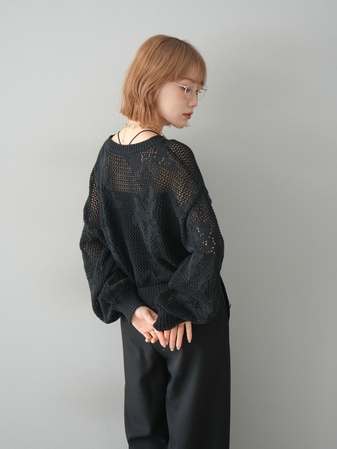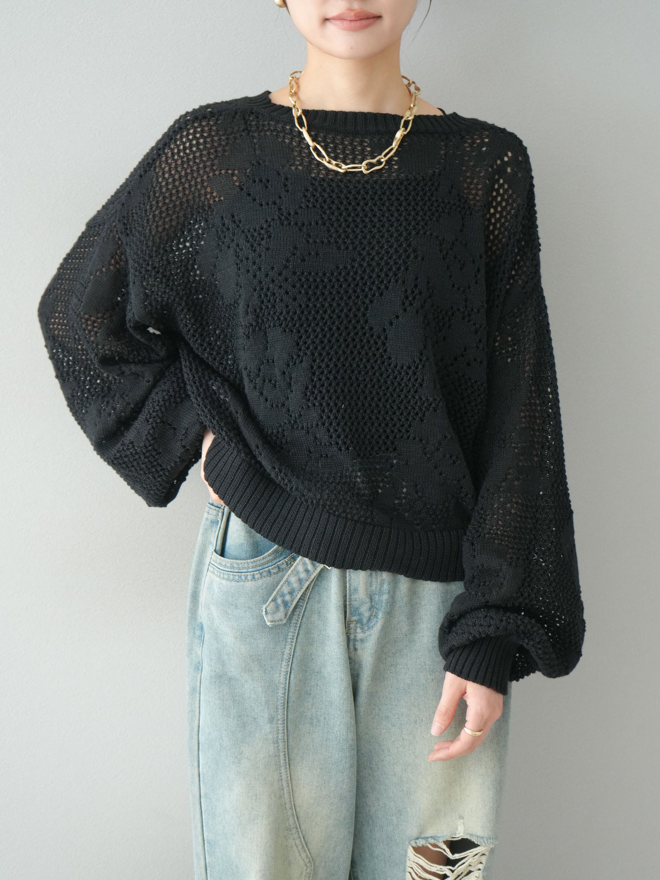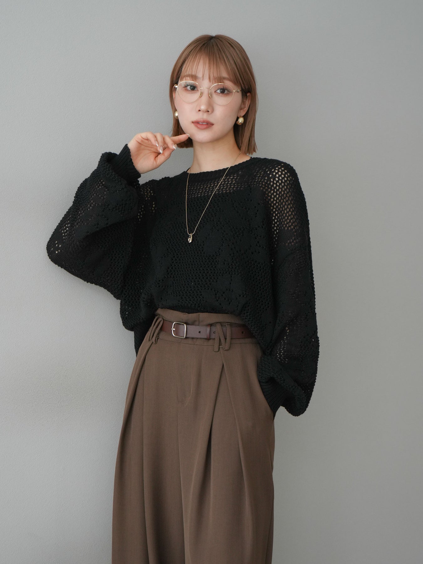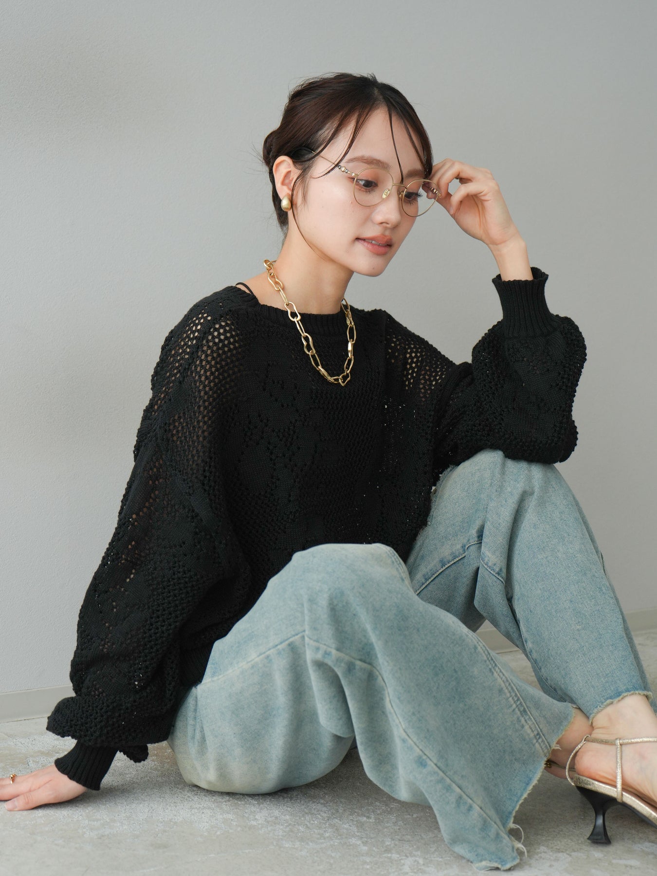 トレンド感のある透かし編みデザインが魅力のニットプルオーバー。ゆったりとしたシルエットとボリュームスリーブが女性らしい抜け感を演出。ほどよい肌見せが叶い、シーズンレスで活躍する一着。デニムやスカートと合わせて、幅広いコーディネートが楽しめます。 ※ボトムス、キャミソール(インナー)以外の商品は一律でインナーは付属していません。
