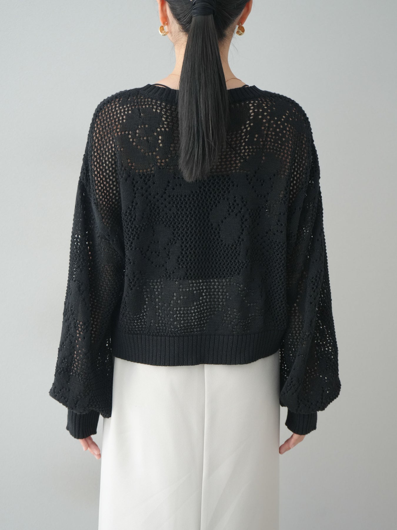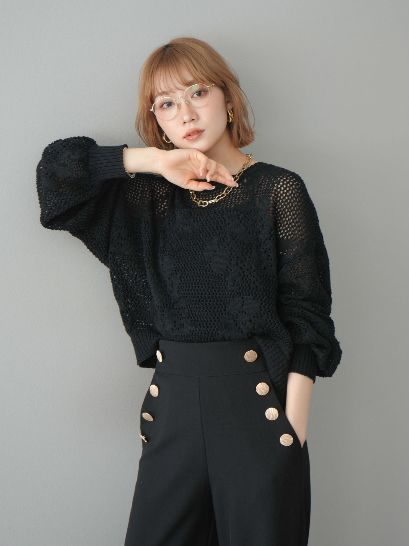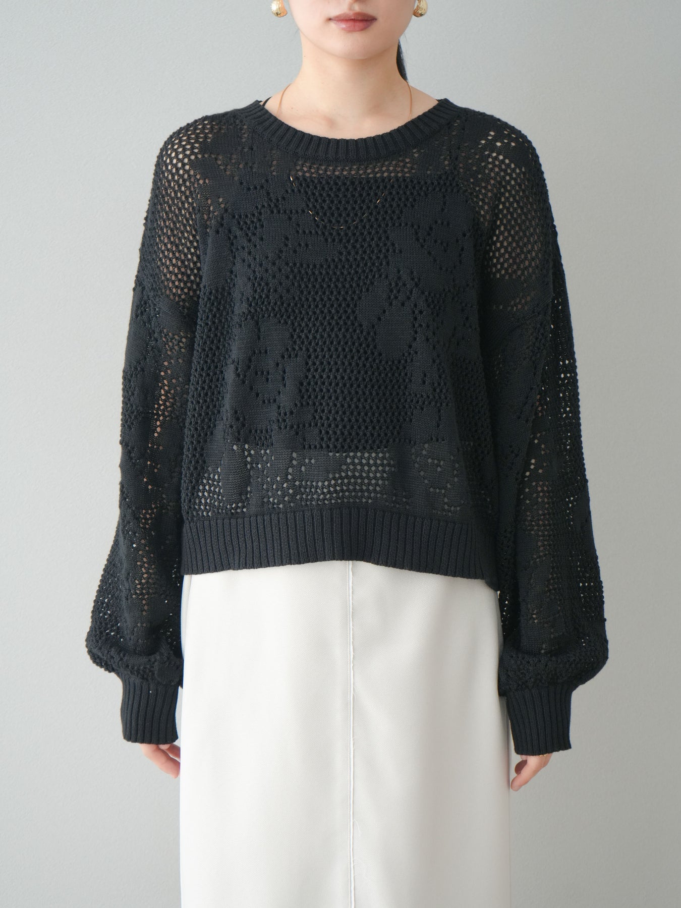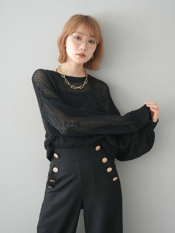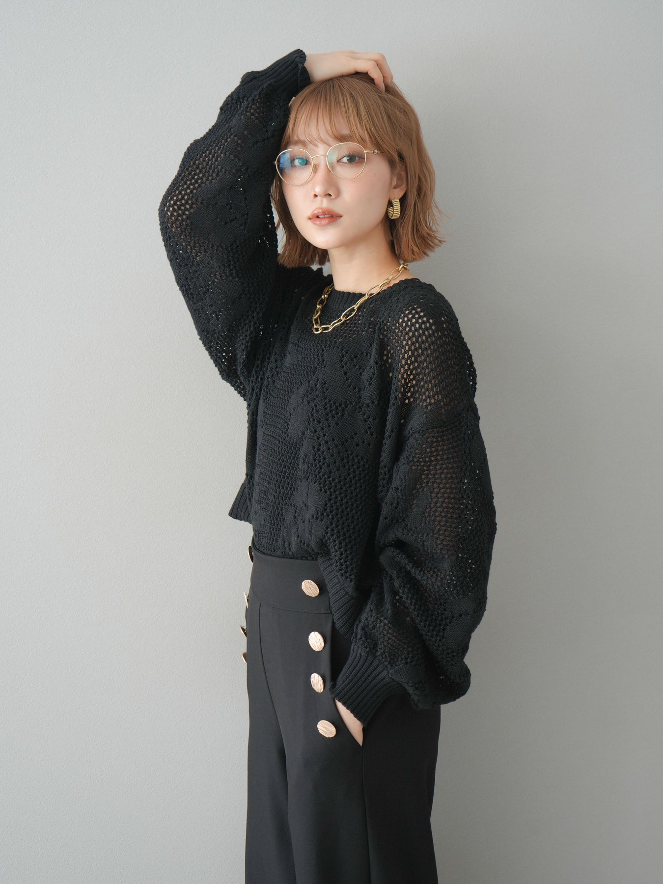 トレンド感のある透かし編みデザインが魅力のニットプルオーバー。ゆったりとしたシルエットとボリュームスリーブが女性らしい抜け感を演出。ほどよい肌見せが叶い、シーズンレスで活躍する一着。デニムやスカートと合わせて、幅広いコーディネートが楽しめます。 ※ボトムス、キャミソール(インナー)以外の商品は一律でインナーは付属していません。