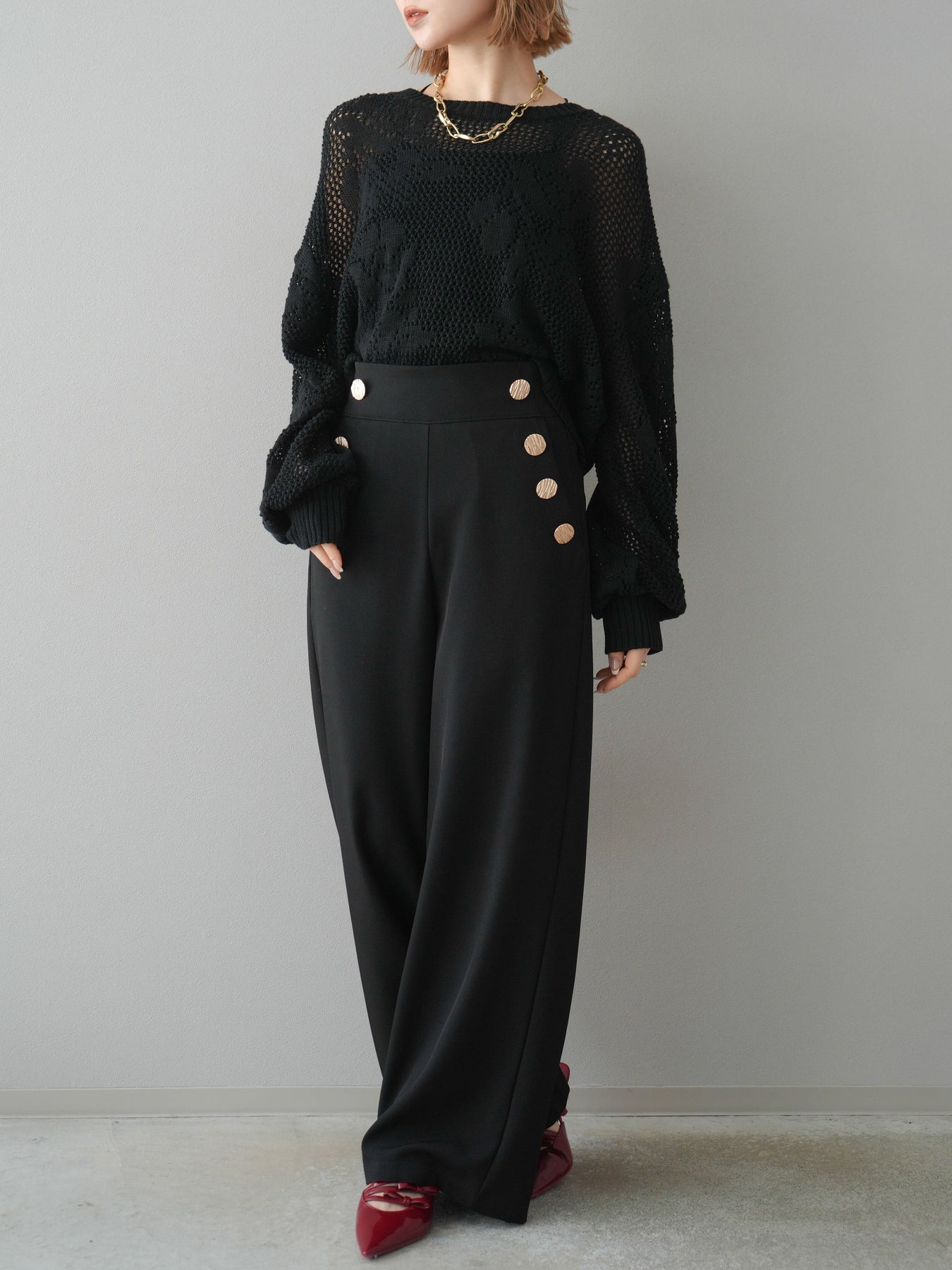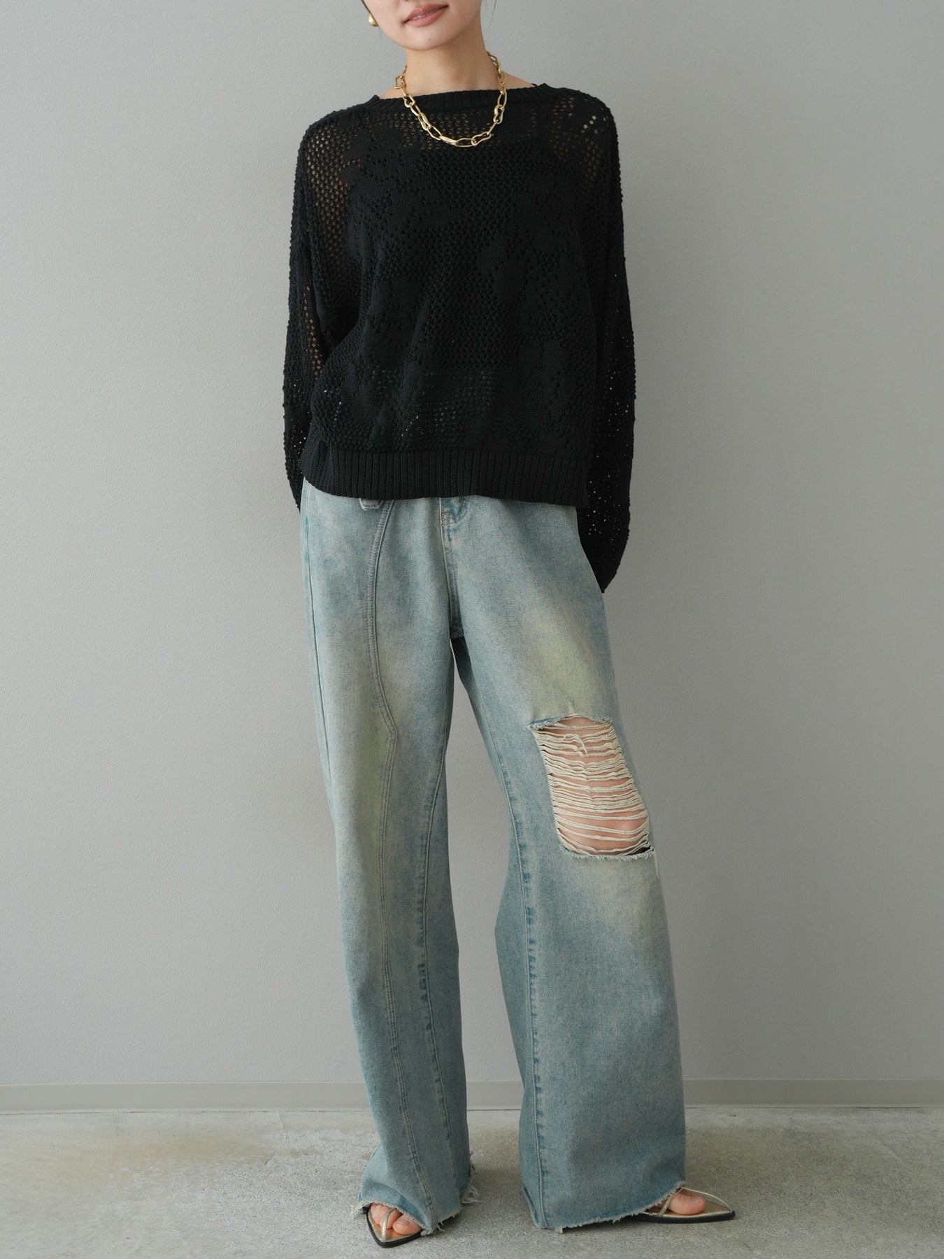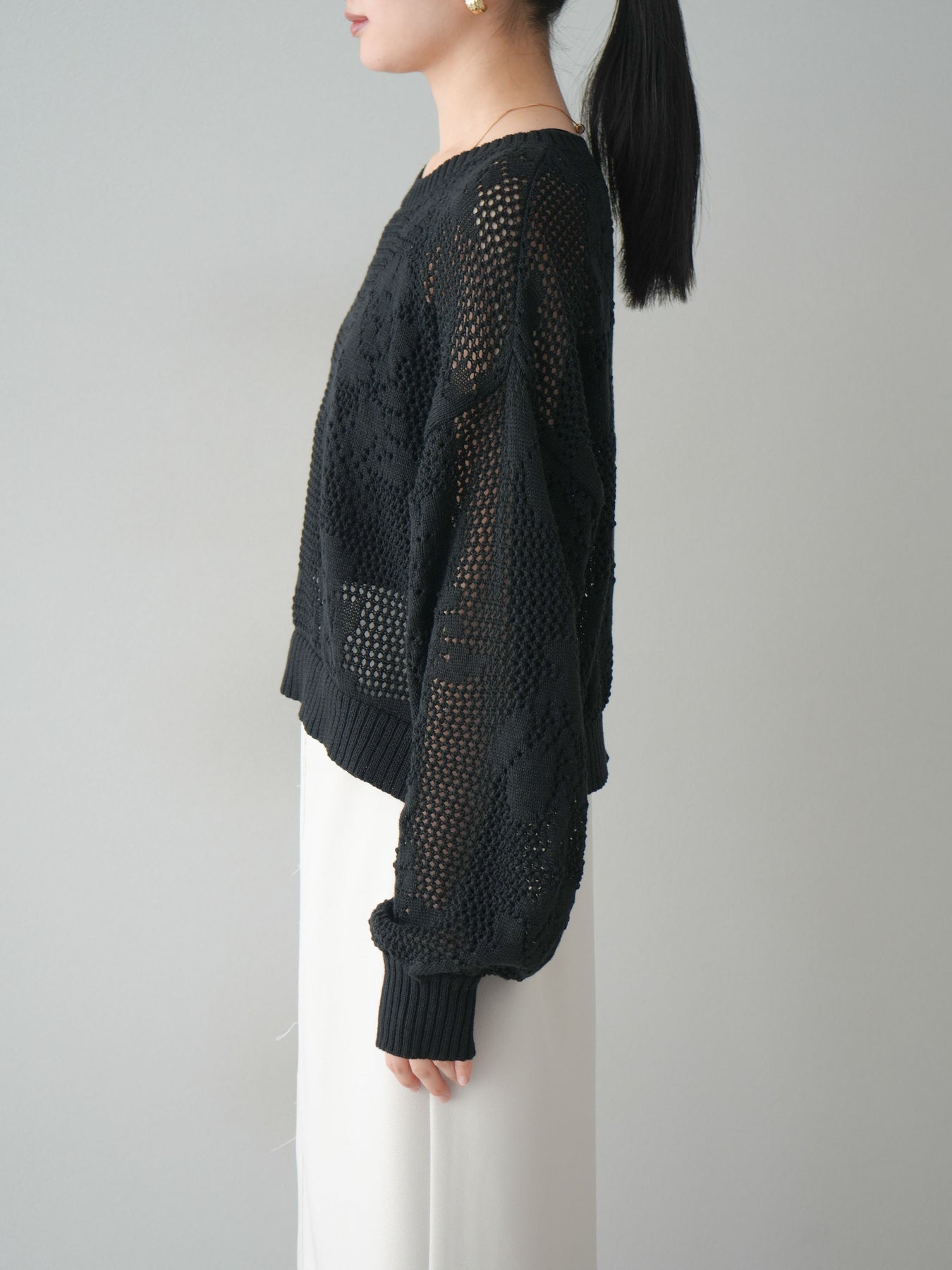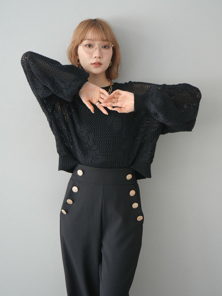 トレンド感のある透かし編みデザインが魅力のニットプルオーバー。ゆったりとしたシルエットとボリュームスリーブが女性らしい抜け感を演出。ほどよい肌見せが叶い、シーズンレスで活躍する一着。デニムやスカートと合わせて、幅広いコーディネートが楽しめます。 ※ボトムス、キャミソール(インナー)以外の商品は一律でインナーは付属していません。