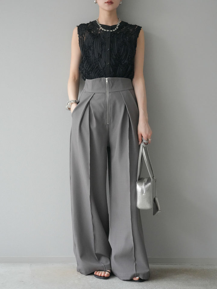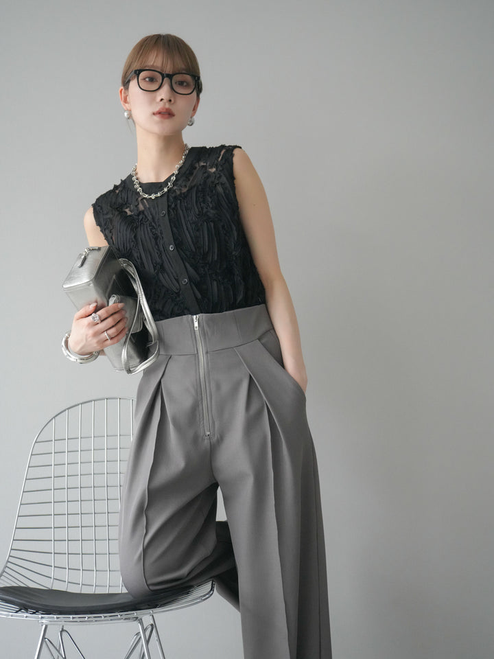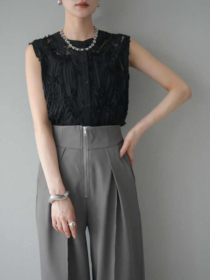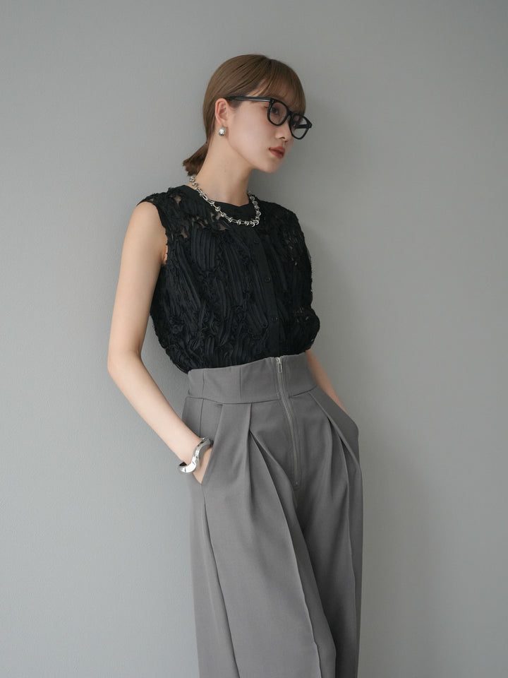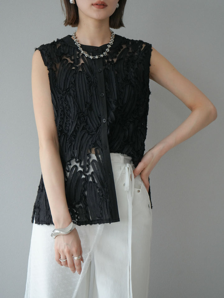 立体感のあるテープジャガードが目を惹くノースリーブブラウス。繊細ながらも存在感のあるデザインで、一枚で華やかな印象に。透け感のある軽やかな素材がシーズンムードを高め、レイヤードスタイルにもぴったり。パンツにもスカートにも合わせやすく、着こなしの幅が広がるアイテムです。 ※ボトムス、キャミソール(インナー)以外の商品は一律でインナーは付属していません