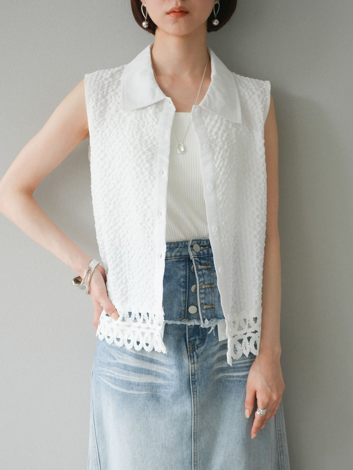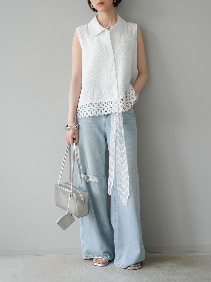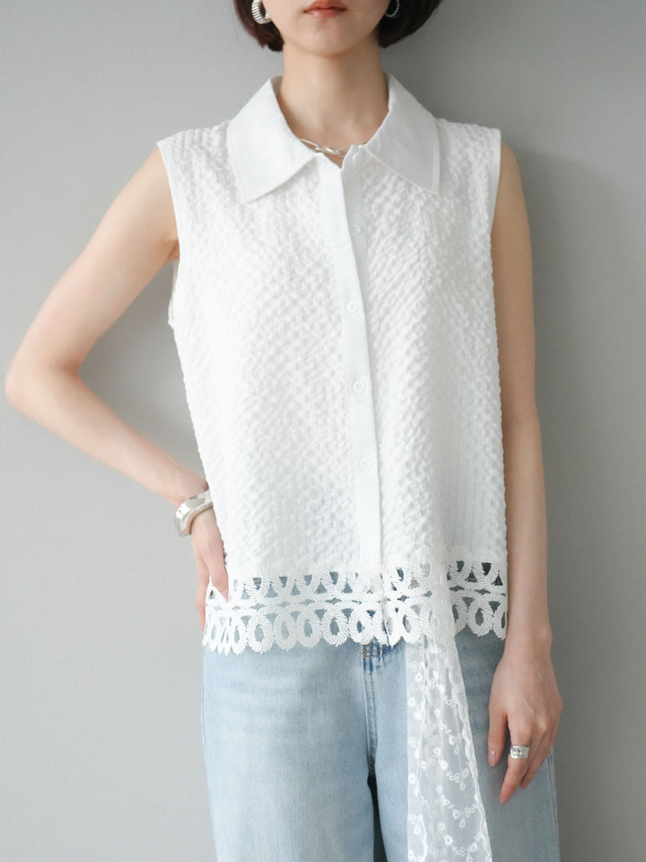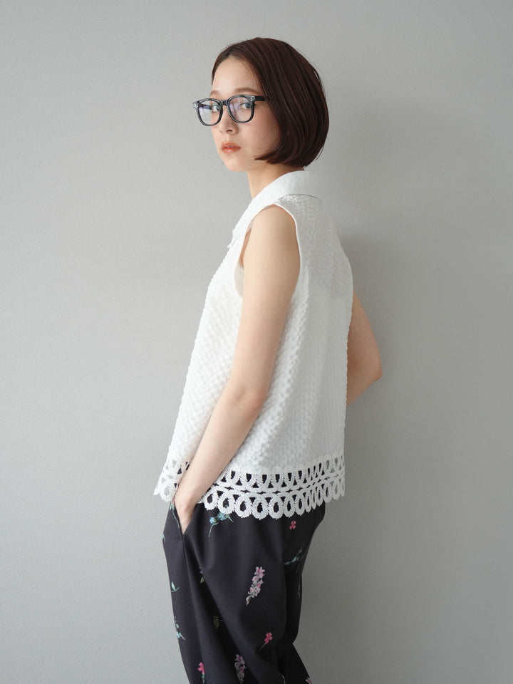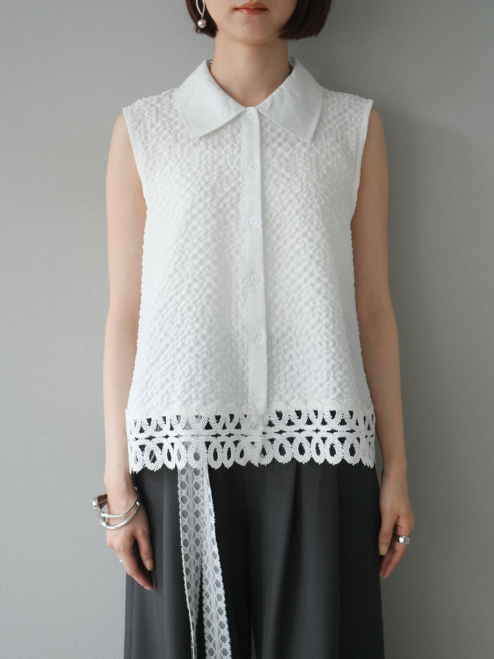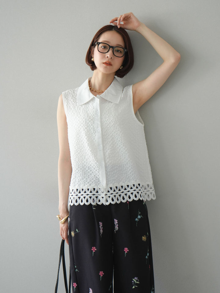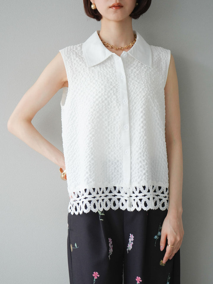 [予約]レース切替エンボスデザインノースリーブブラウス/ホワイト