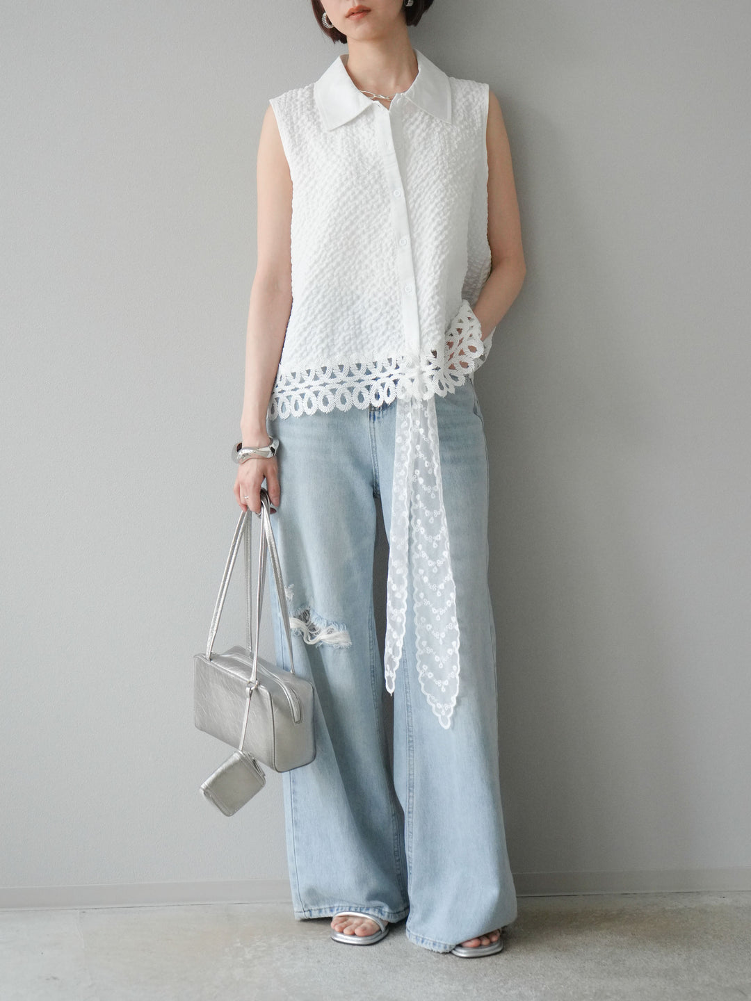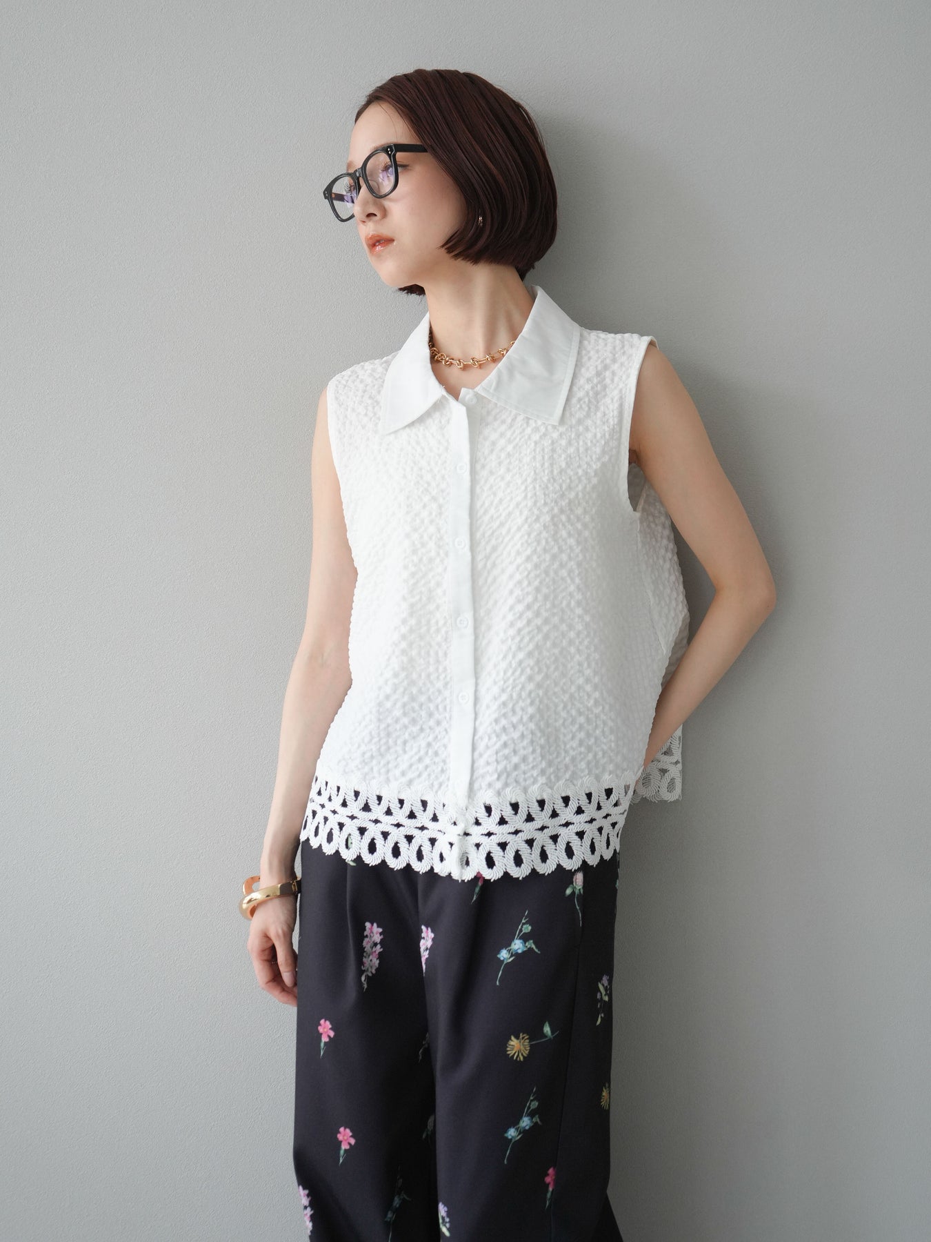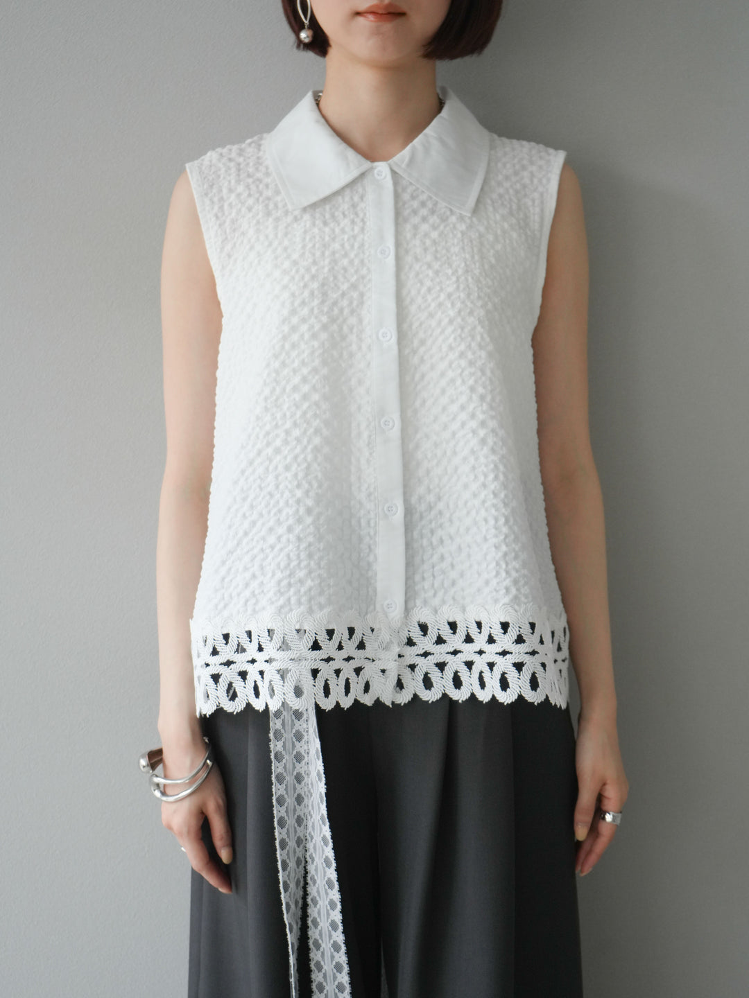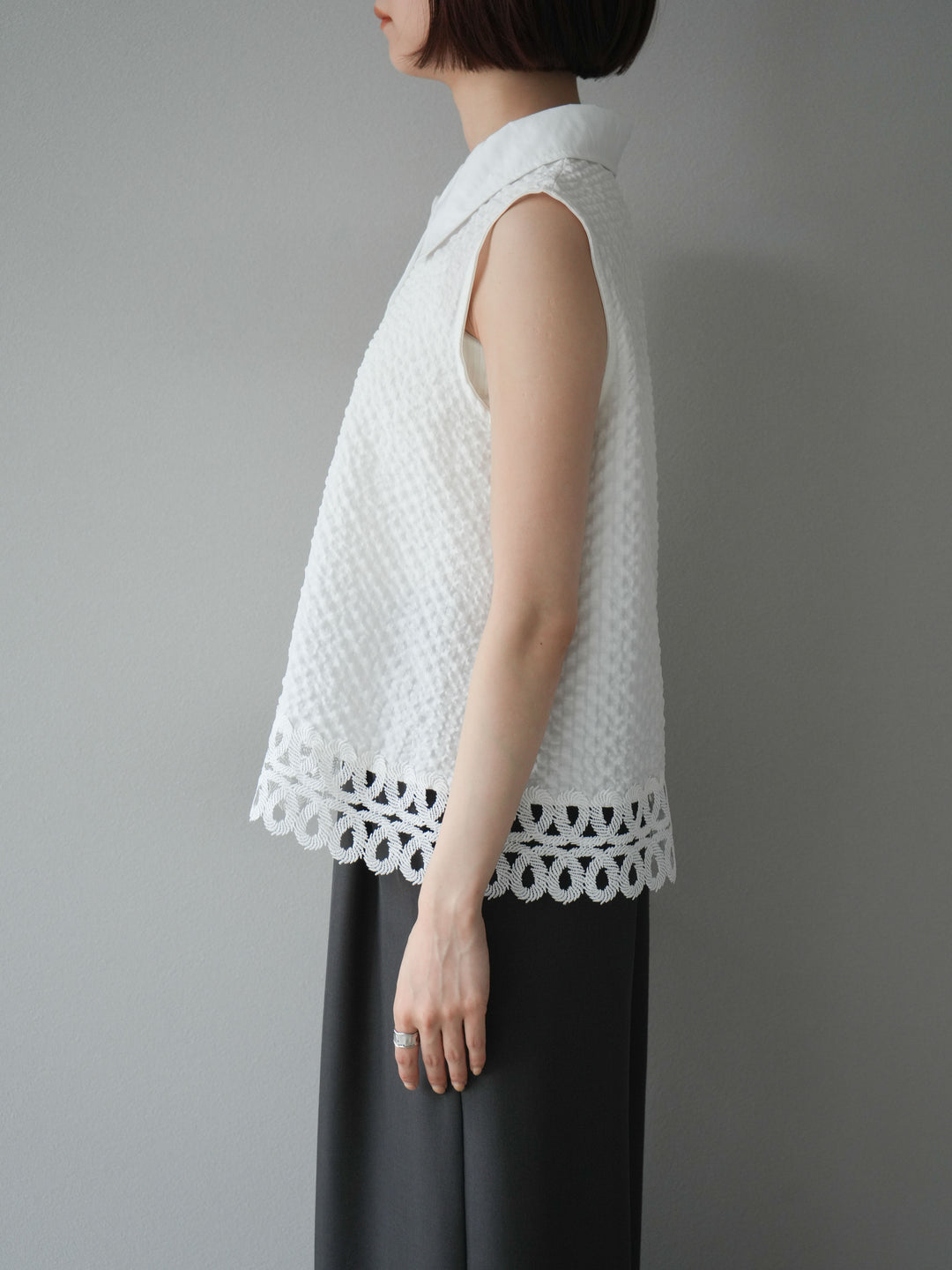 表面感のあるエンボス素材に、裾の繊細なレースを組み合わせたノースリーブブラウス。立体感のあるテクスチャーが特徴で、シンプルながらも印象的な一枚です。クラシカルなシャツ襟が全体を引き締め、上品さをプラス。カジュアルにもきれいめにも着回しやすく、夏のワードローブにぴったりのアイテムです。 ※ボトムス、キャミソール(インナー)以外の商品は一律でインナーは付属していません