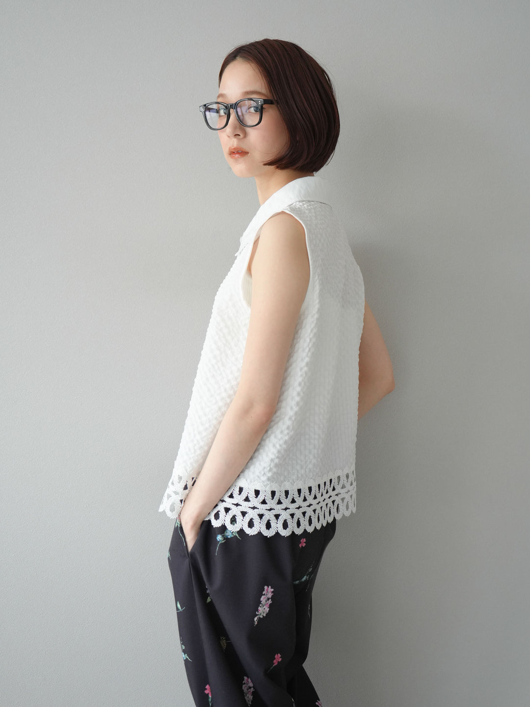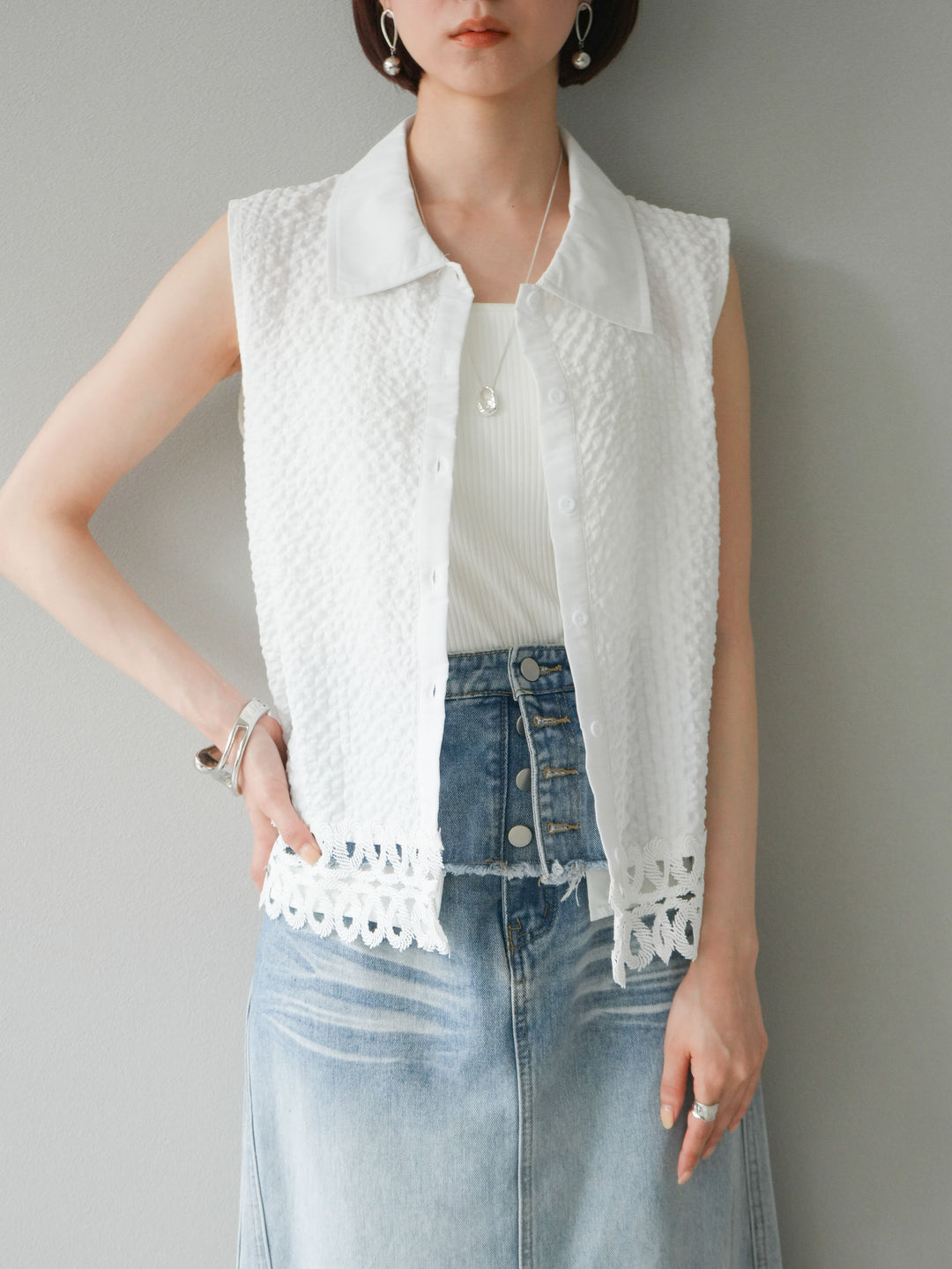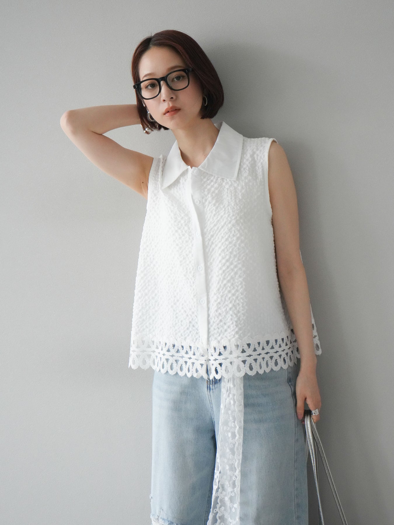 表面感のあるエンボス素材に、裾の繊細なレースを組み合わせたノースリーブブラウス。立体感のあるテクスチャーが特徴で、シンプルながらも印象的な一枚です。クラシカルなシャツ襟が全体を引き締め、上品さをプラス。カジュアルにもきれいめにも着回しやすく、夏のワードローブにぴったりのアイテムです。 ※ボトムス、キャミソール(インナー)以外の商品は一律でインナーは付属していません