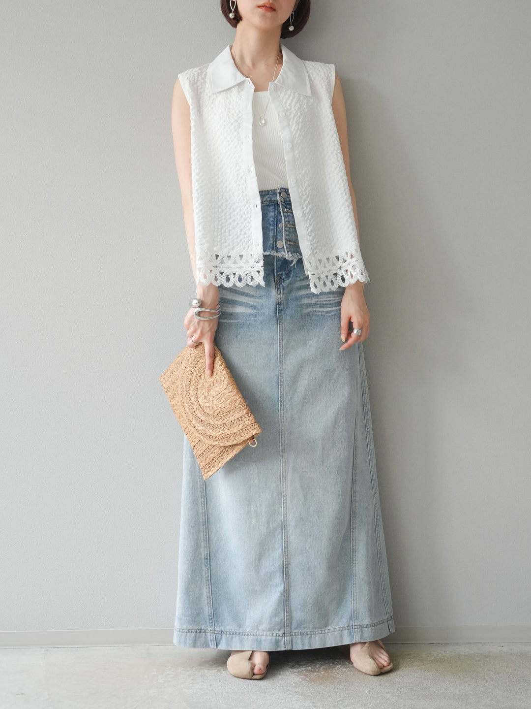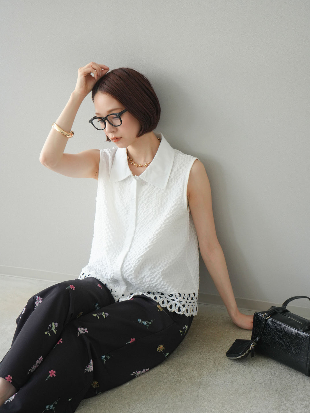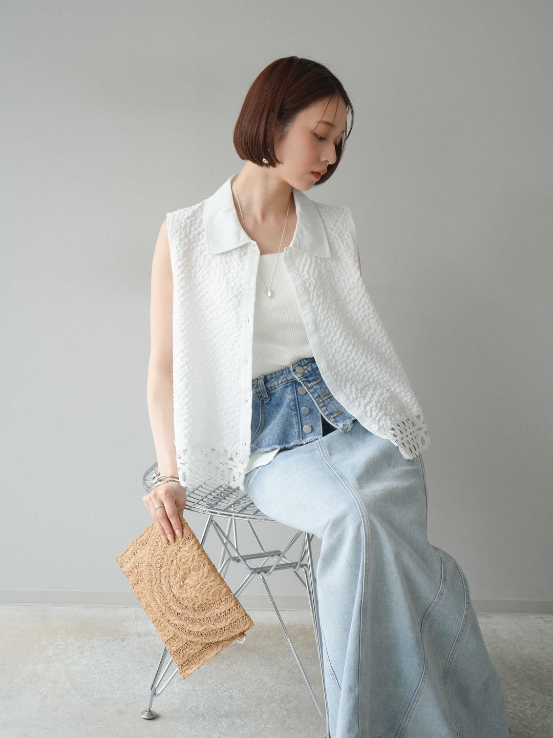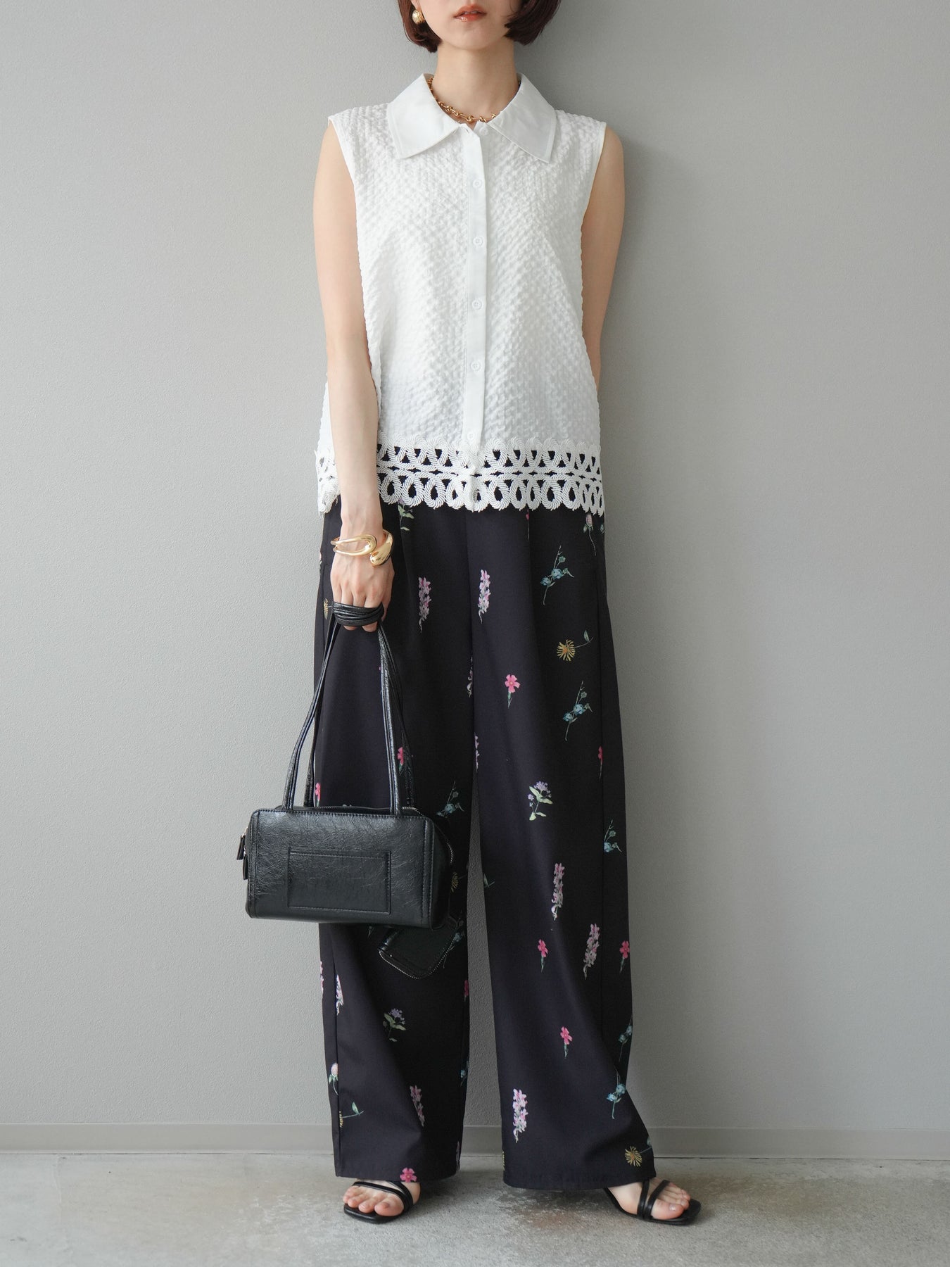 表面感のあるエンボス素材に、裾の繊細なレースを組み合わせたノースリーブブラウス。立体感のあるテクスチャーが特徴で、シンプルながらも印象的な一枚です。クラシカルなシャツ襟が全体を引き締め、上品さをプラス。カジュアルにもきれいめにも着回しやすく、夏のワードローブにぴったりのアイテムです。 ※ボトムス、キャミソール(インナー)以外の商品は一律でインナーは付属していません