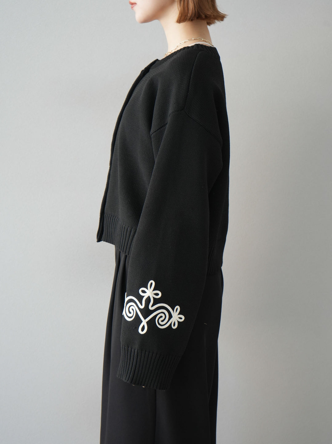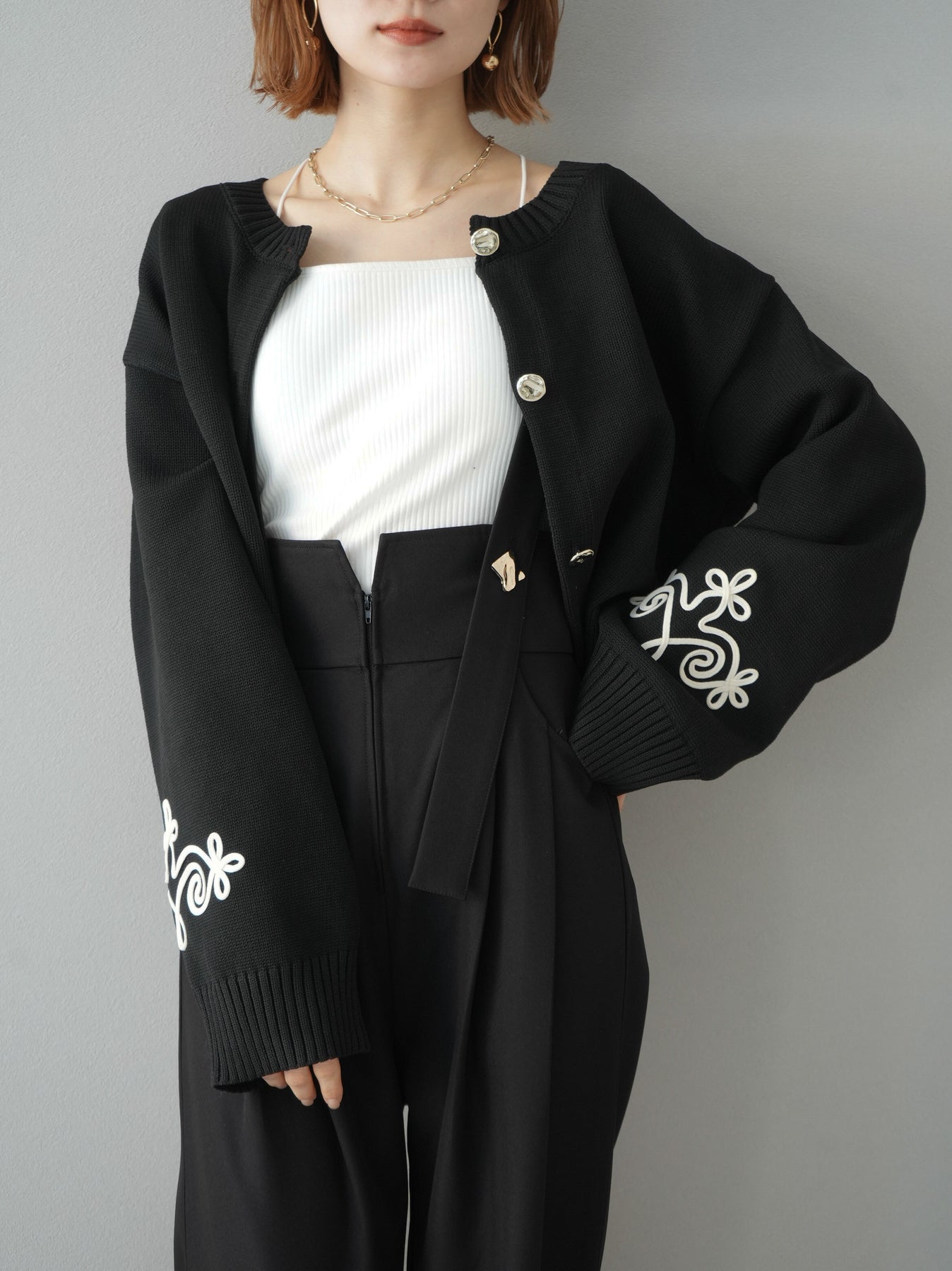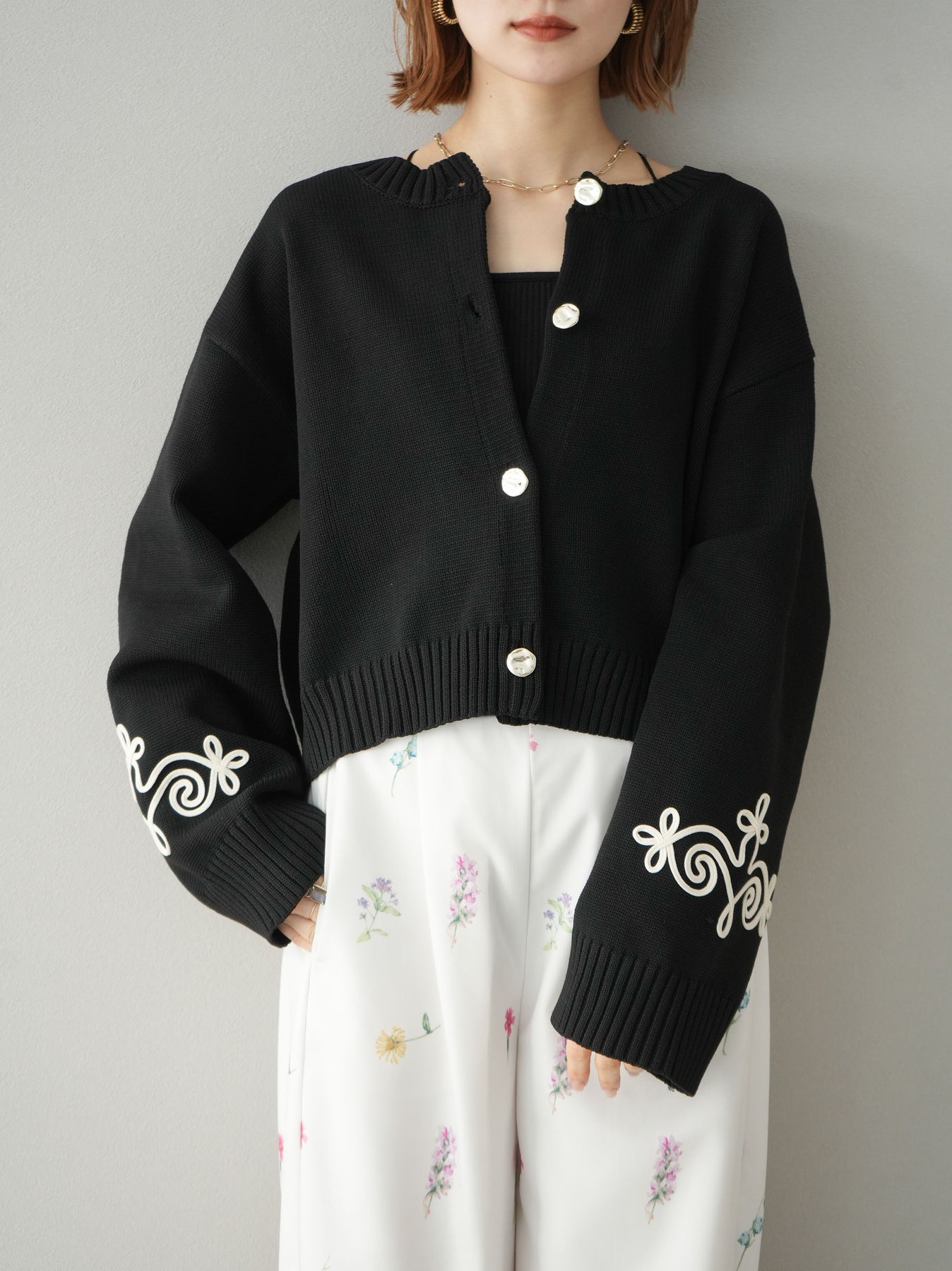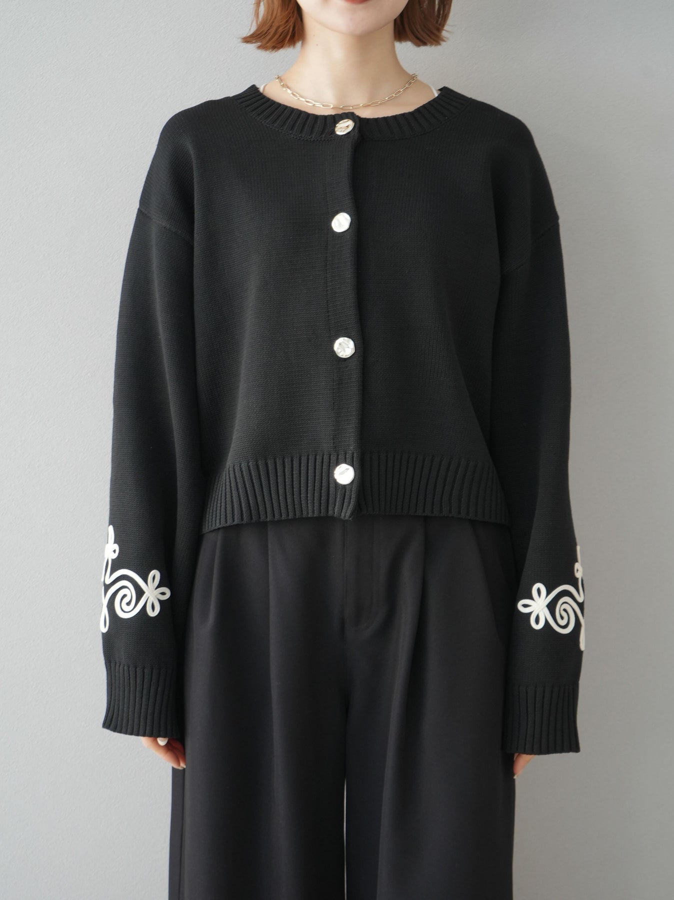 [予約]コード刺繍ゴールドボタンスポンジニットカーディガン/ブラック