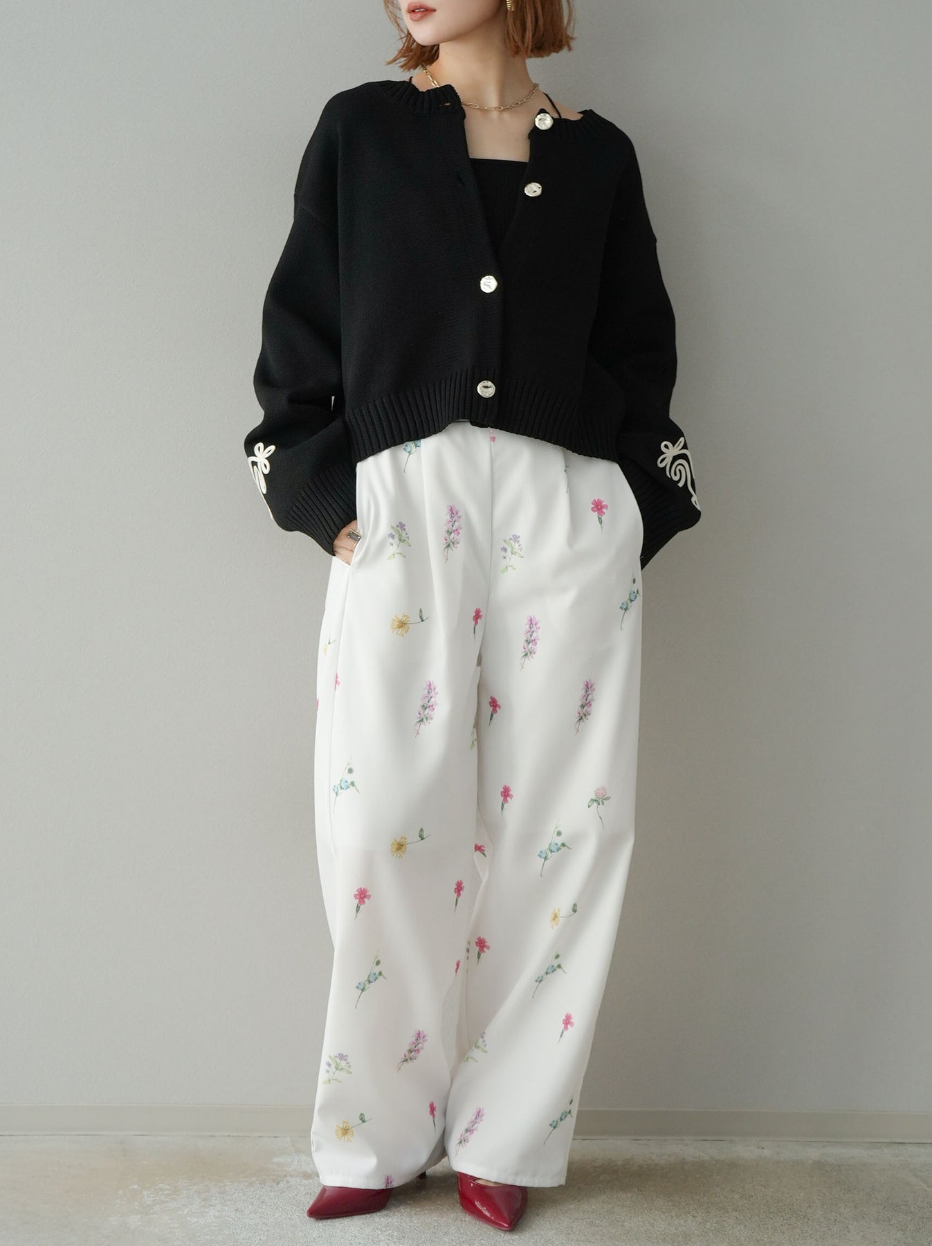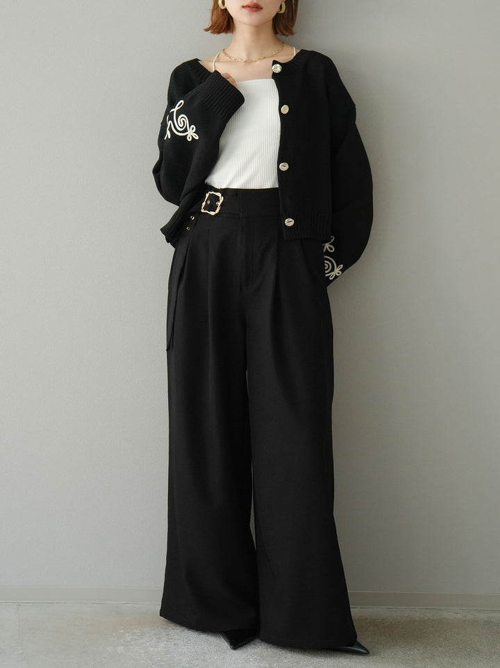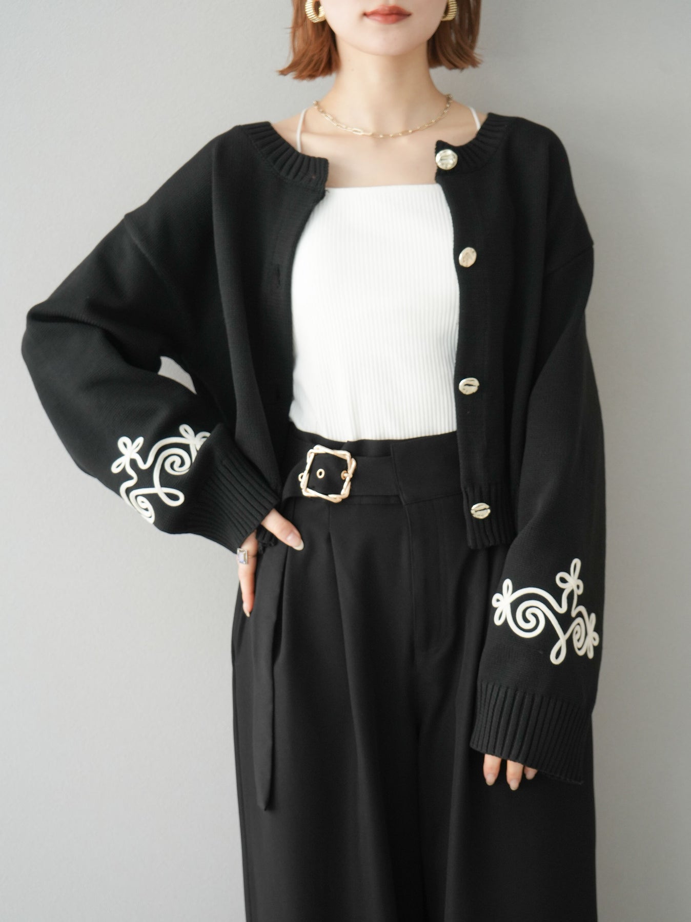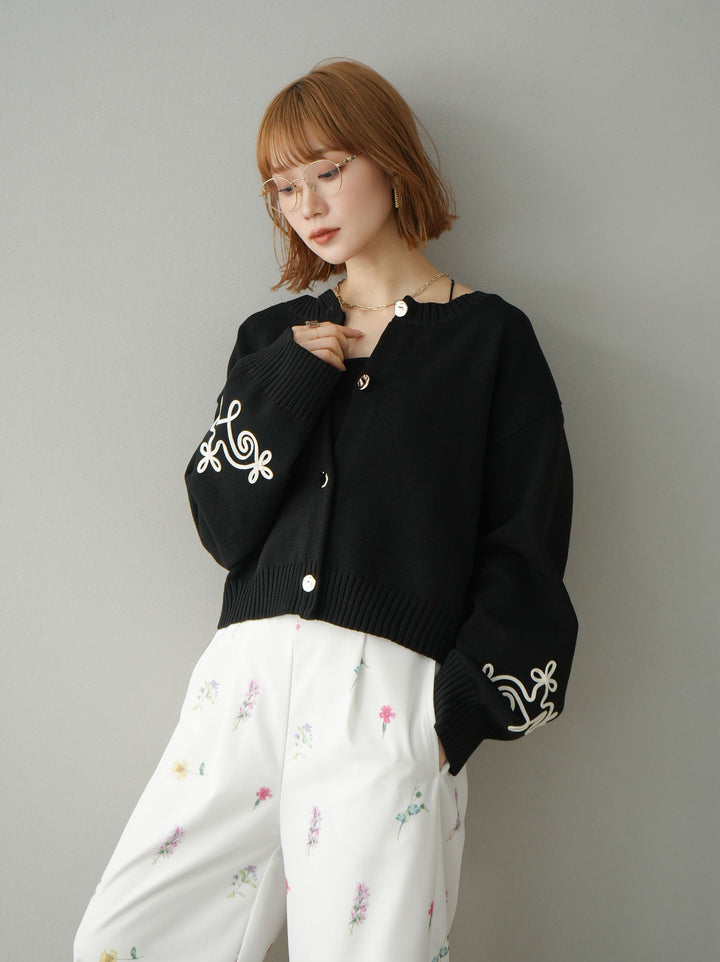 [予約]コード刺繍ゴールドボタンスポンジニットカーディガン/ブラック