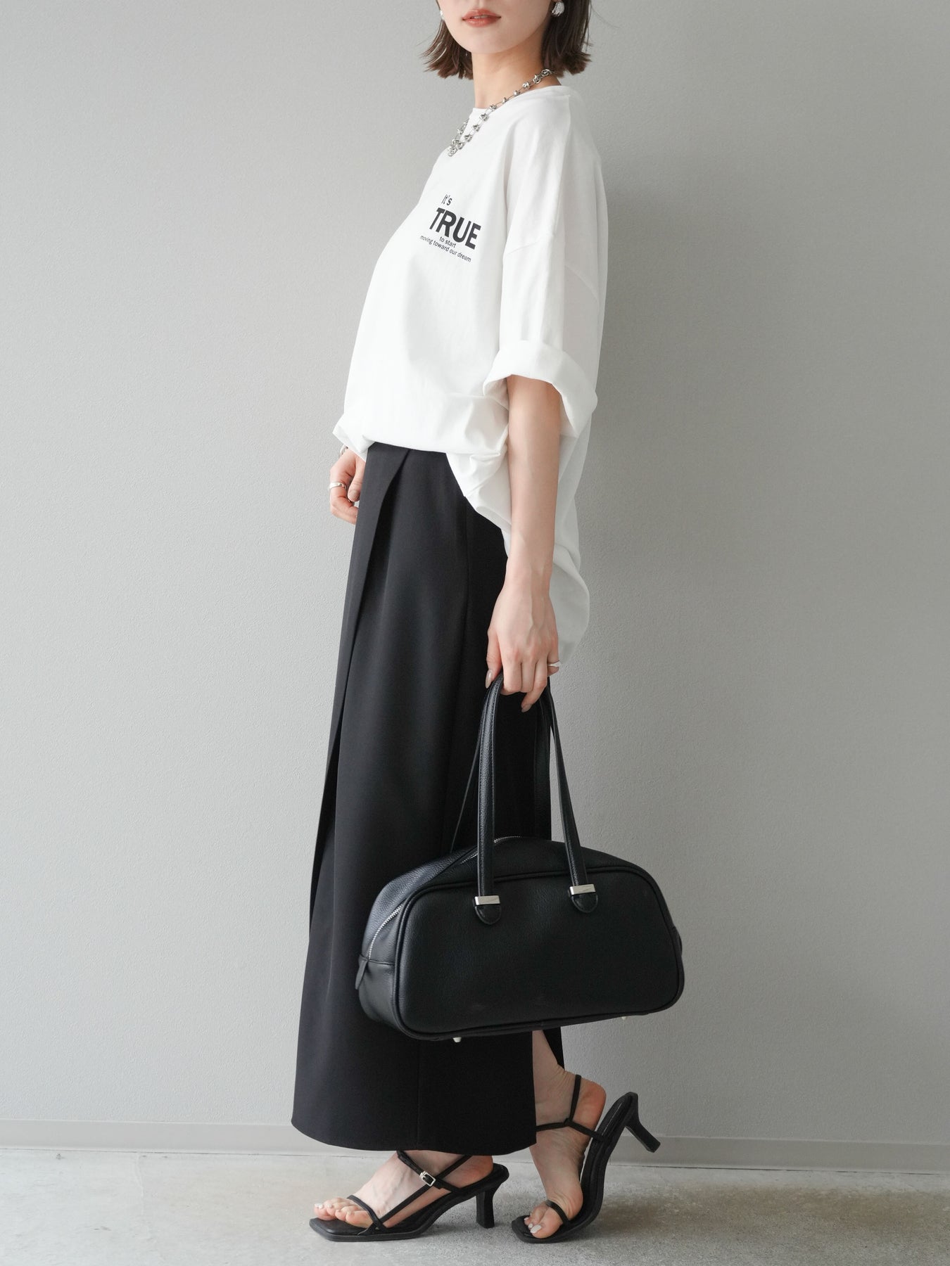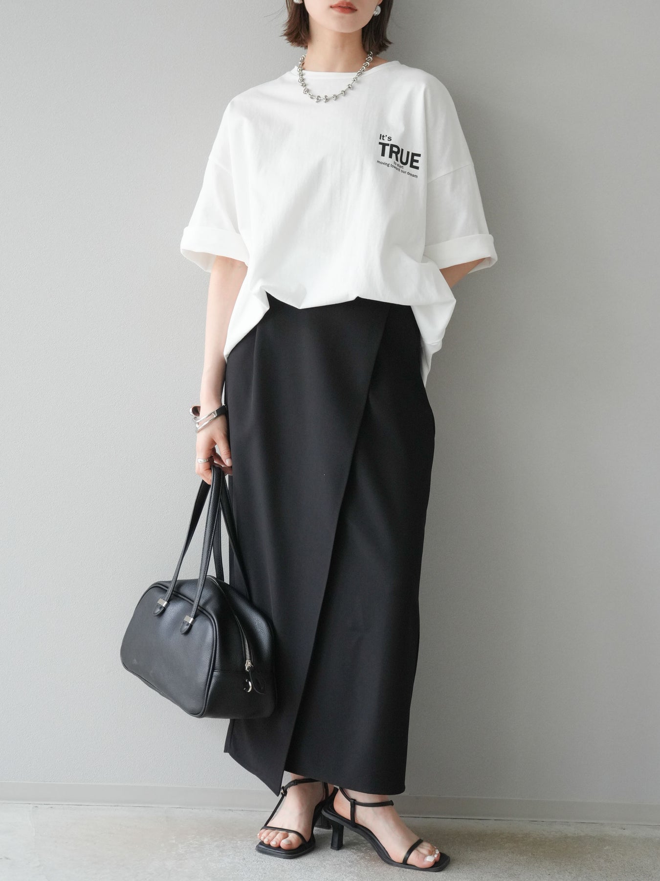 軽やかなツイル素材で仕立てたラップ風デザインが印象的なナロースカート。ほどよくストレッチを効かせた生地が、身体のラインにフィットしつつも動きやすさをキープ。フロントの重なりが縦のラインを強調し、すっきりとした印象を演出します。カジュアルなTシャツからきれいめトップスまで幅広く合わせられる一枚です。