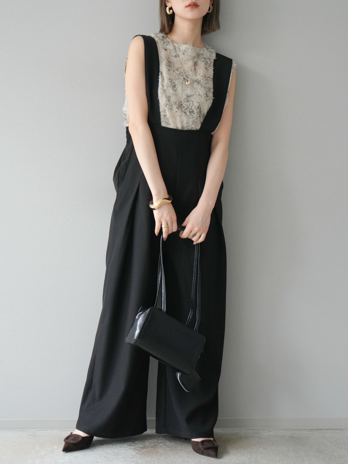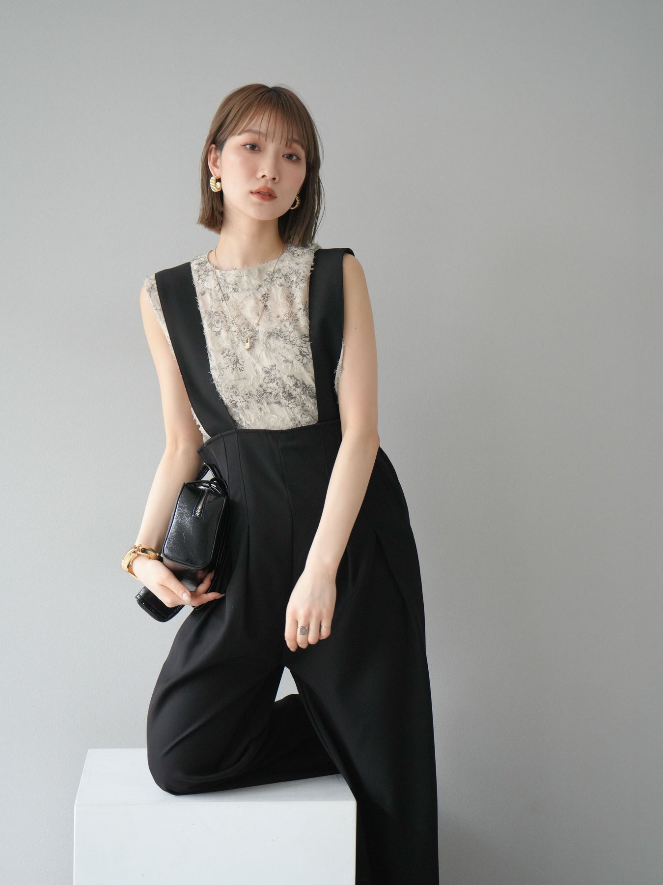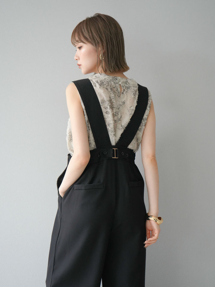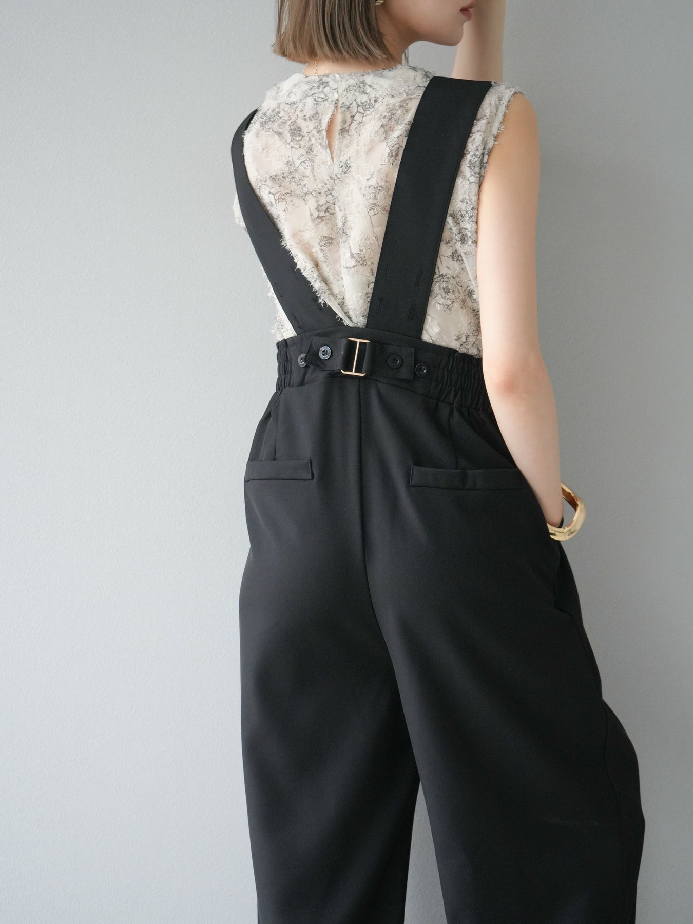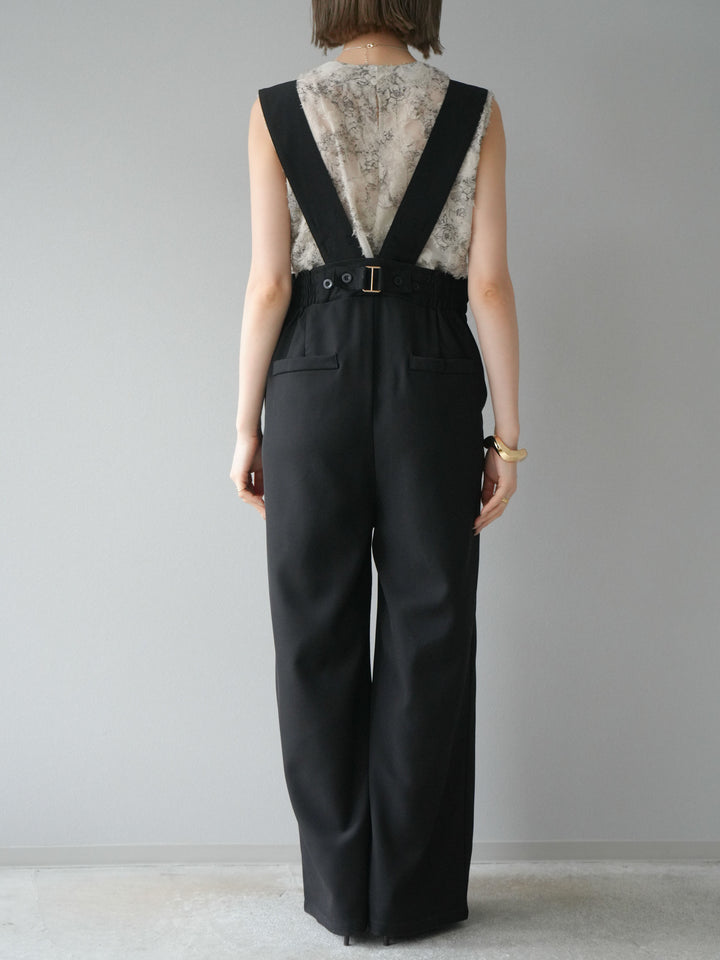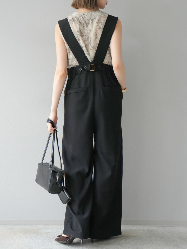 太めのストラップとバックル使いがポイントのサロペット。ほどよいゆとりのあるワイドシルエットで、動きやすさとこなれ感を両立。背中のバックルでストラップの長さ調整も可能。インナー次第でカジュアルにもキレイめにも着回せる万能アイテムです。 ※ボトムス、キャミソール(インナー)以外の商品は一律でインナーは付属していません