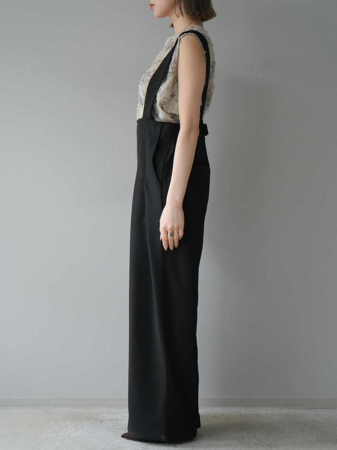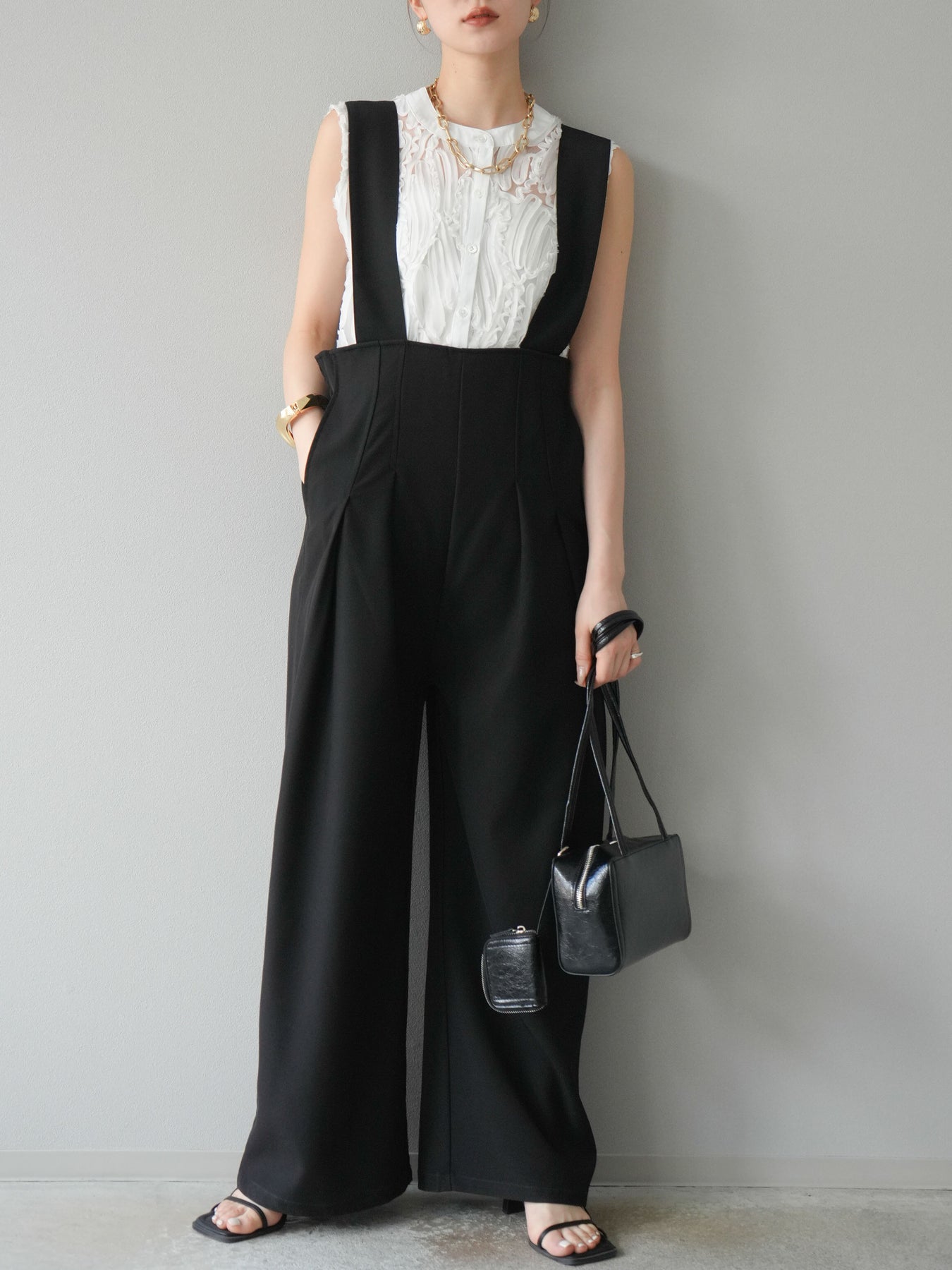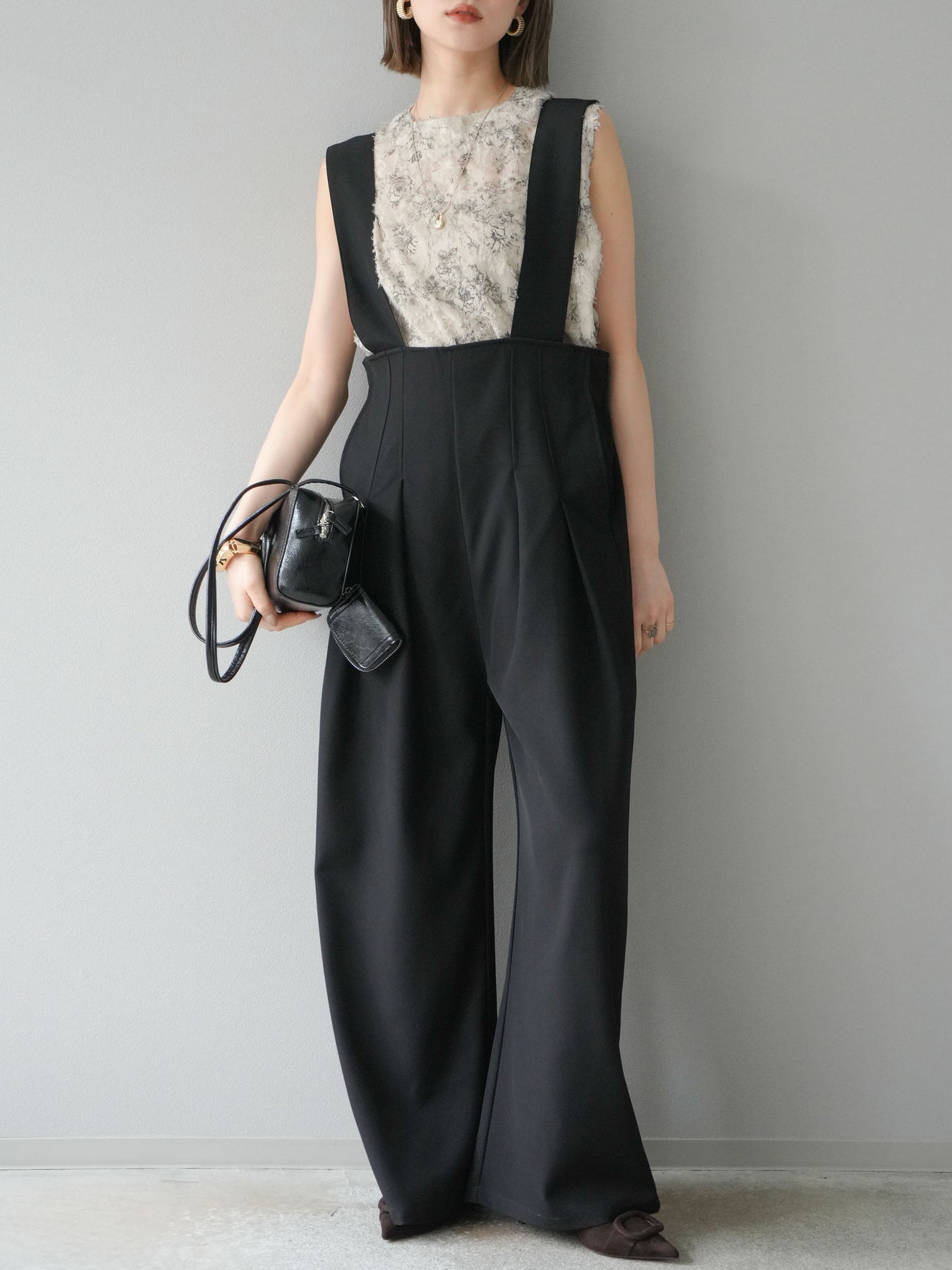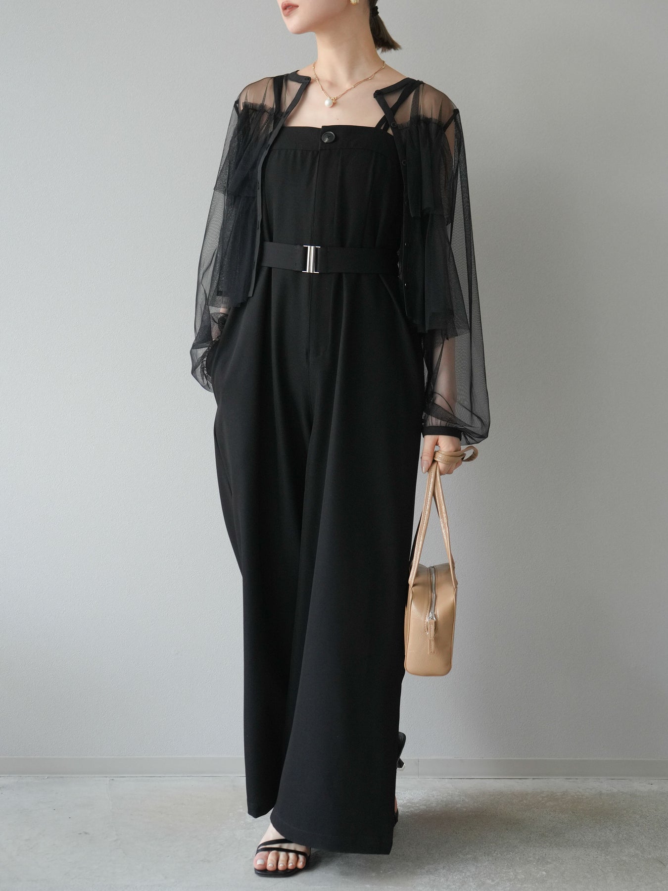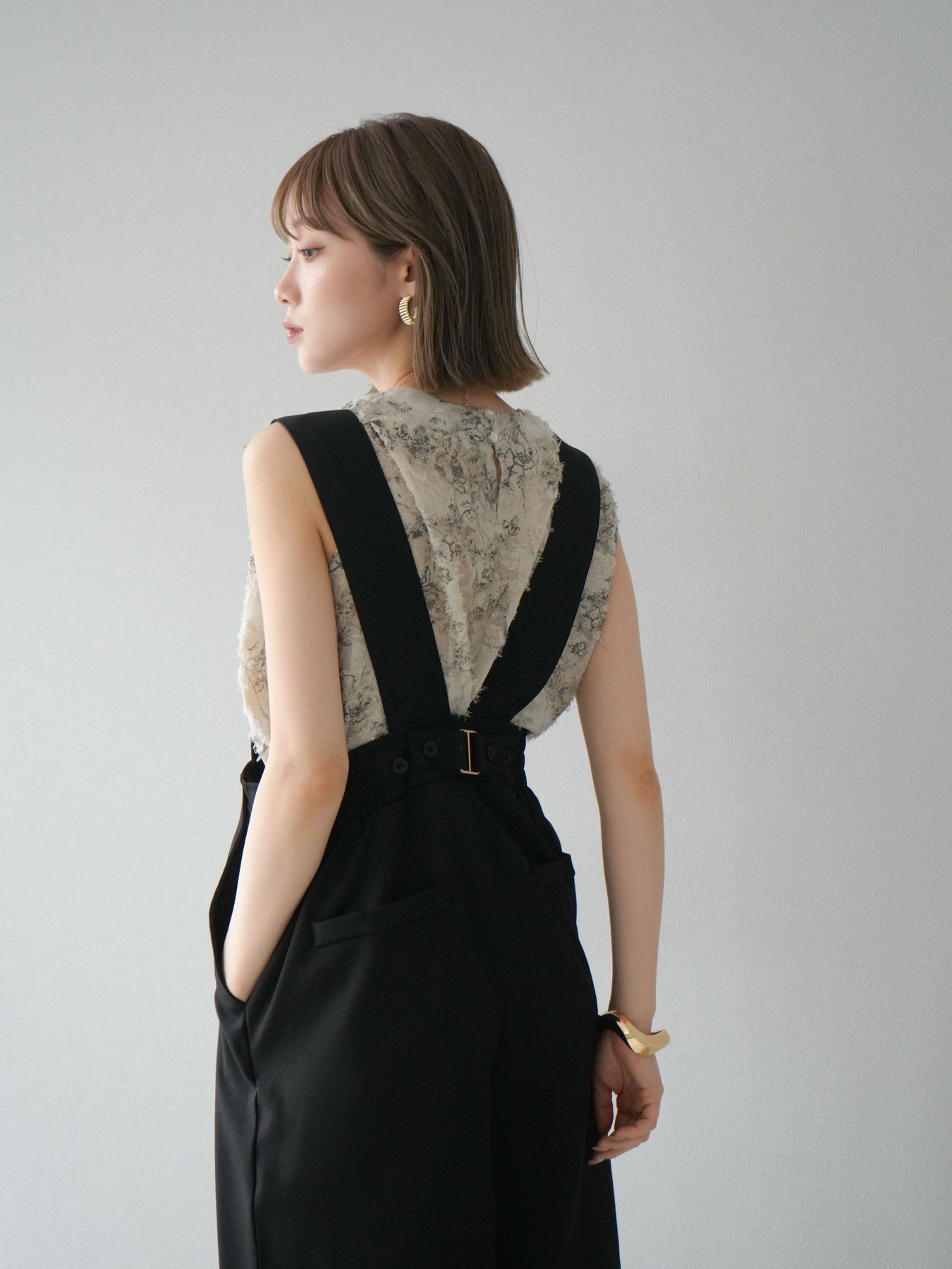太めのストラップとバックル使いがポイントのサロペット。ほどよいゆとりのあるワイドシルエットで、動きやすさとこなれ感を両立。背中のバックルでストラップの長さ調整も可能。インナー次第でカジュアルにもキレイめにも着回せる万能アイテムです。 ※ボトムス、キャミソール(インナー)以外の商品は一律でインナーは付属していません