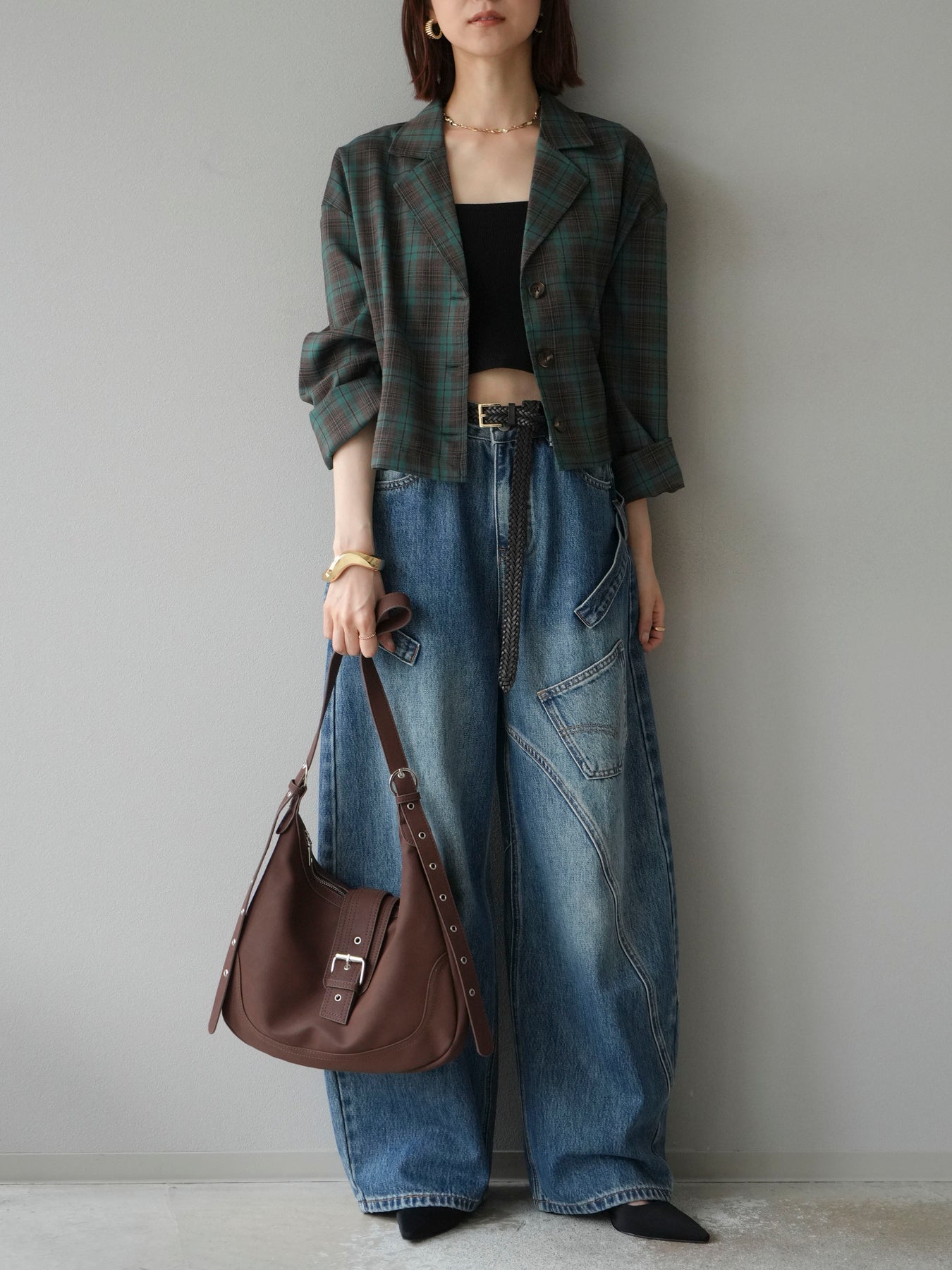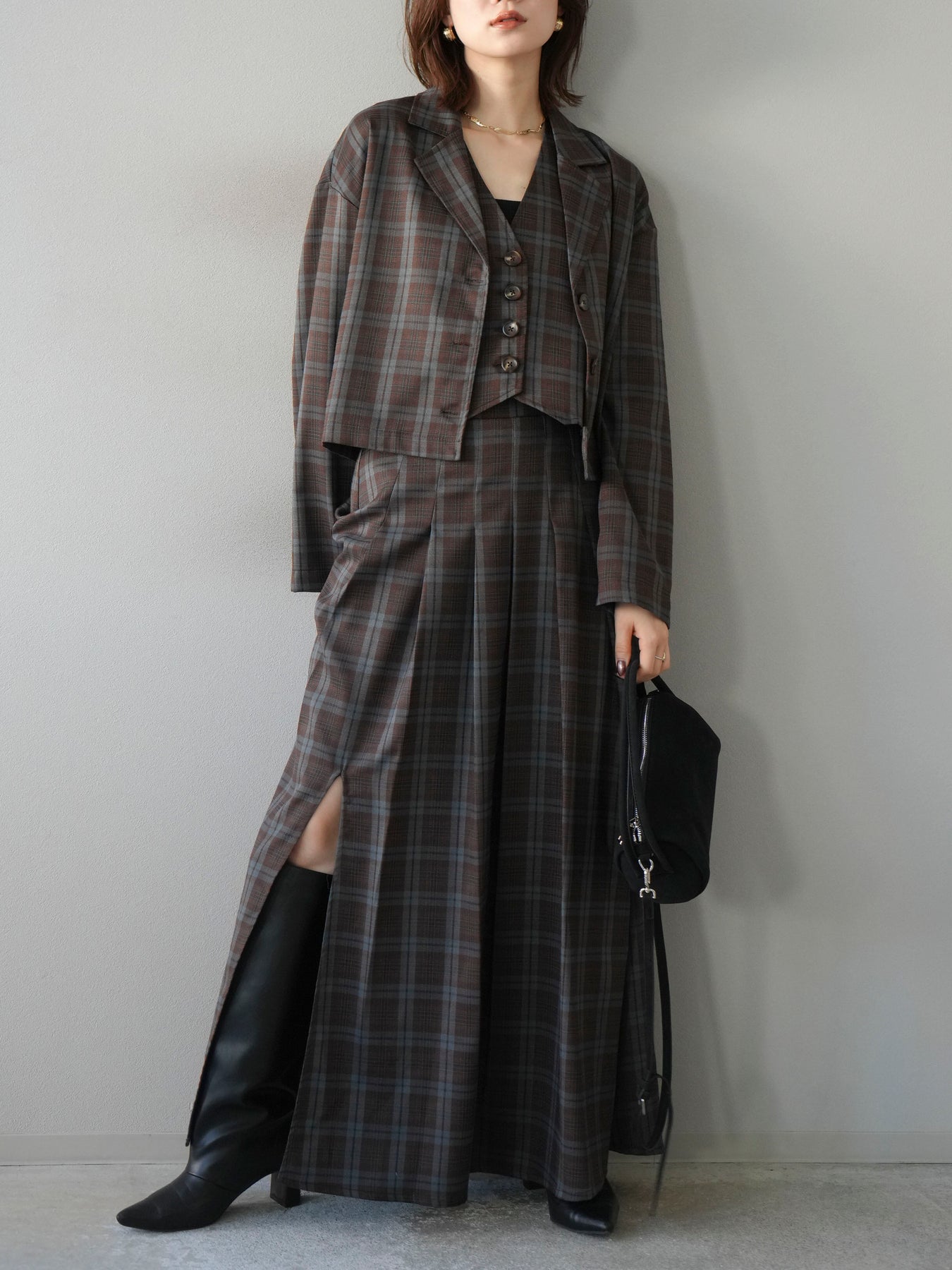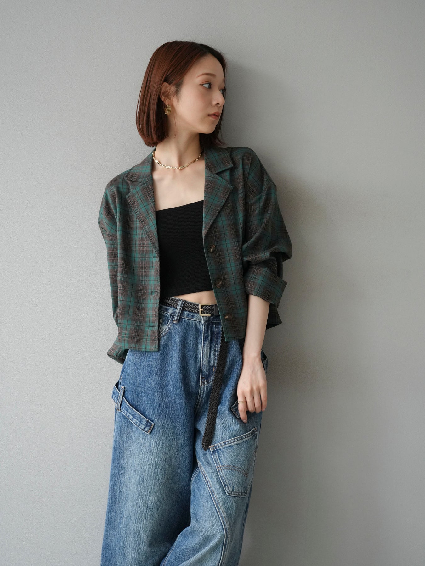 クラシカルなチェック柄が目を引くショートジャケット。コンパクトな丈感がスタイルバランスを整え、ハイウエストのボトムスとも好相性です。テーラードカラーとフロントボタンで上品さを演出しつつ、ショート丈ならではの軽やかさでデイリー使いにも取り入れやすいデザイン。スカートと合わせてフェミニンに、パンツと合わせてマニッシュにと幅広いスタイリングが楽しめます。羽織るだけでコーディネートが締まり、季節の変わり目に活躍する一着です。 ※ボトムス、キャミソール(インナー)以外の商品は一律でインナーは付属していません。
