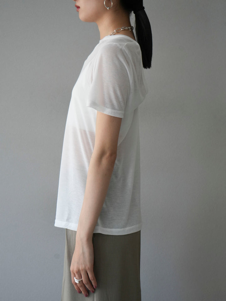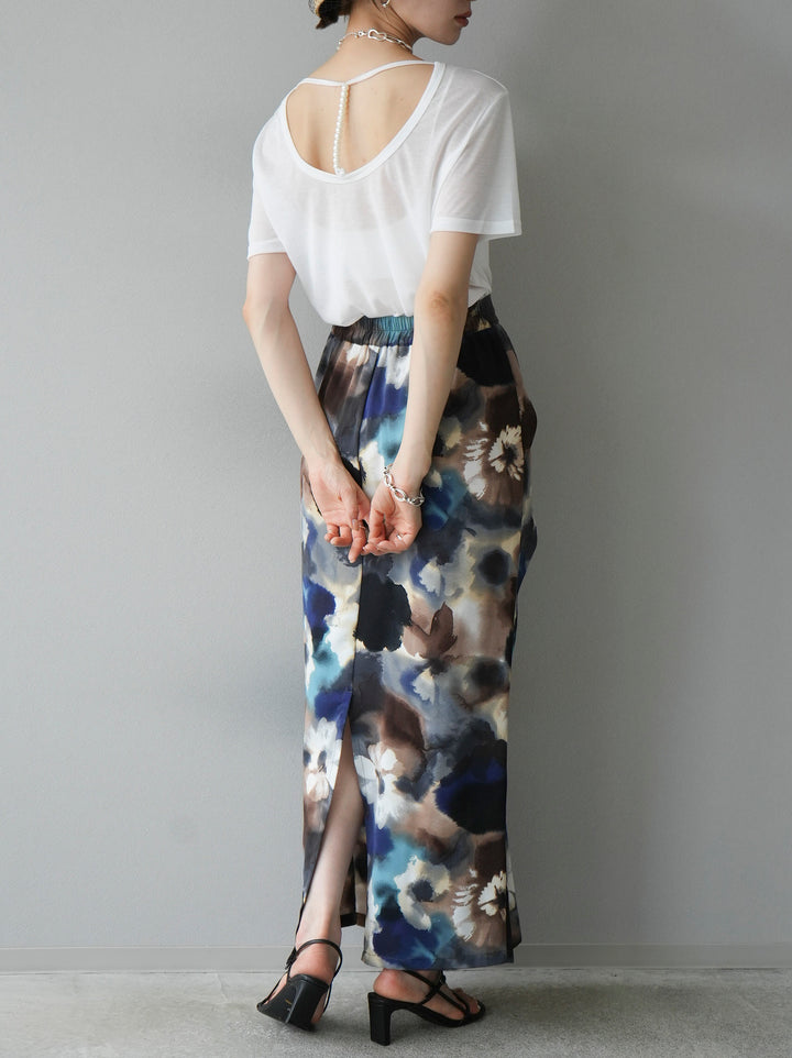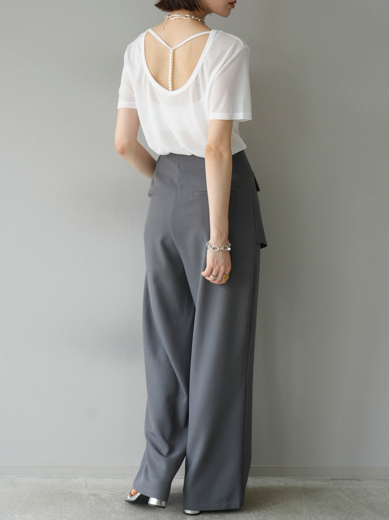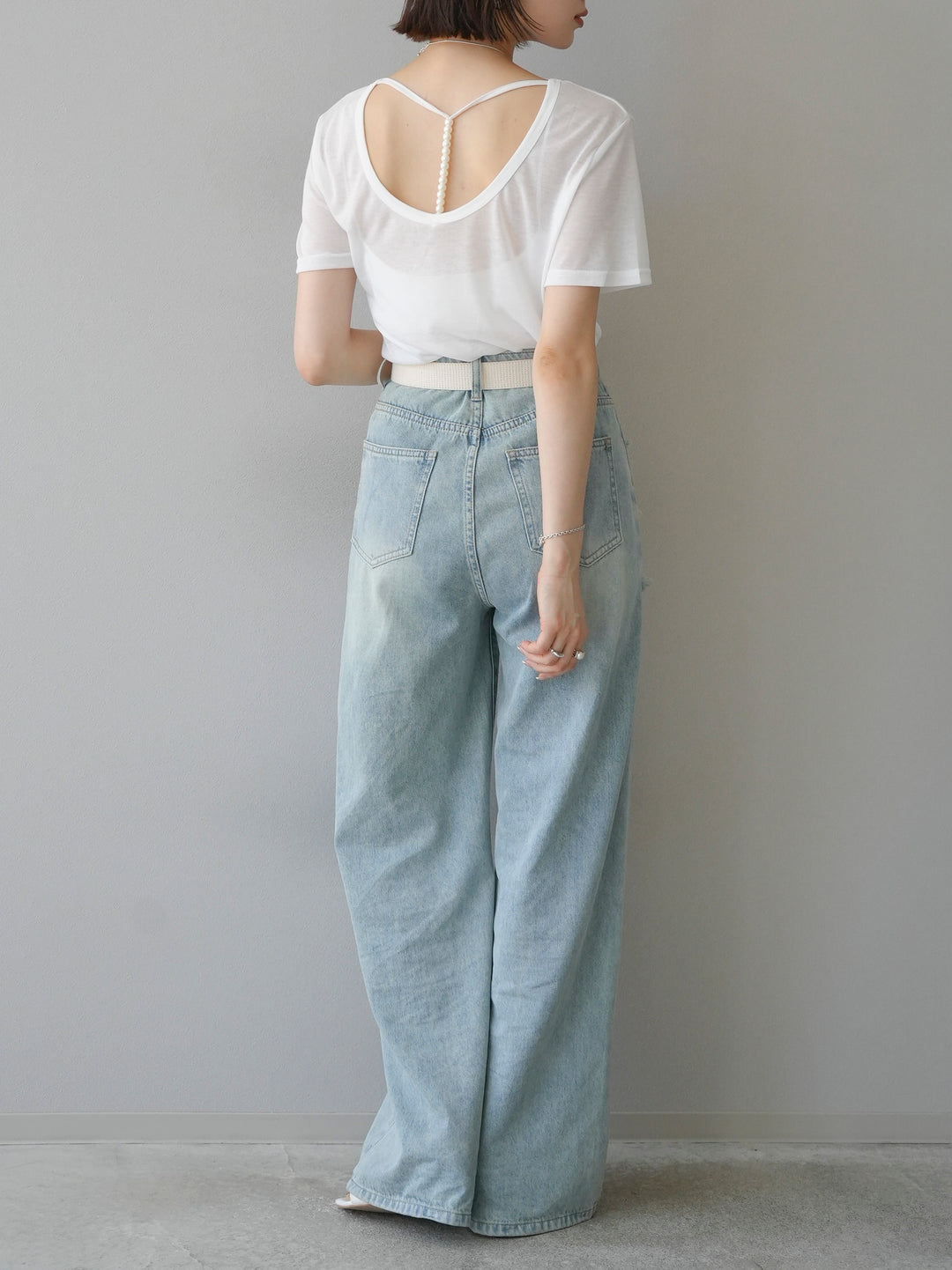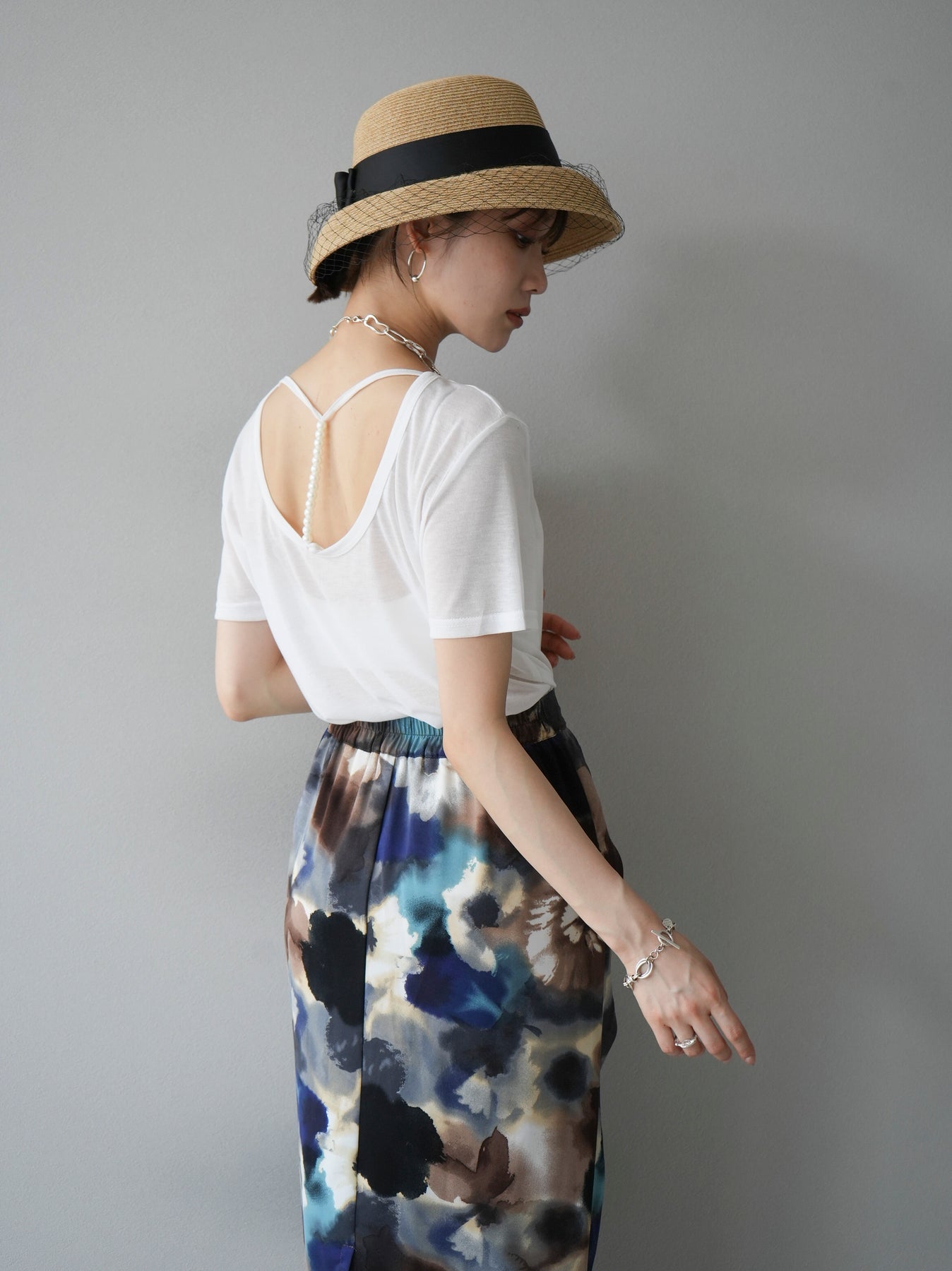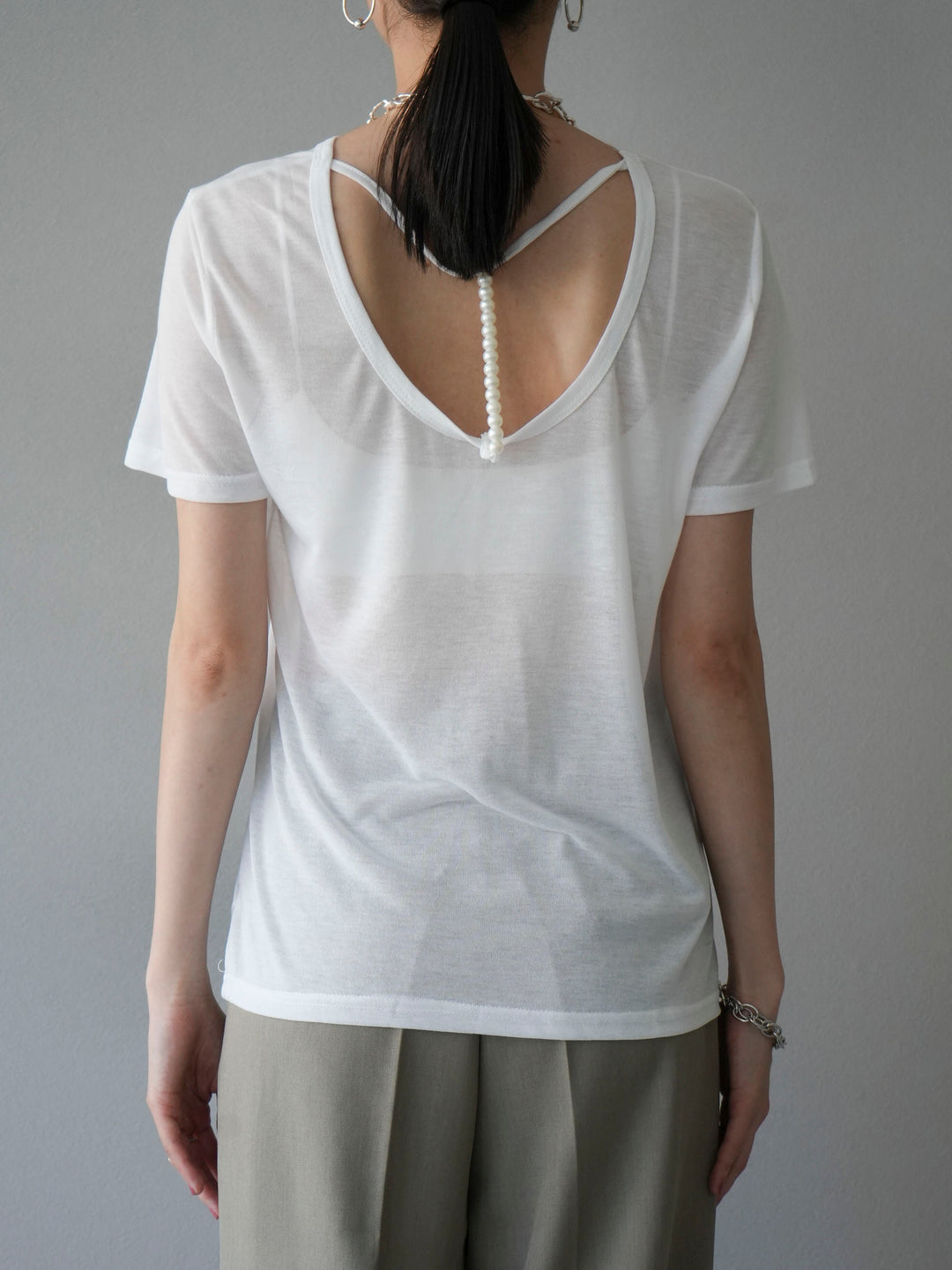 背中が大きく空いたデザインが特徴的なTシャツ。バックのパール装飾がアクセントになり、シンプルなフロントと対照的な背面のデザインが魅力的です。柔らかく快適な素材を使用しており、カジュアルな装いからきれいめなスタイルまで幅広く活躍します。軽やかな着心地で、夏のコーディネートにぴったりの一枚です。