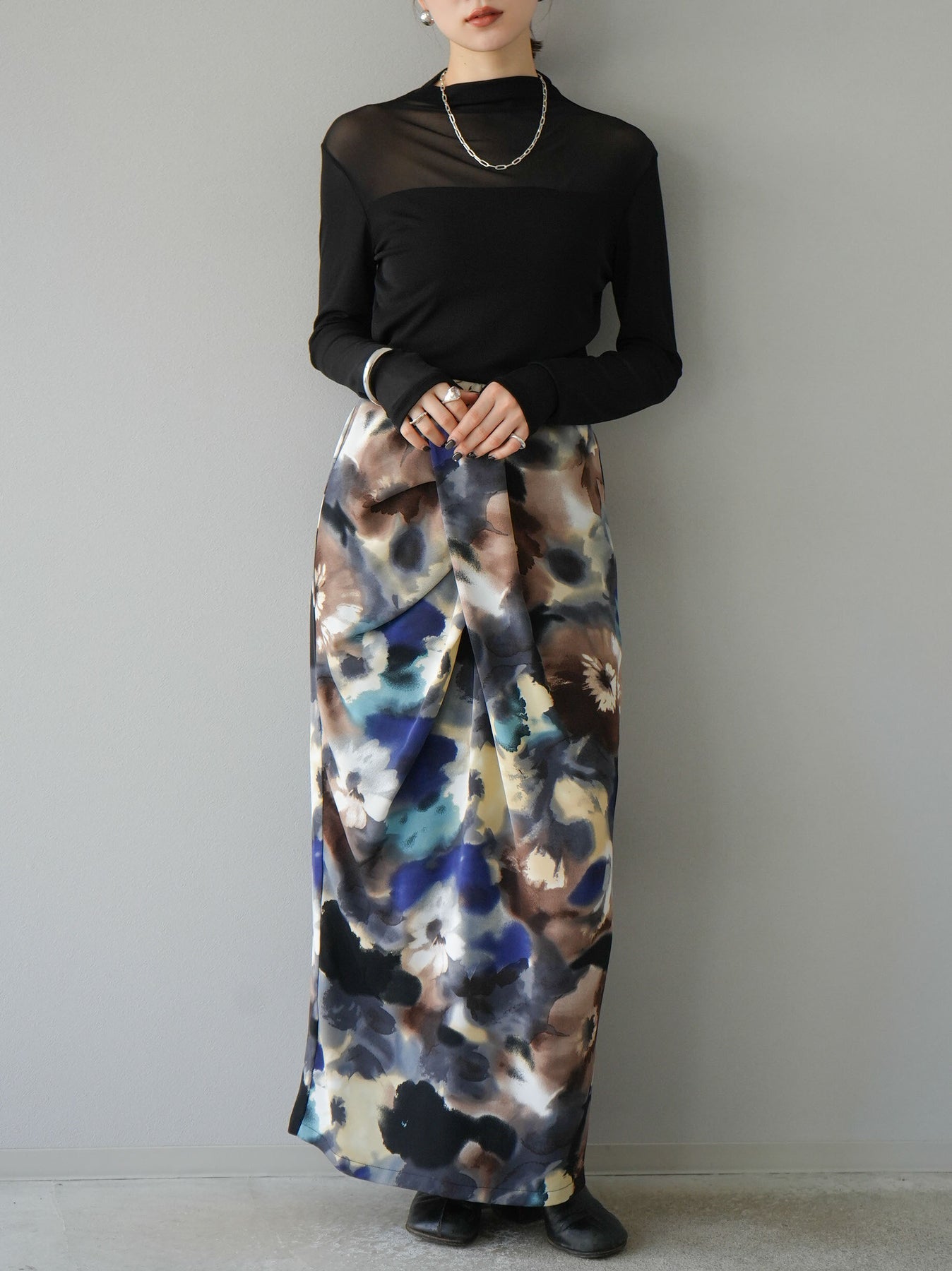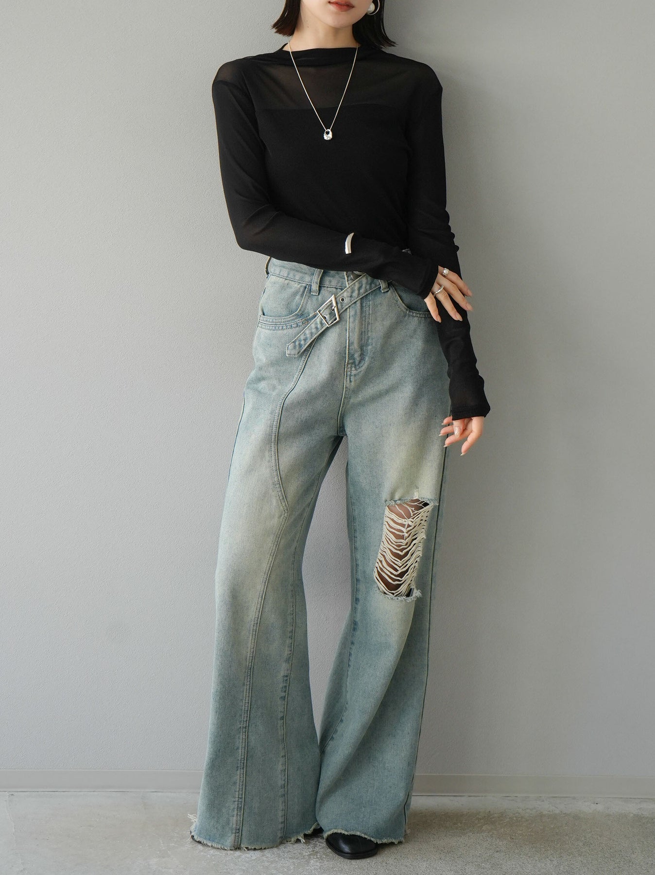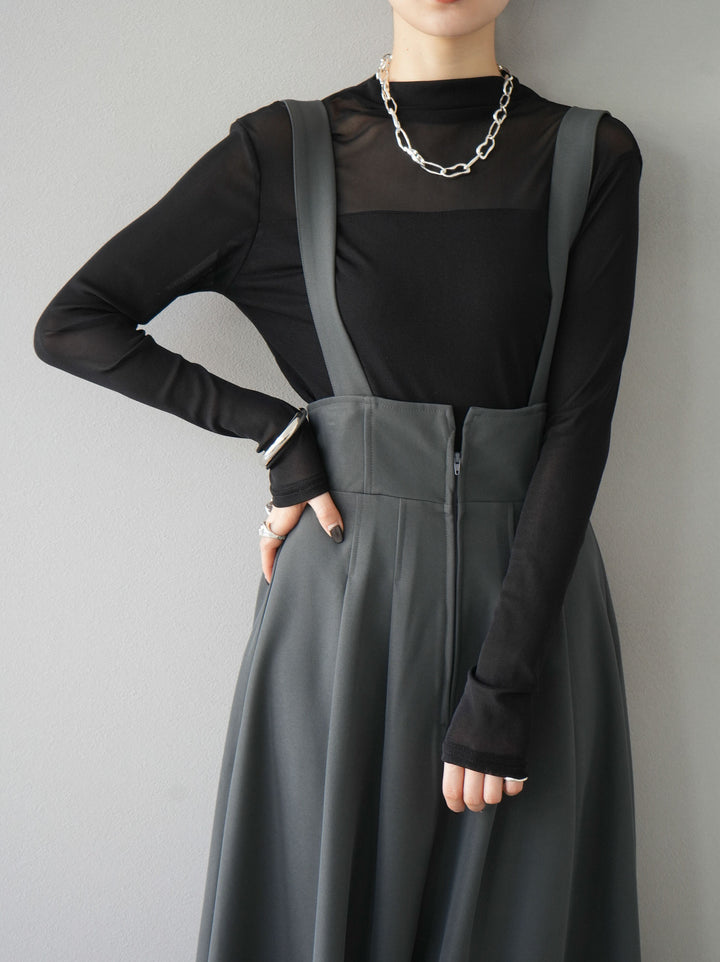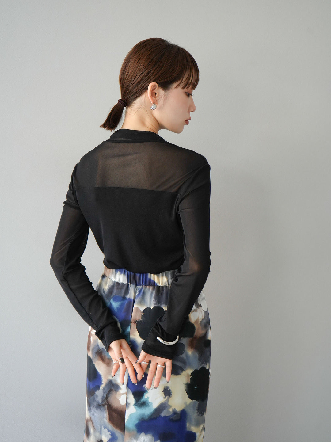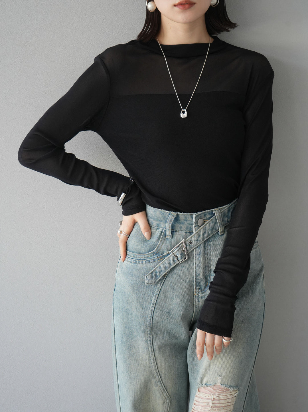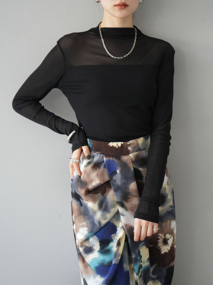 [予約]シアー切替ストレッチ長袖トップス/ブラック