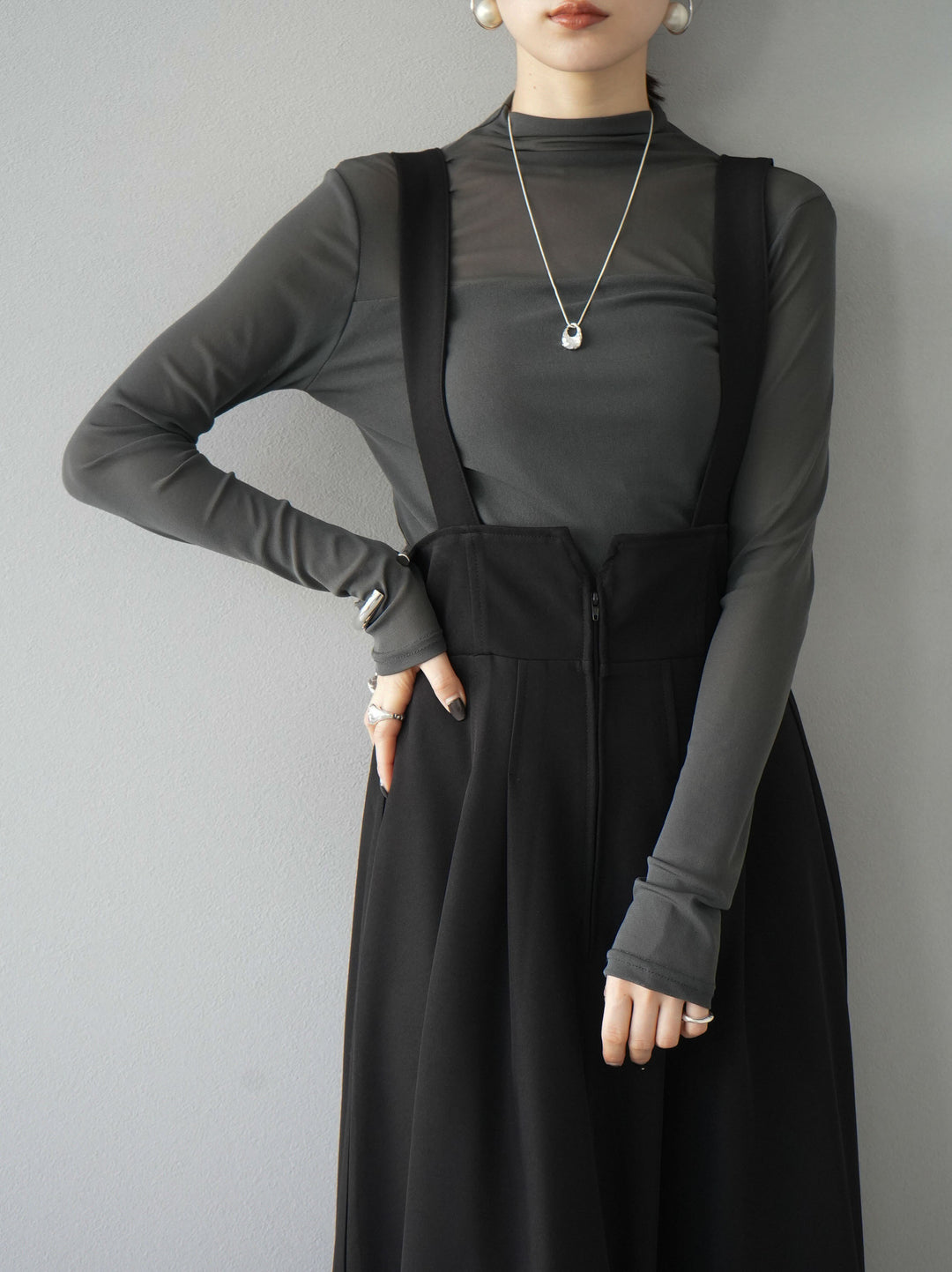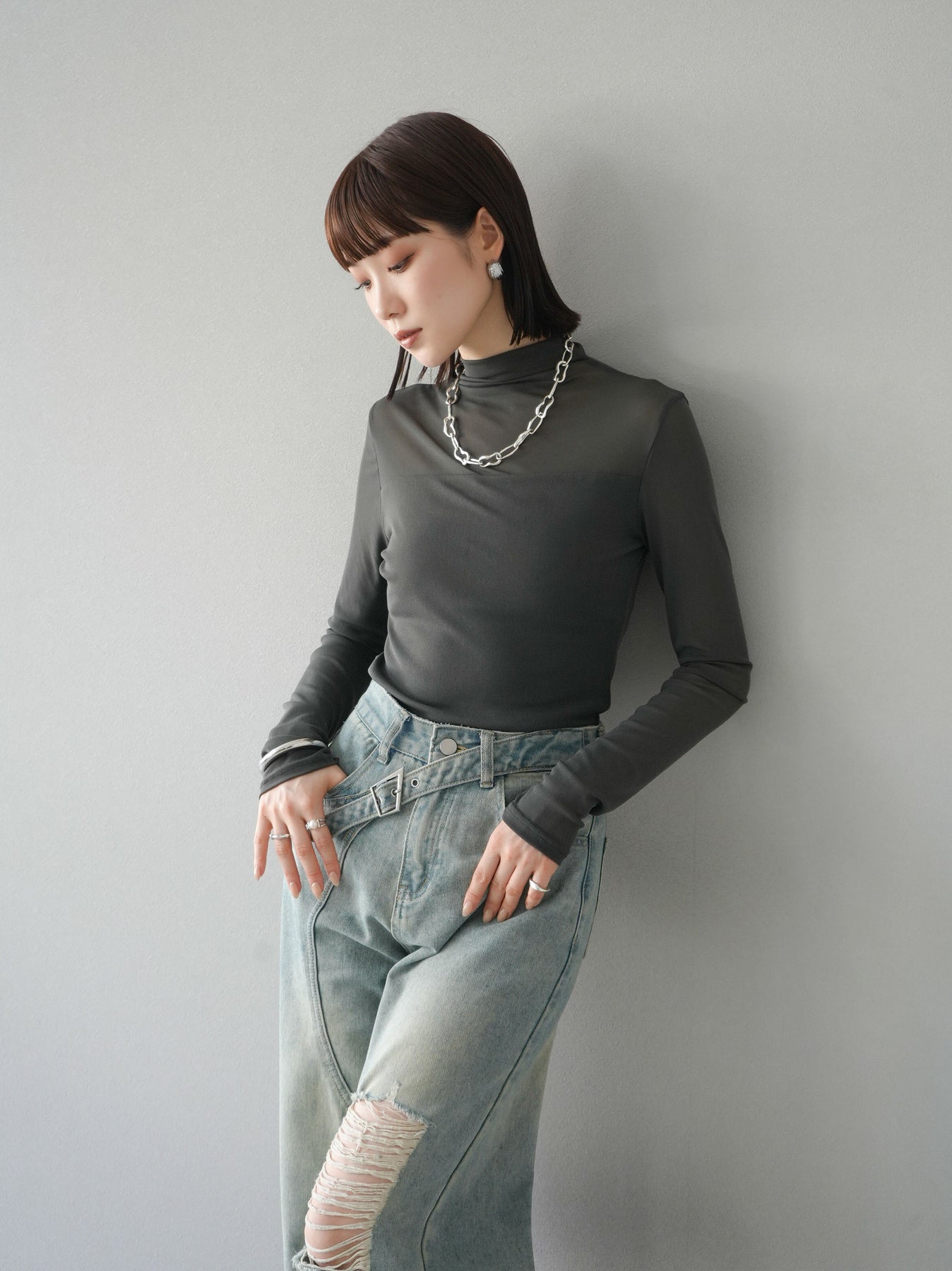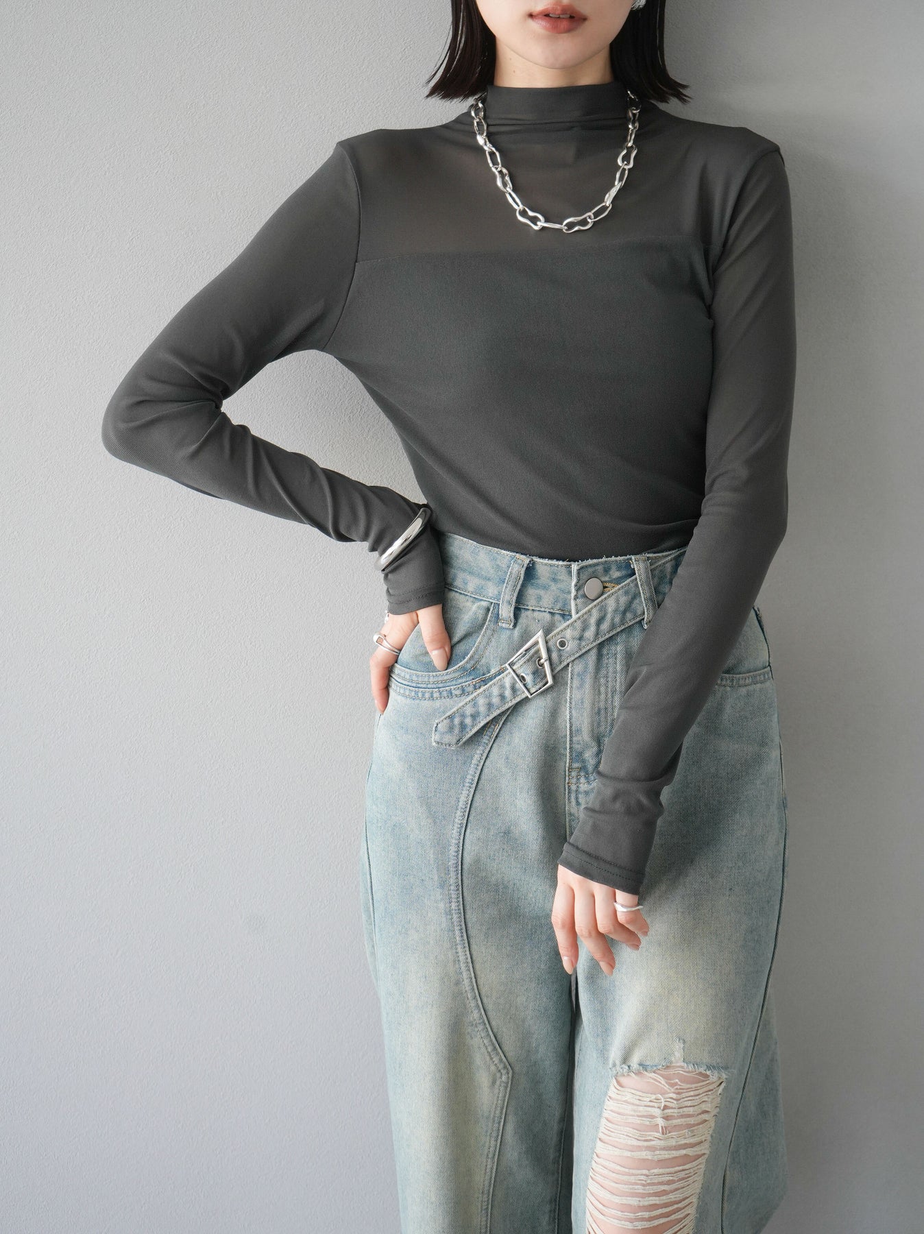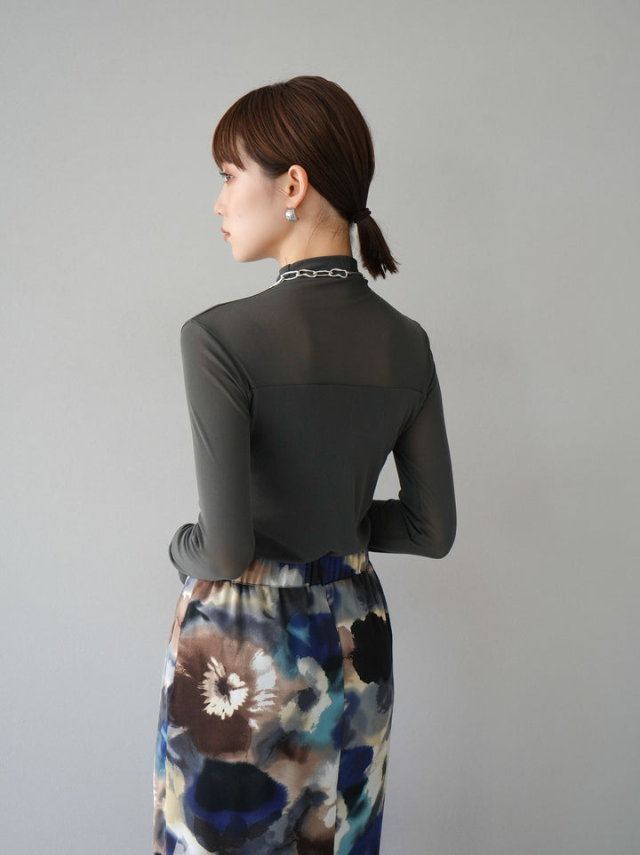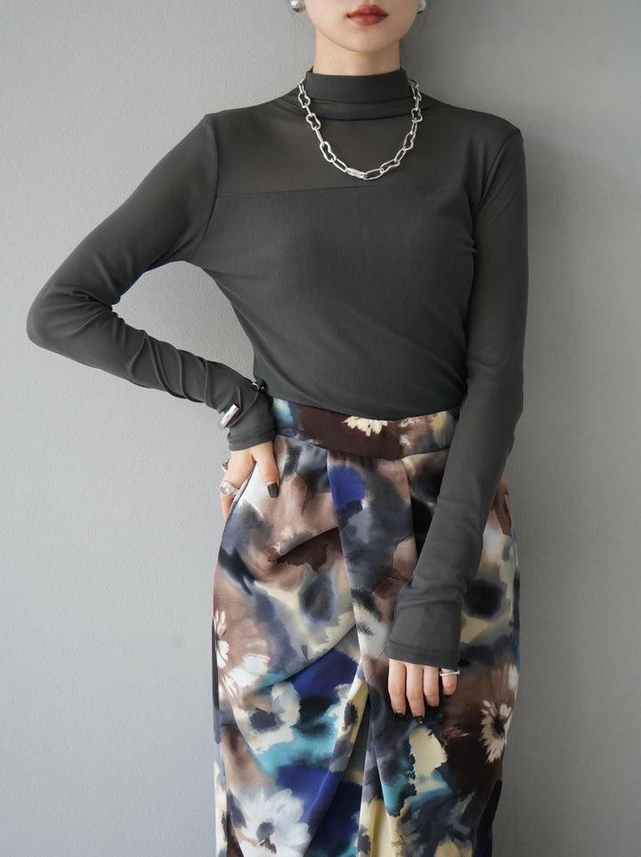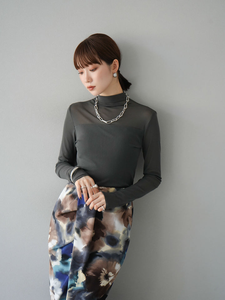 [予約]シアー切替ストレッチ長袖トップス/チャコール