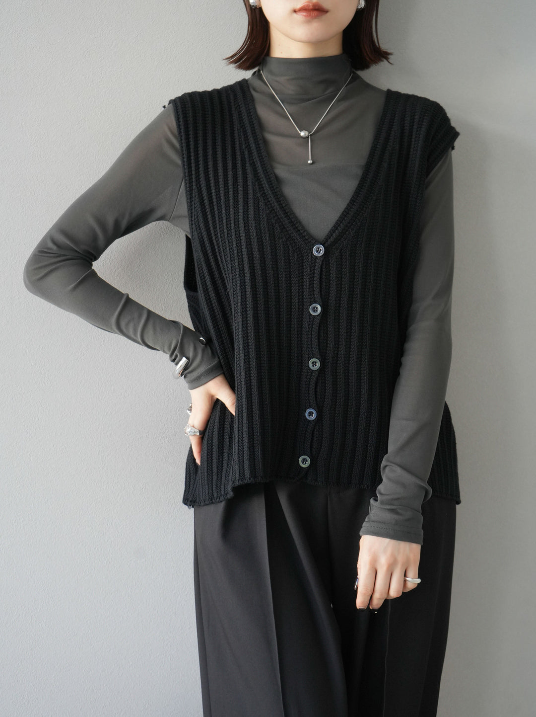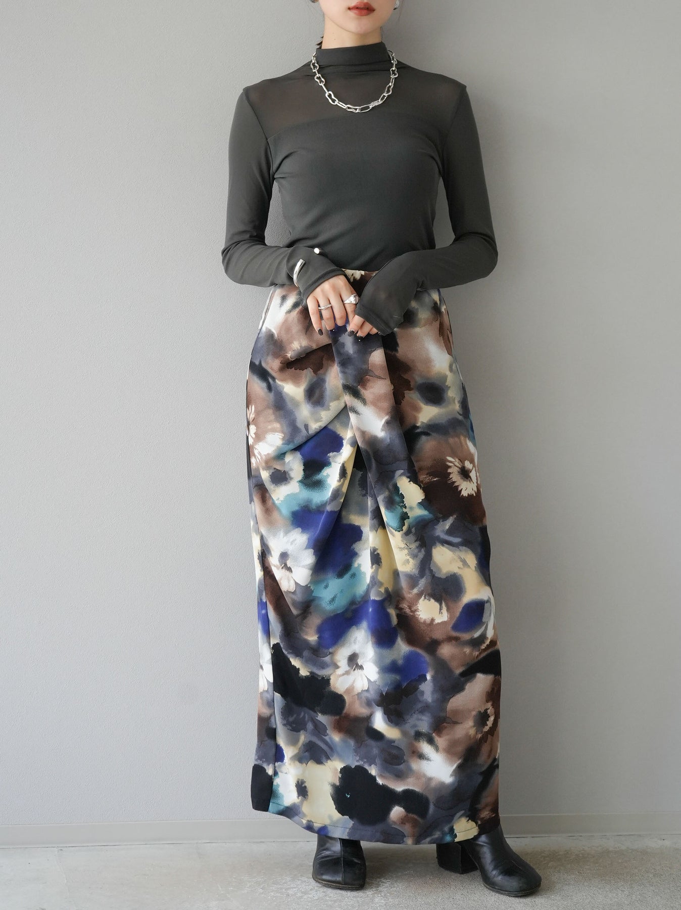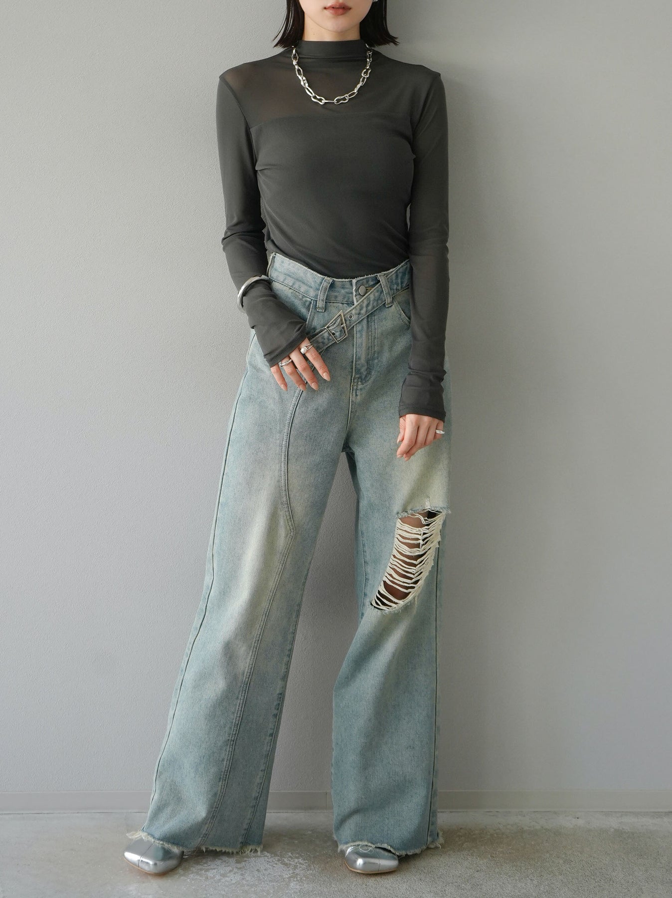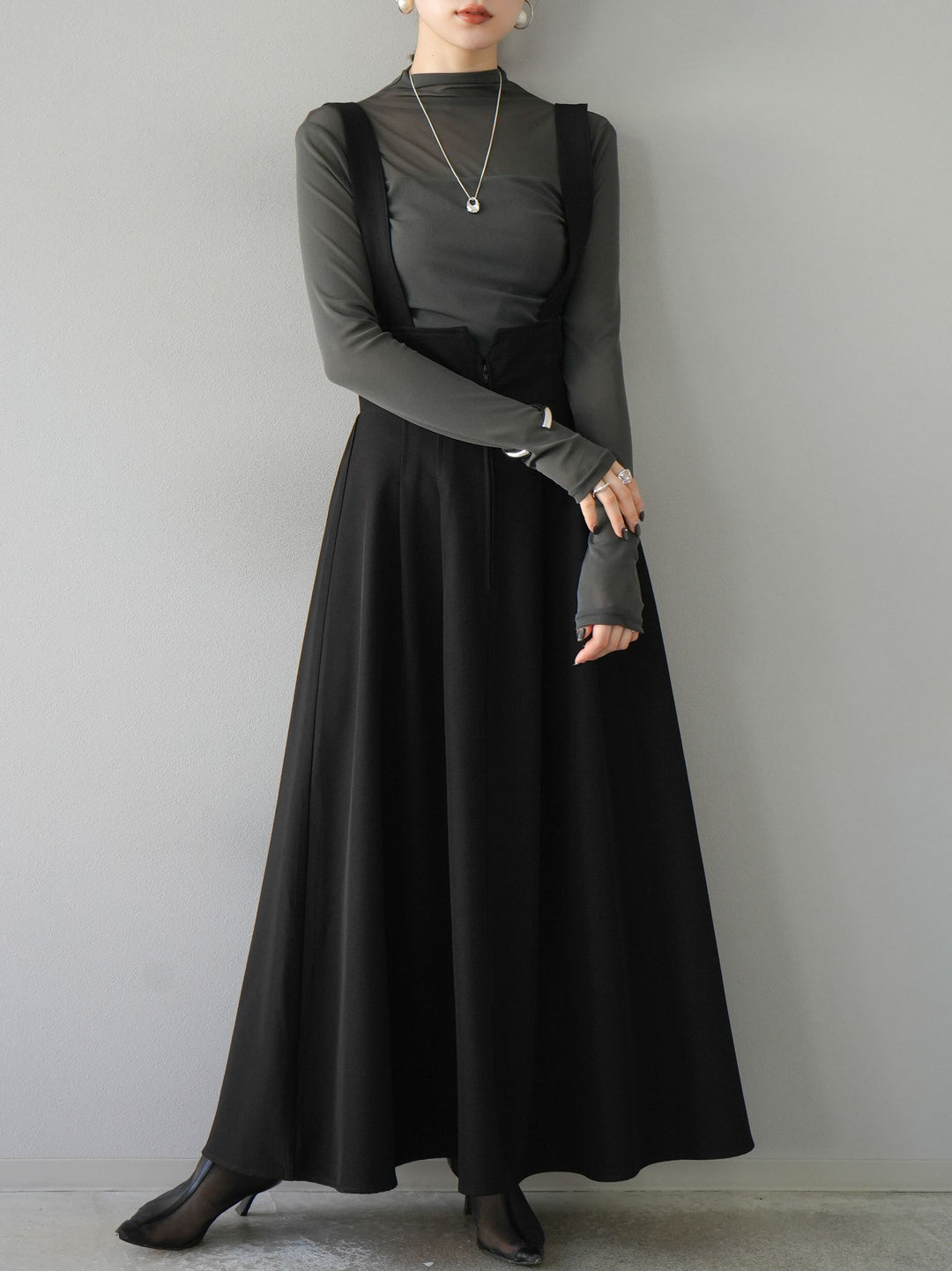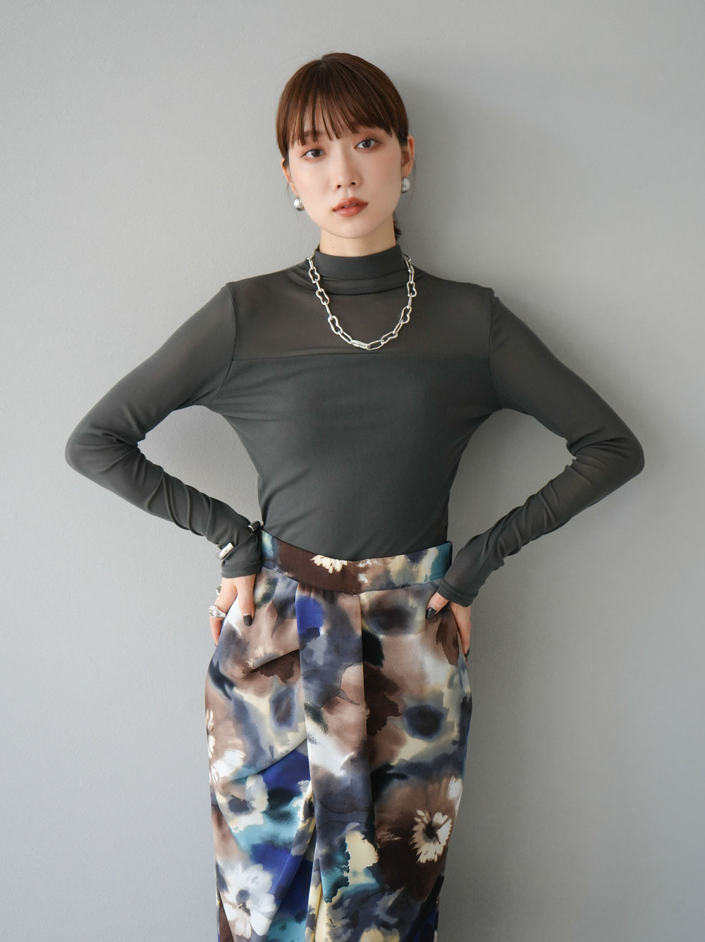 [予約]シアー切替ストレッチ長袖トップス/チャコール