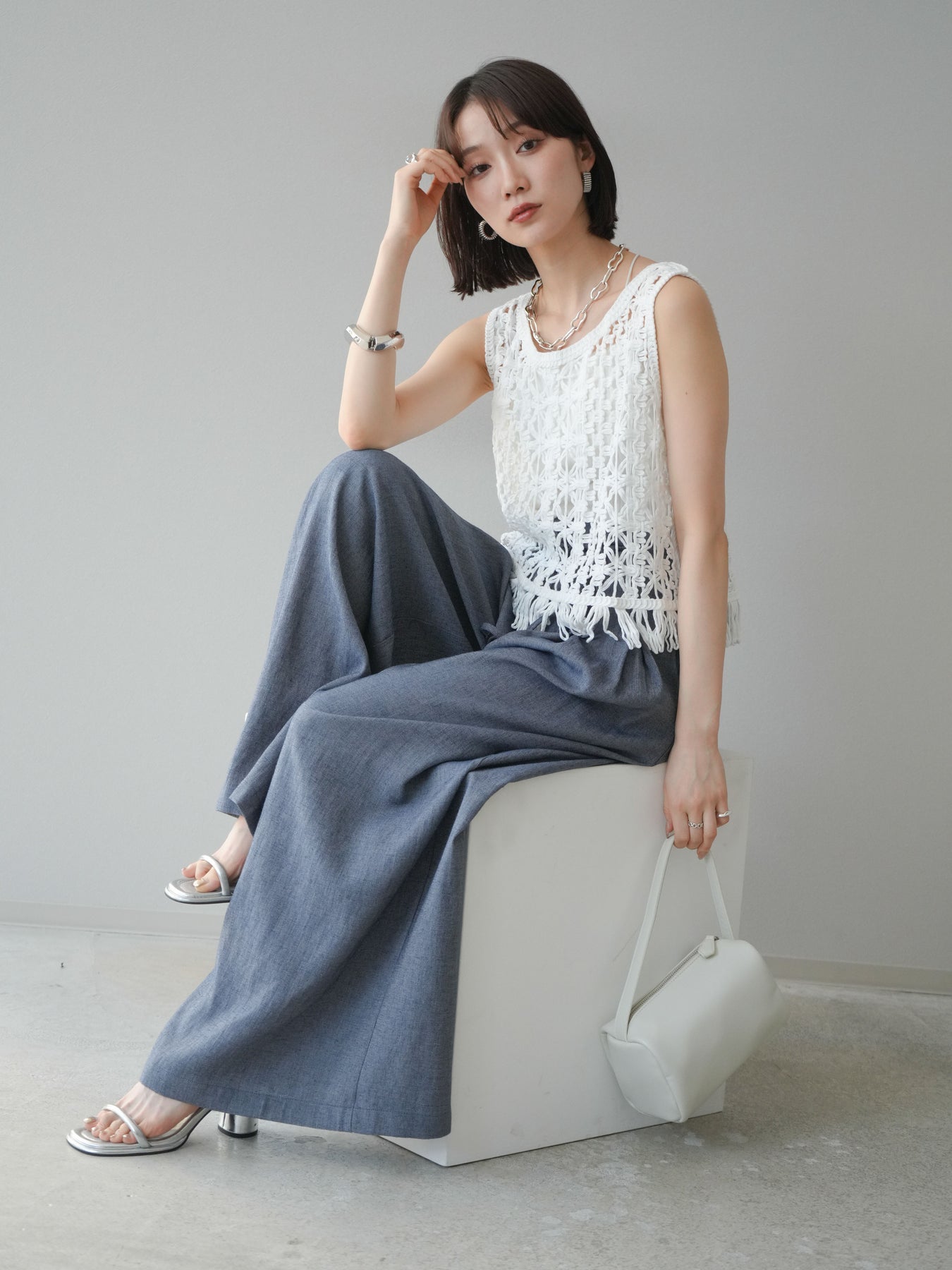 繊細なクロシェ編みが目を惹く、ナチュラルな雰囲気漂うフリンジ付きタンクトップ。裾にあしらわれたフリンジが軽やかな動きを加え、シンプルなコーディネートに抜け感をプラスします。通気性の良い編み地で、夏のレイヤードスタイルにぴったりな一着。キャミソールやワンピースとの重ね着はもちろん、Tシャツやシャツの上から重ねても◎。リゾートからデイリーまで、幅広いスタイリングに活躍する主役級のサマーニットです。 ※ボトムス、キャミソール(インナー)以外の商品は一律でインナーは付属していません。