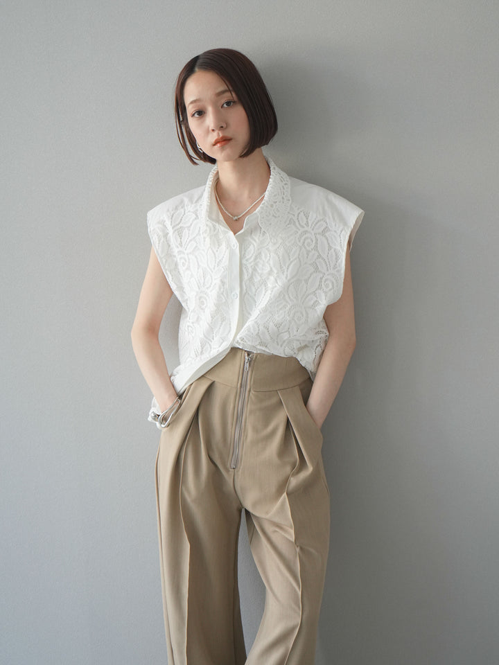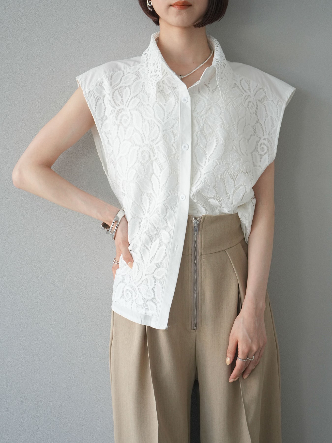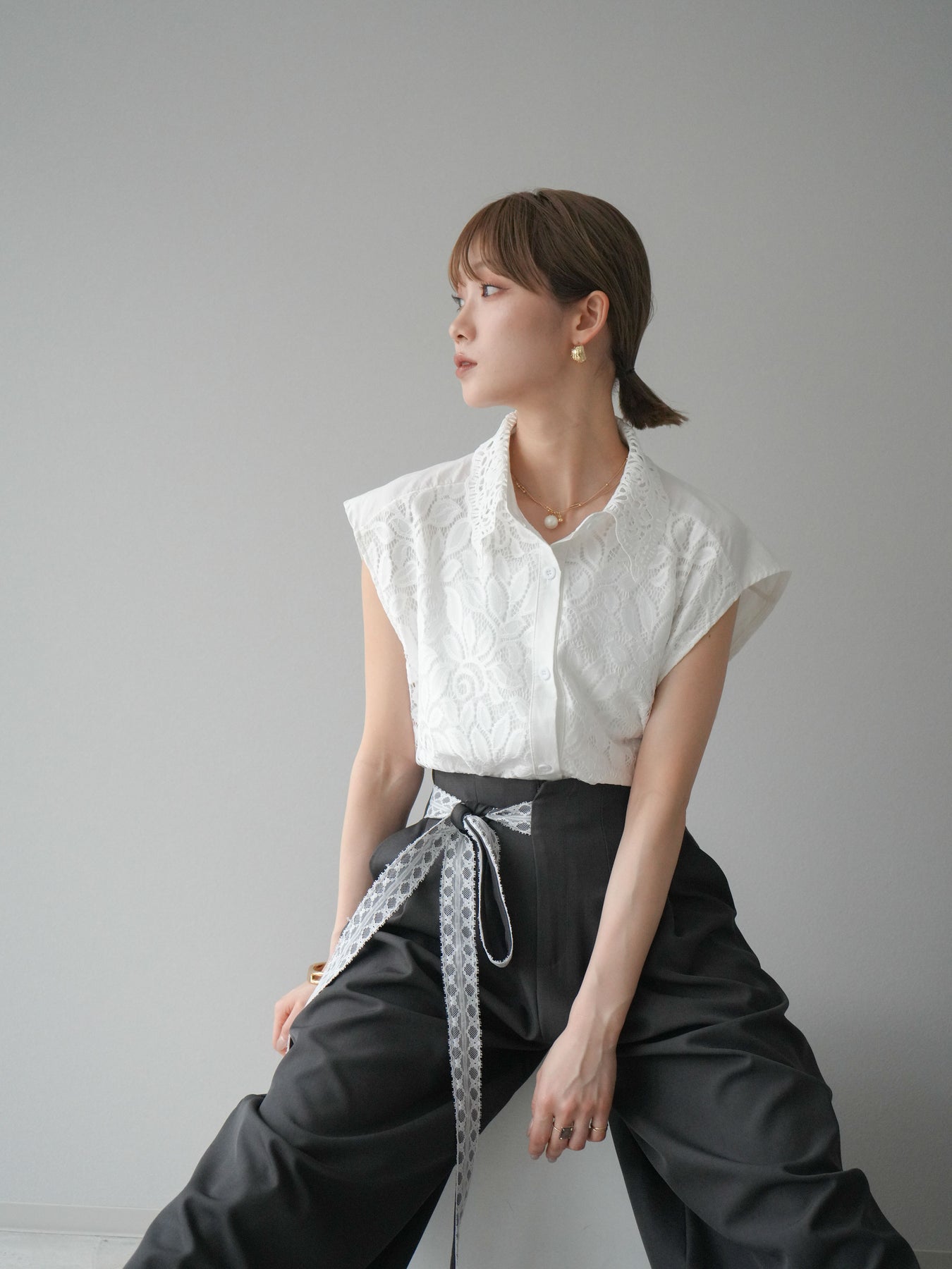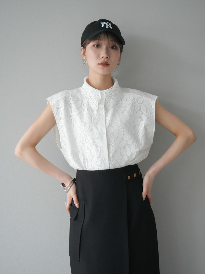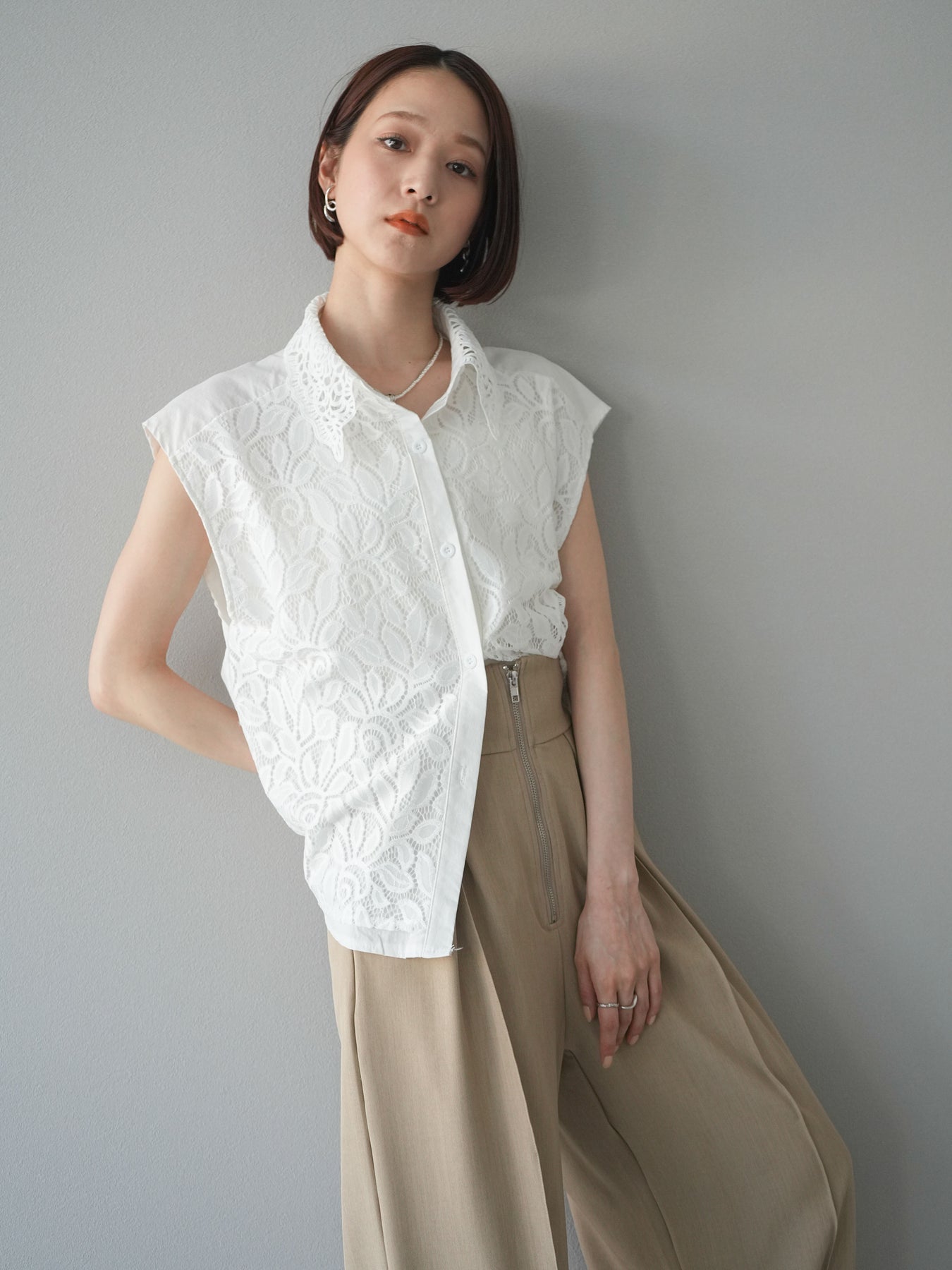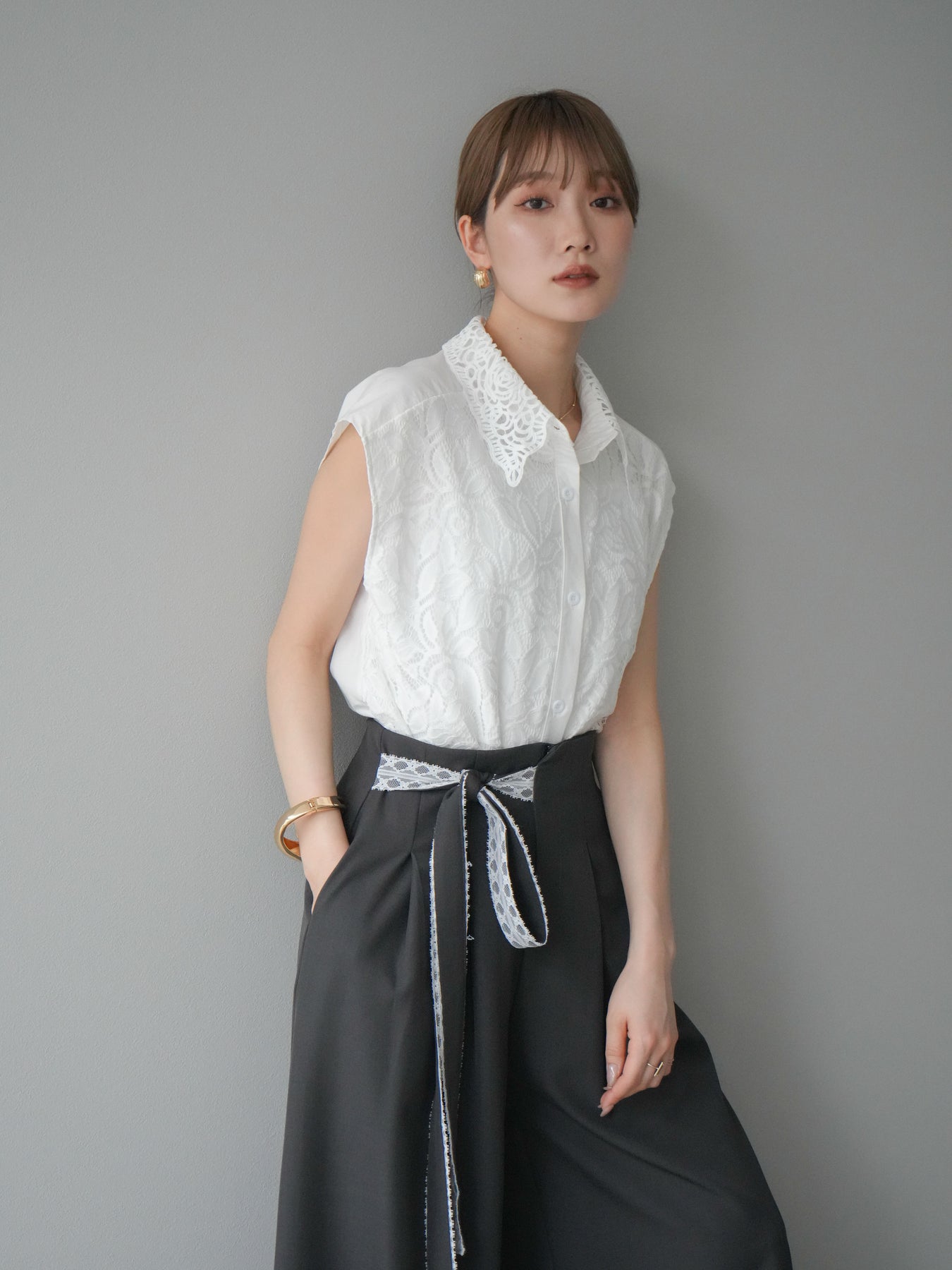 繊細なレースの襟が目を惹く、クラシカルなムード漂うノースリーブブラウス。身頃にも同系色のレースを贅沢にあしらい、涼しげながらも上品な印象に仕上げました。程よくゆとりのあるシルエットで、タンクトップやキャミとのレイヤードも楽しめるアイテム。トレンドのレーススタイルを大人っぽく着こなせます。 ※ボトムス、キャミソール(インナー)以外の商品は一律でインナーは付属していません