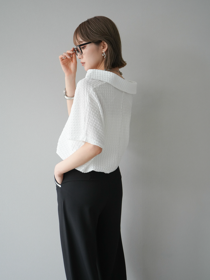 立体感のあるウェーブ柄が目を惹く襟付きプルオーバー。さらりと軽やかな素材感で、夏のレイヤードにも最適な一枚です。裾のドロストでシルエット調整ができるので、スタイリングにアクセントを加えられるのも魅力。程よくゆとりのあるシルエットで、抜け感のある大人カジュアルを演出します。トレンドライクな雰囲気と着心地の良さを両立したアイテムです。 ※ボトムス、キャミソール(インナー)以外の商品は一律でインナーは付属していません