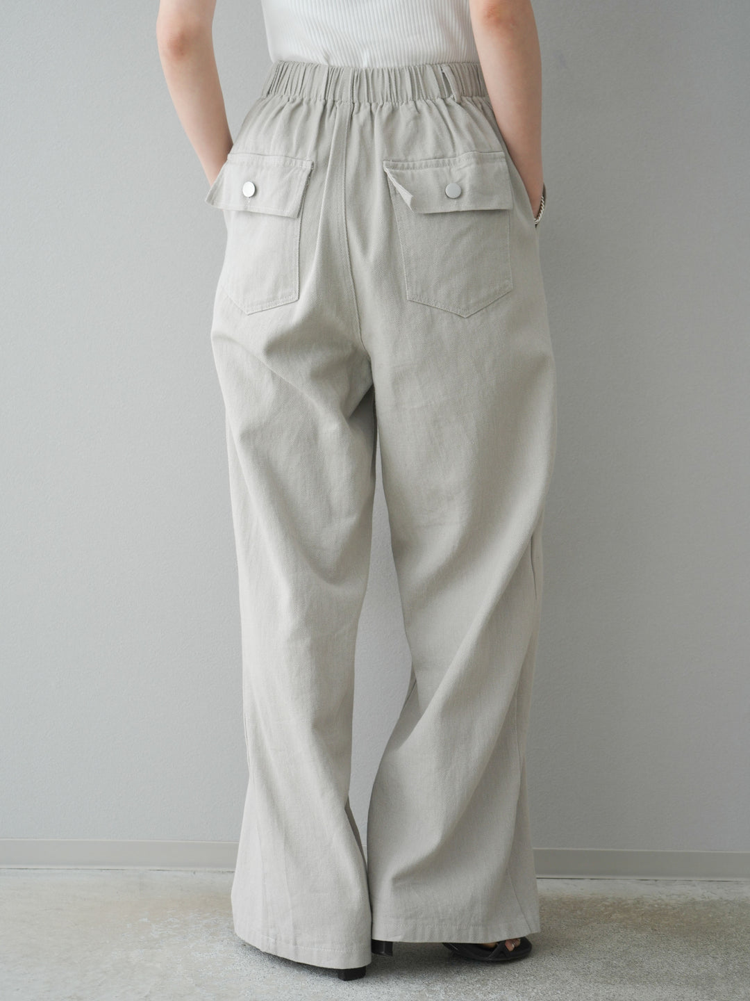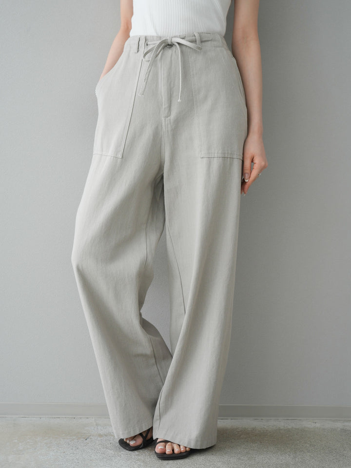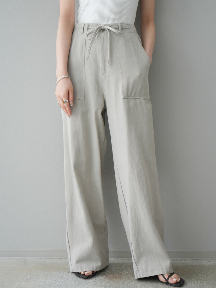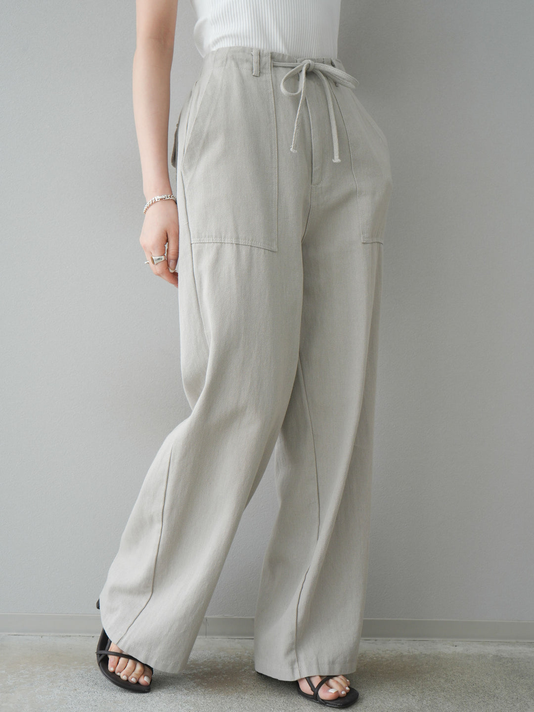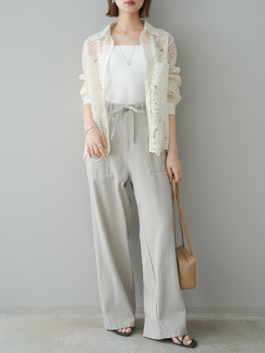 トレンドのカーゴデザインを取り入れた、リラクシーなワイドパンツ。程よくハリのあるコットン素材で、ナチュラルな風合いが魅力です。ウエストのドローストリング仕様で、フィット感の調整が可能。大きめのポケットがアクセントになり、実用性も◎。カジュアルながらも洗練されたシルエットで、Tシャツやブラウスと合わせるだけで旬のスタイリングが完成します。 ※ボトムス、キャミソール(インナー)以外の商品は一律でインナーは付属していません