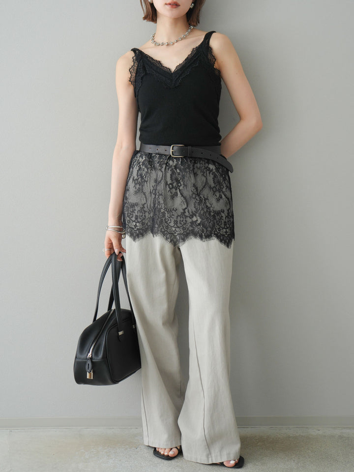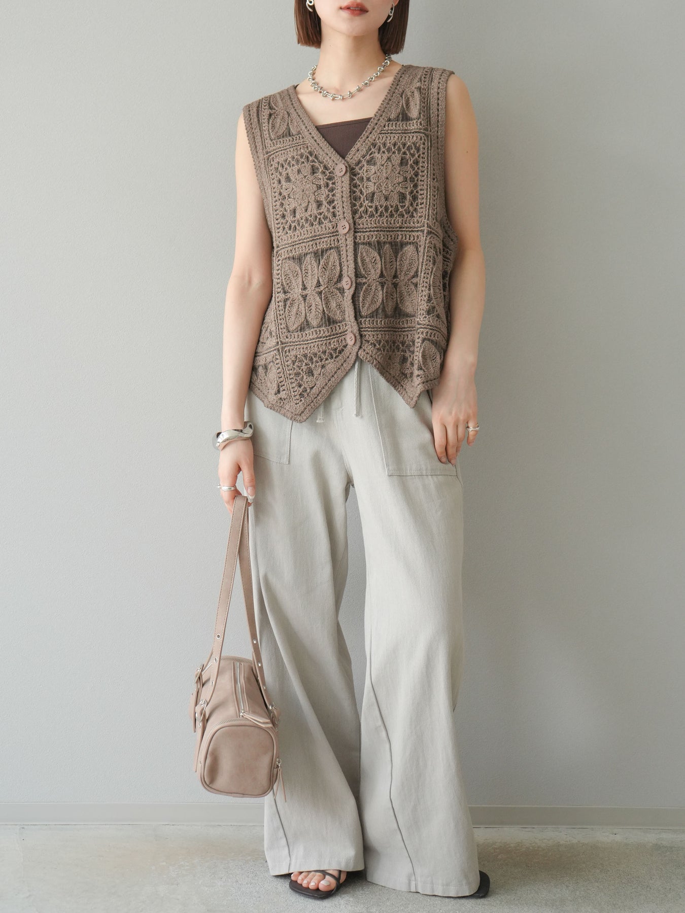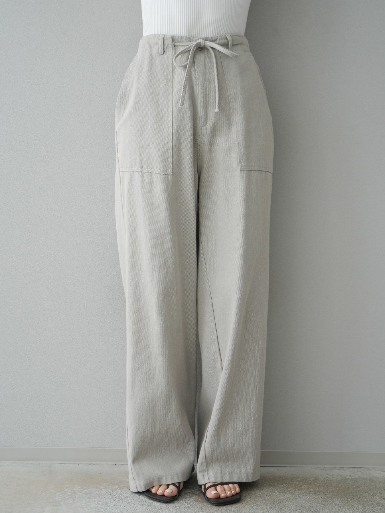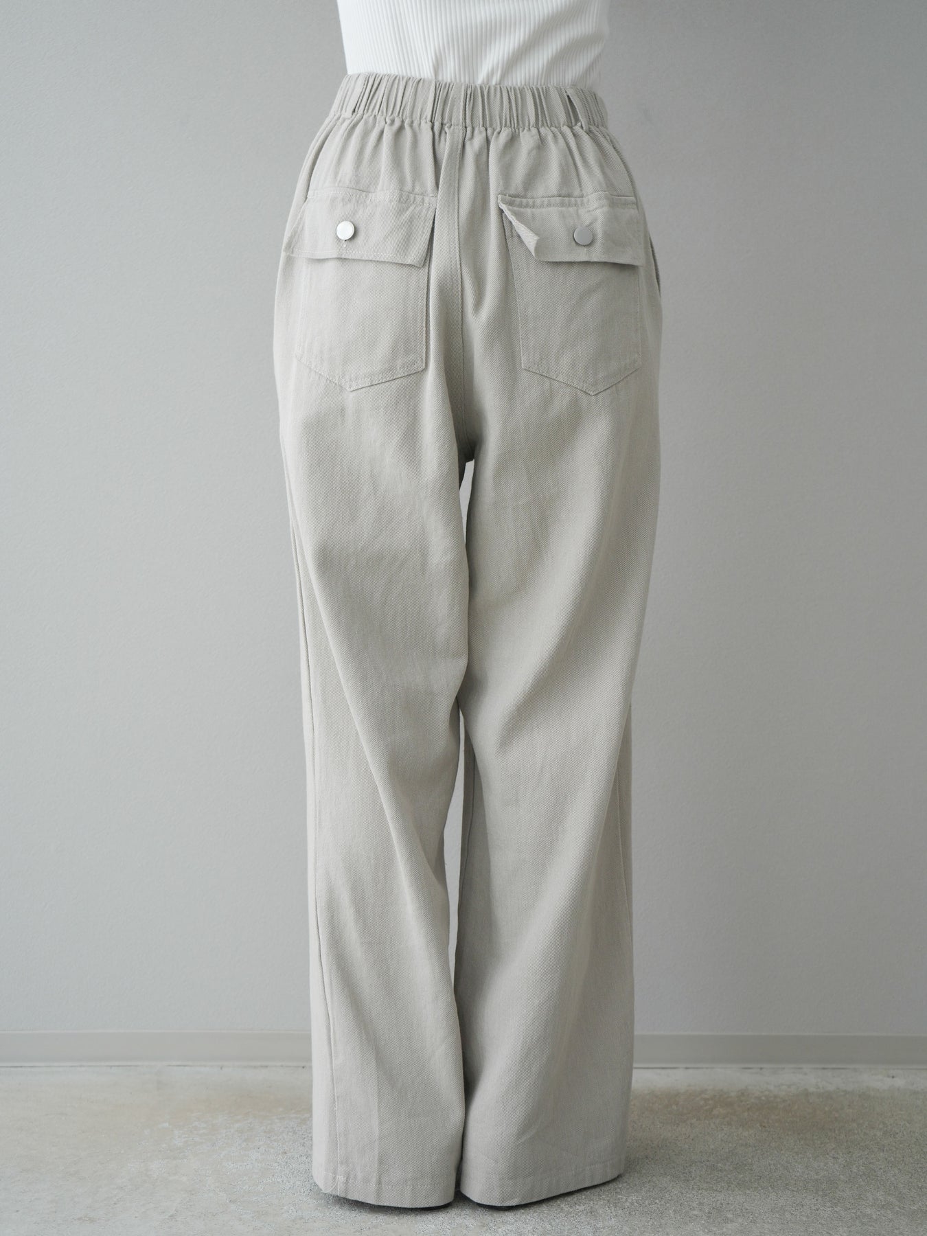 トレンドのカーゴデザインを取り入れた、リラクシーなワイドパンツ。程よくハリのあるコットン素材で、ナチュラルな風合いが魅力です。ウエストのドローストリング仕様で、フィット感の調整が可能。大きめのポケットがアクセントになり、実用性も◎。カジュアルながらも洗練されたシルエットで、Tシャツやブラウスと合わせるだけで旬のスタイリングが完成します。 ※ボトムス、キャミソール(インナー)以外の商品は一律でインナーは付属していません