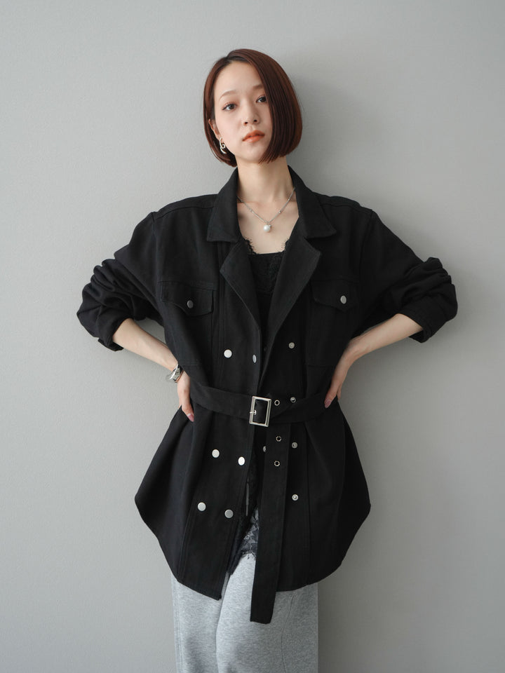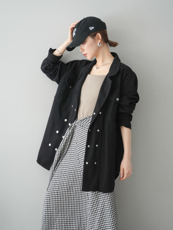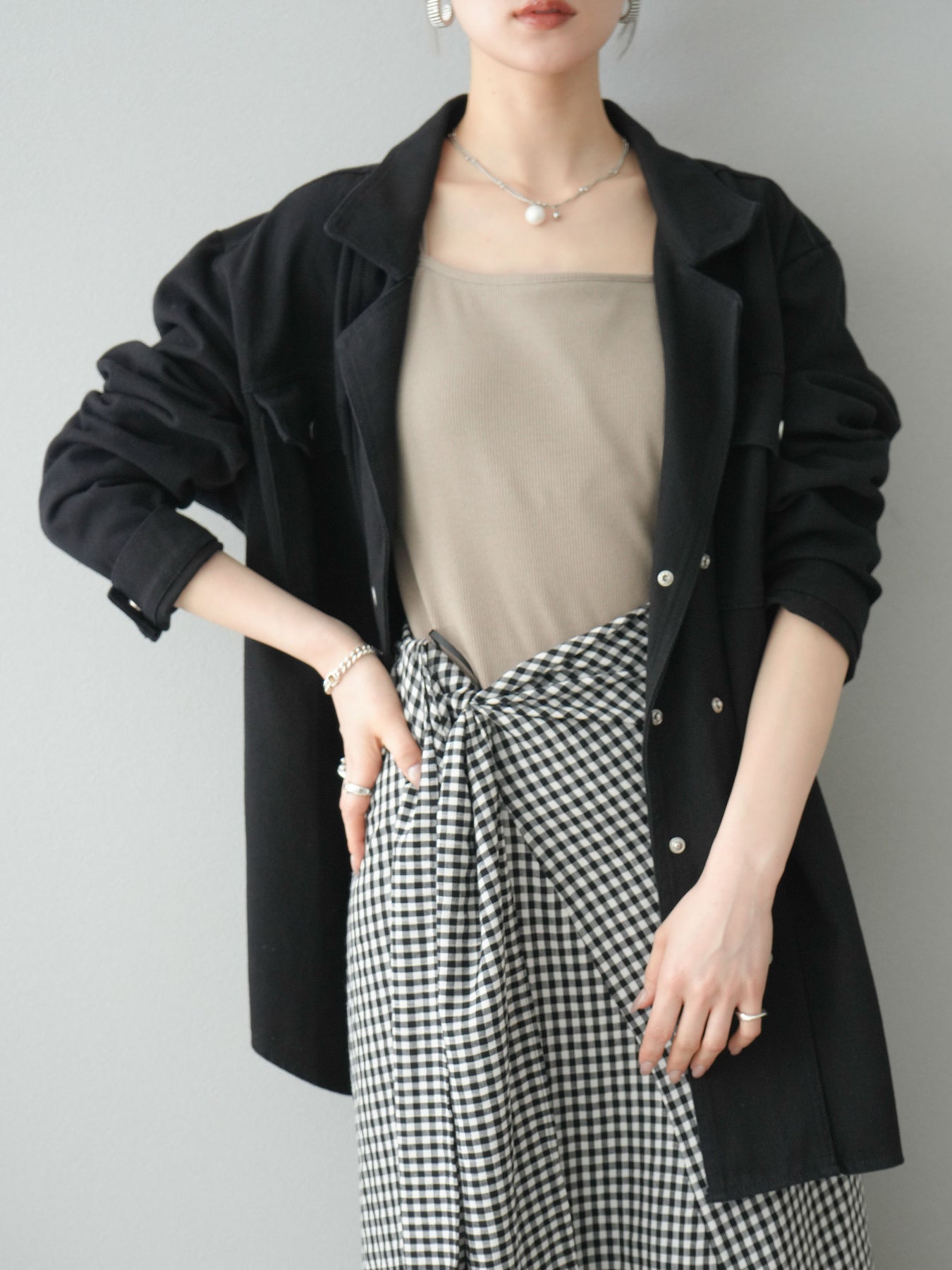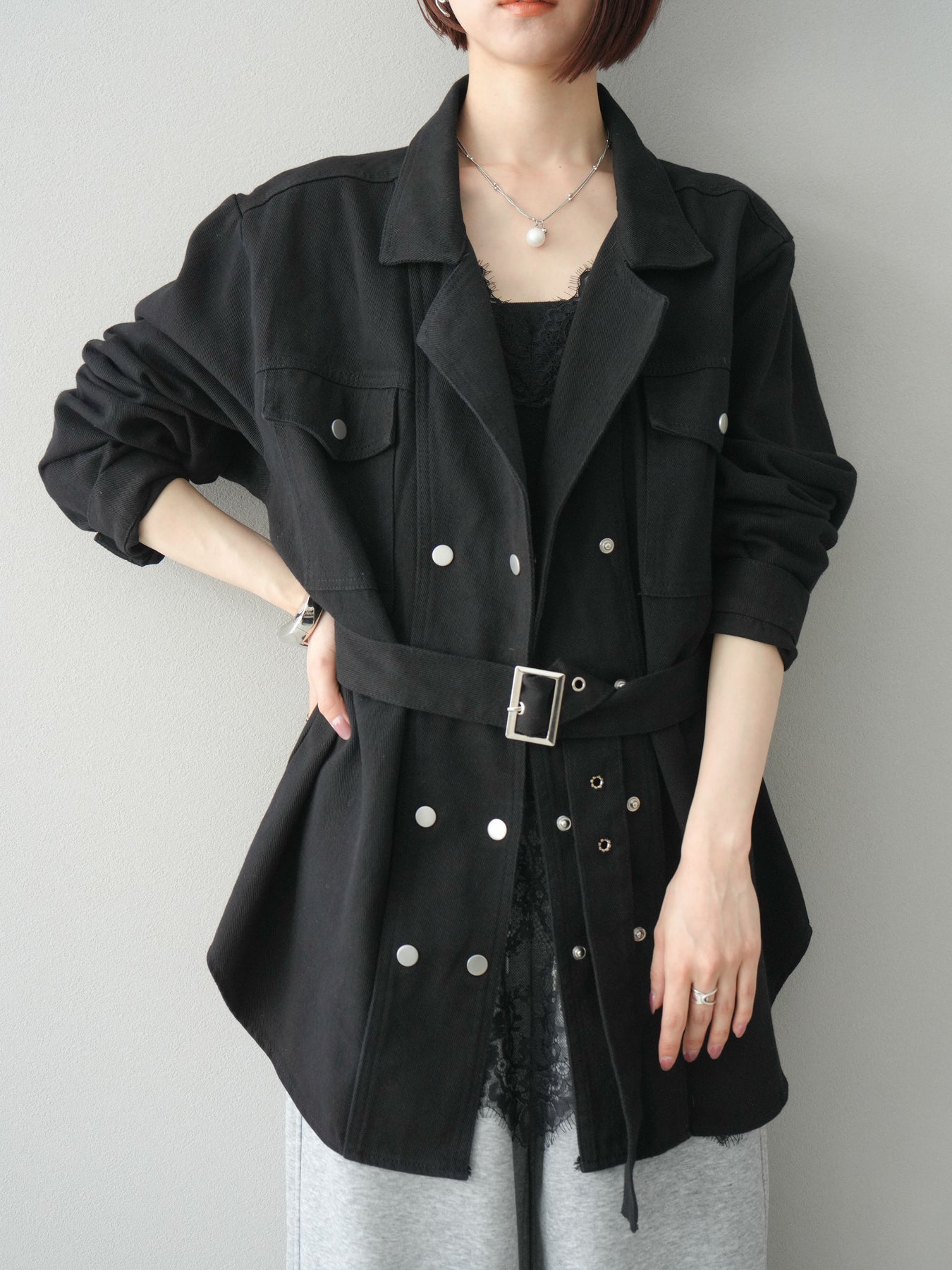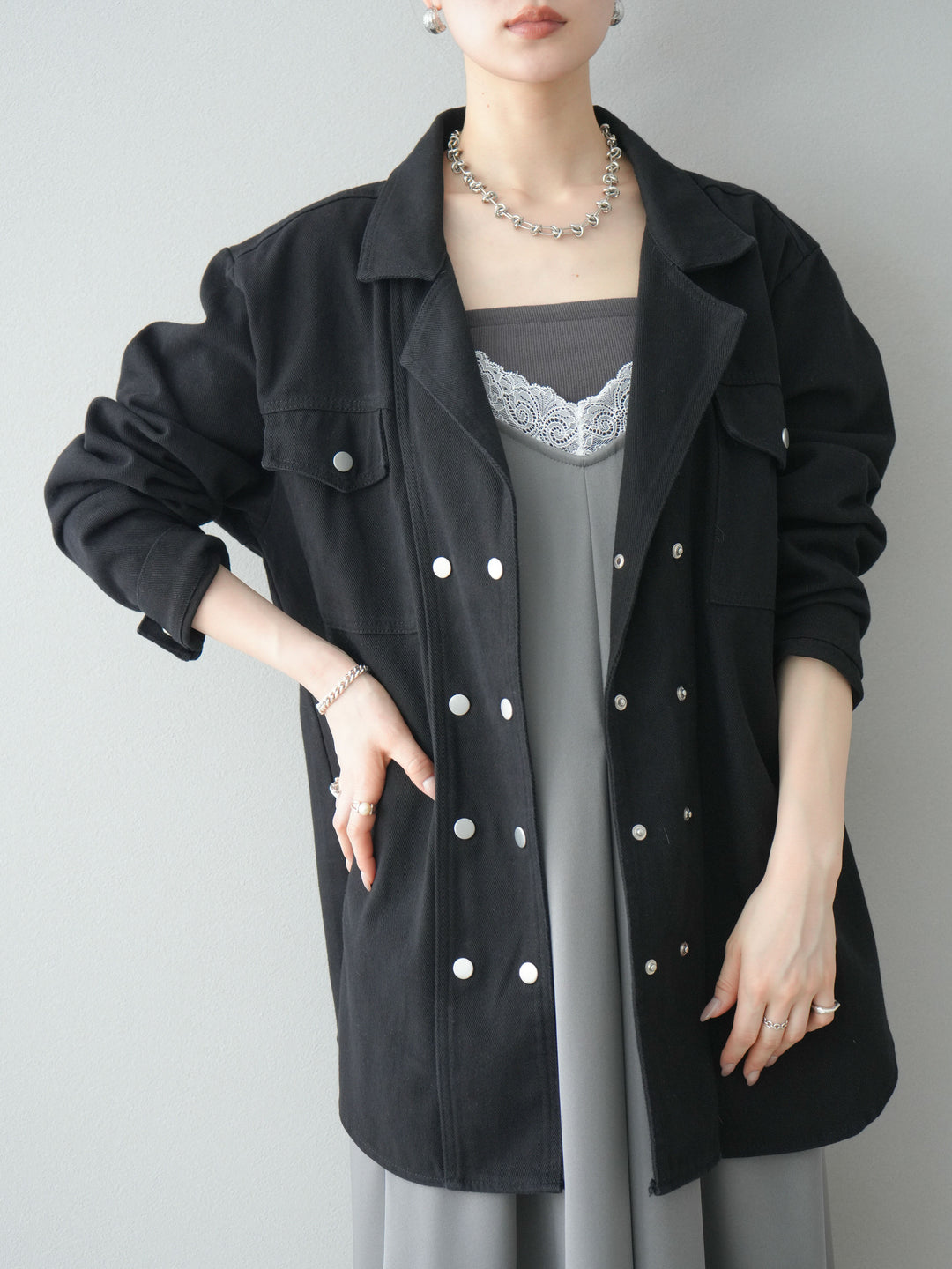 程よいハリ感のあるコットンツイル素材を使用した、トレンドライクなダブルボタンジャケット。ゆったりとしたシルエットでラフに羽織れ、こなれ感のある着こなしを叶えます。長めの着丈が体型カバーにも◎。デニムやスカートとも相性がよく、ロングシーズン活躍する一枚です。 ※ボトムス、キャミソール(インナー)以外の商品は一律でインナーは付属していません。