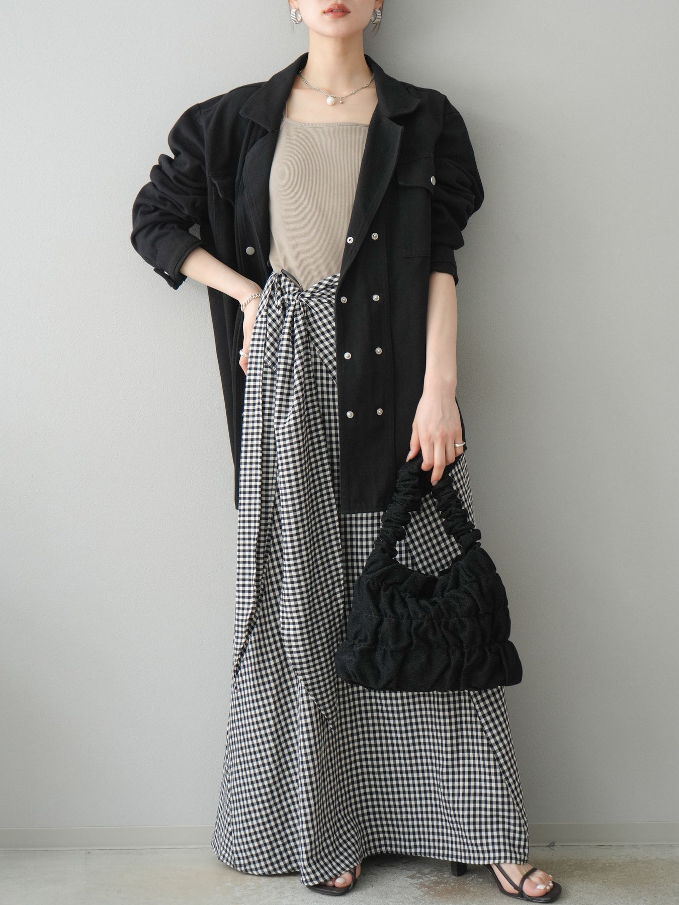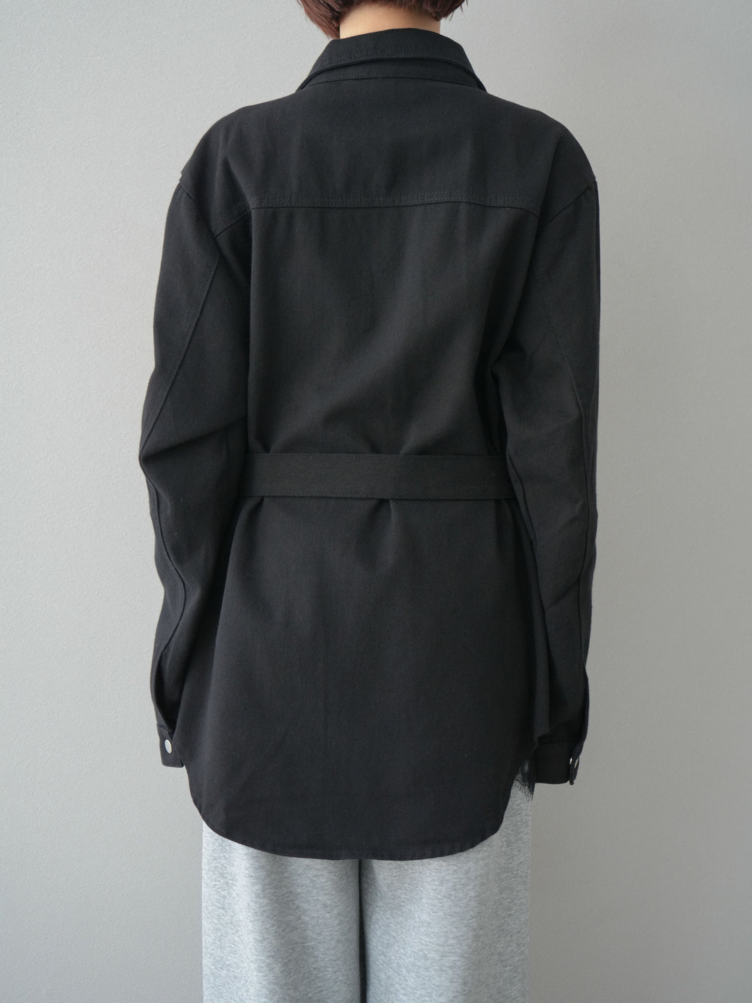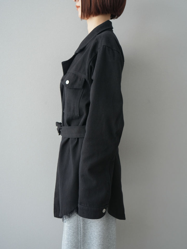 肩幅48cm バスト112cm AH49cm 袖丈61cm 袖口23cm フロント着丈73cm バック着丈80cm 裏地なし 透け感なし 伸縮性なし フロントポケットあり ベルト全長125cm