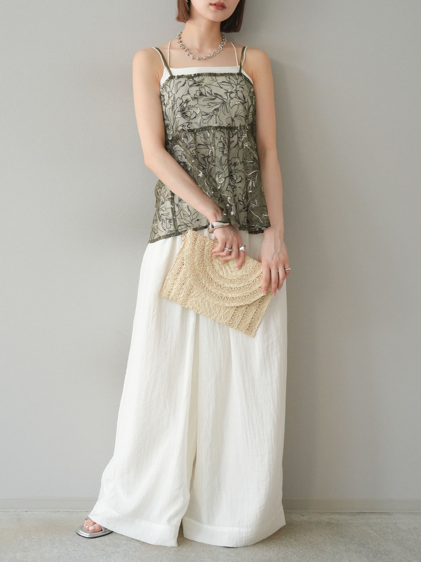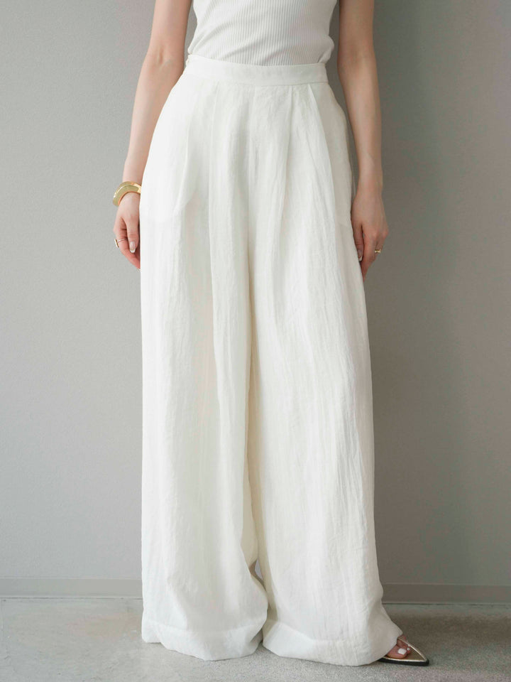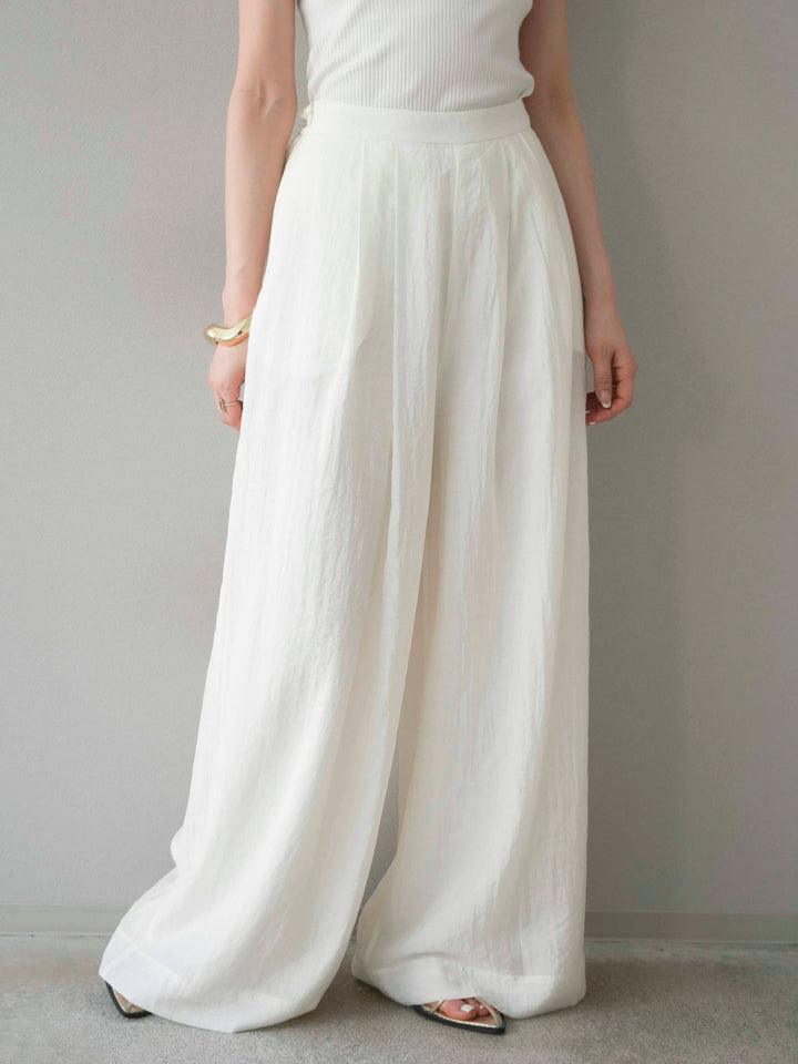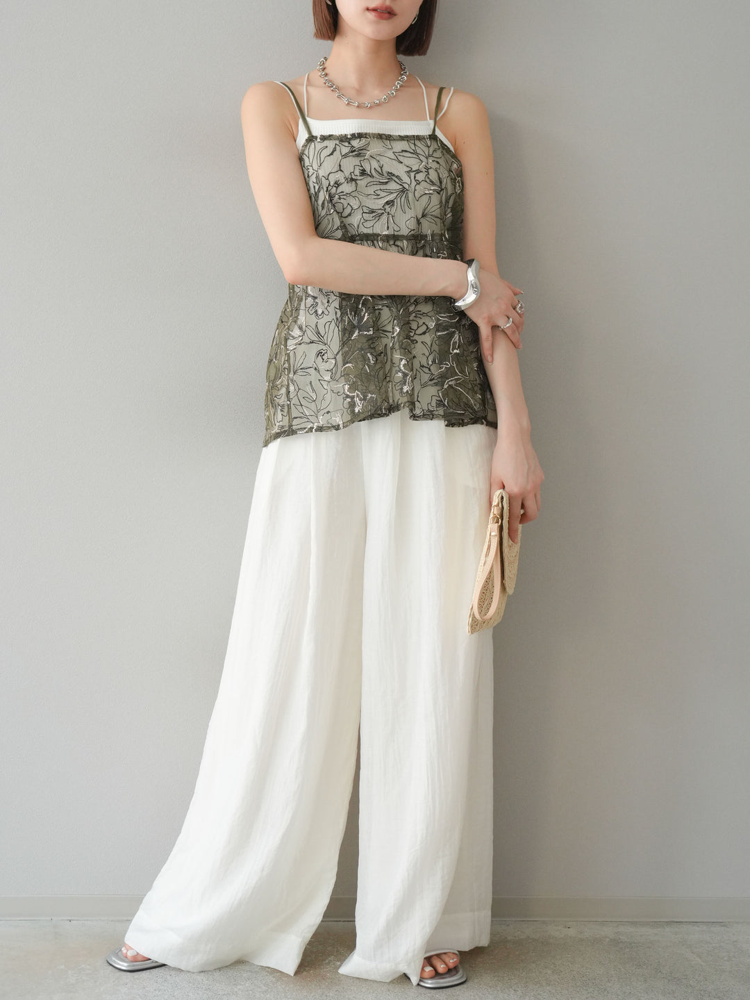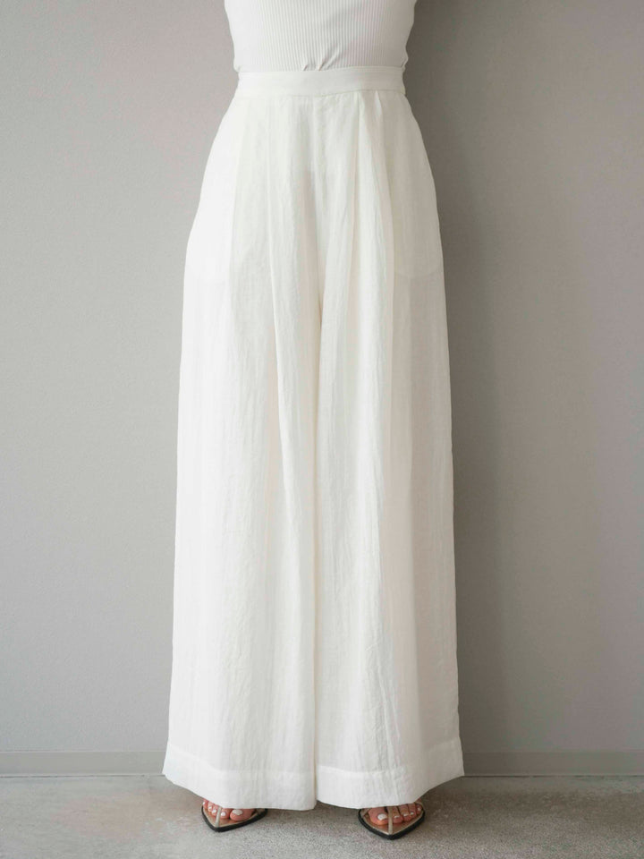 軽やかなシアー素材がトレンド感を引き立てるワイドパンツ。動くたびにふんわりと揺れるシルエットが、女性らしさを演出します。ウエストはタックデザインを取り入れ、すっきりとしたラインをキープ。カジュアルなトップスと合わせてリラックス感のあるスタイルはもちろん、ブラウスやジャケットと合わせれば、上品なコーディネートも楽しめます。 ※ボトムス、キャミソール(インナー)以外の商品は一律でインナーは付属していません。