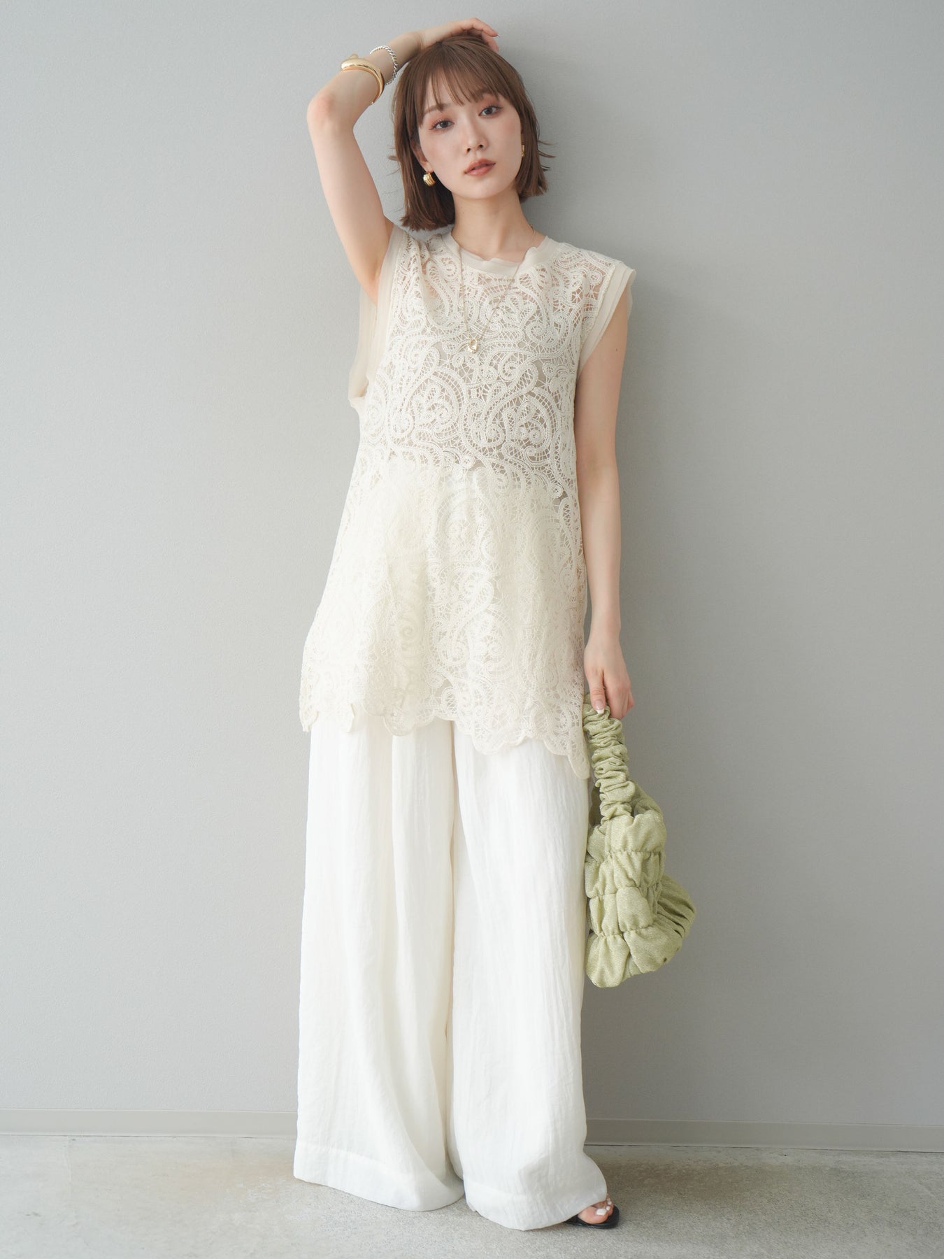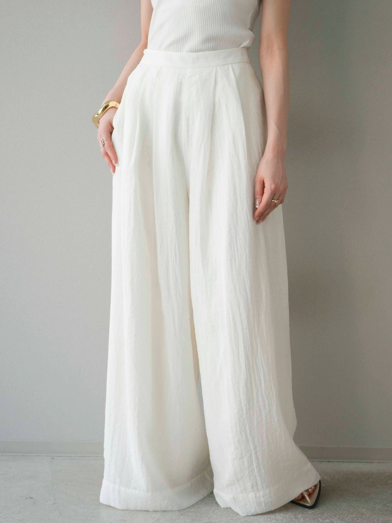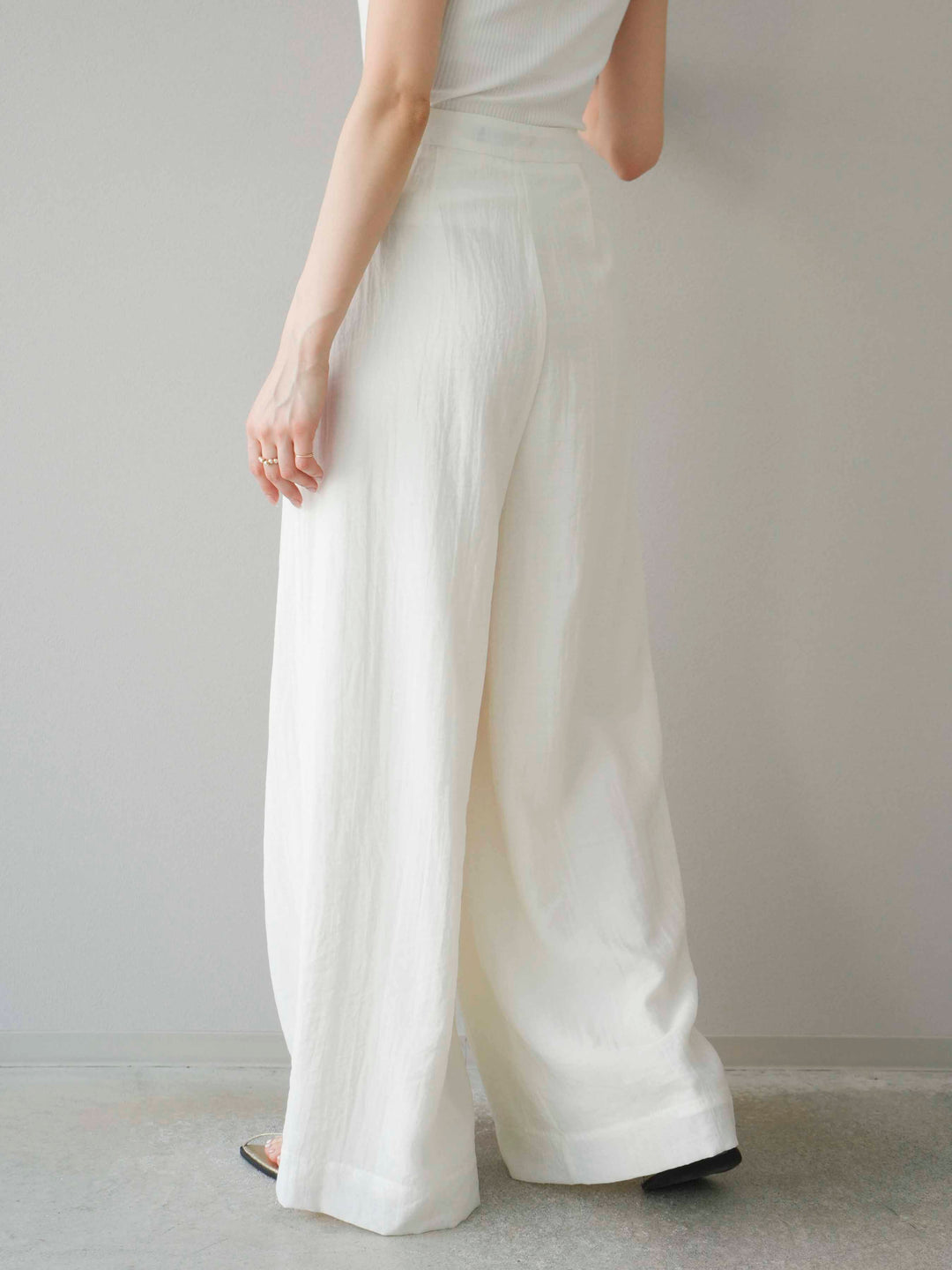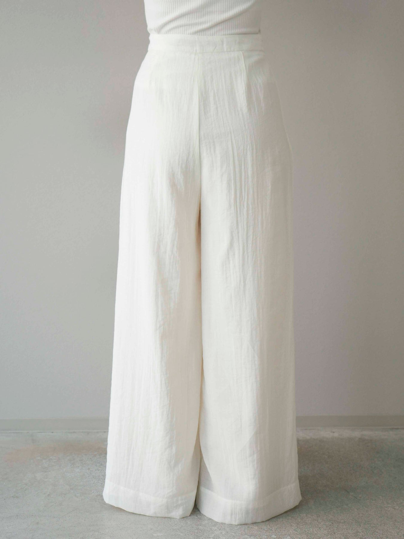 軽やかなシアー素材がトレンド感を引き立てるワイドパンツ。動くたびにふんわりと揺れるシルエットが、女性らしさを演出します。ウエストはタックデザインを取り入れ、すっきりとしたラインをキープ。カジュアルなトップスと合わせてリラックス感のあるスタイルはもちろん、ブラウスやジャケットと合わせれば、上品なコーディネートも楽しめます。 ※ボトムス、キャミソール(インナー)以外の商品は一律でインナーは付属していません。