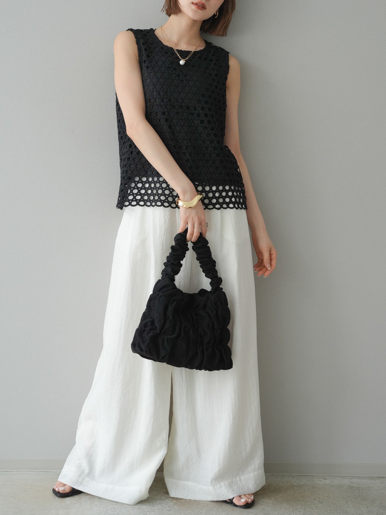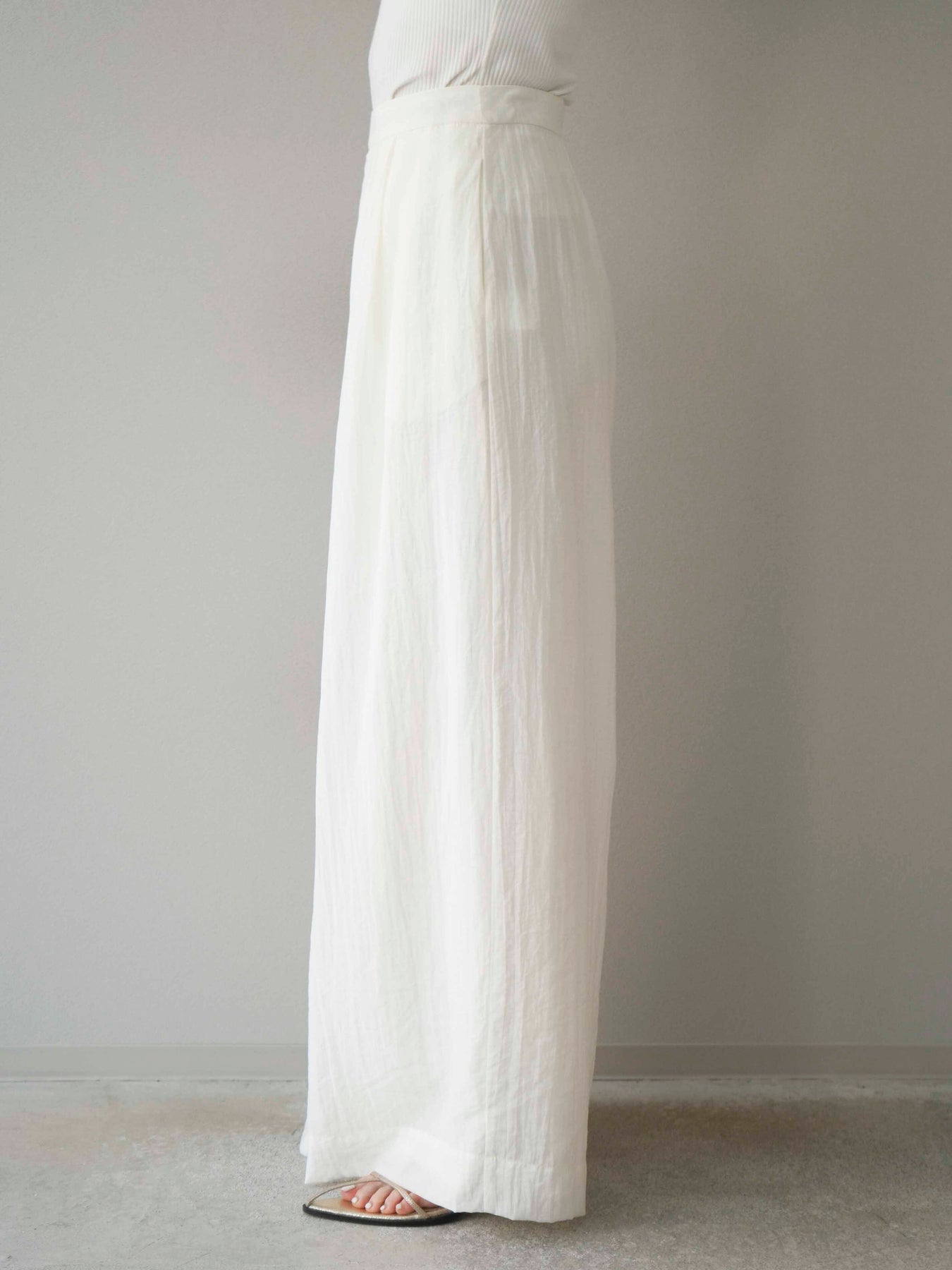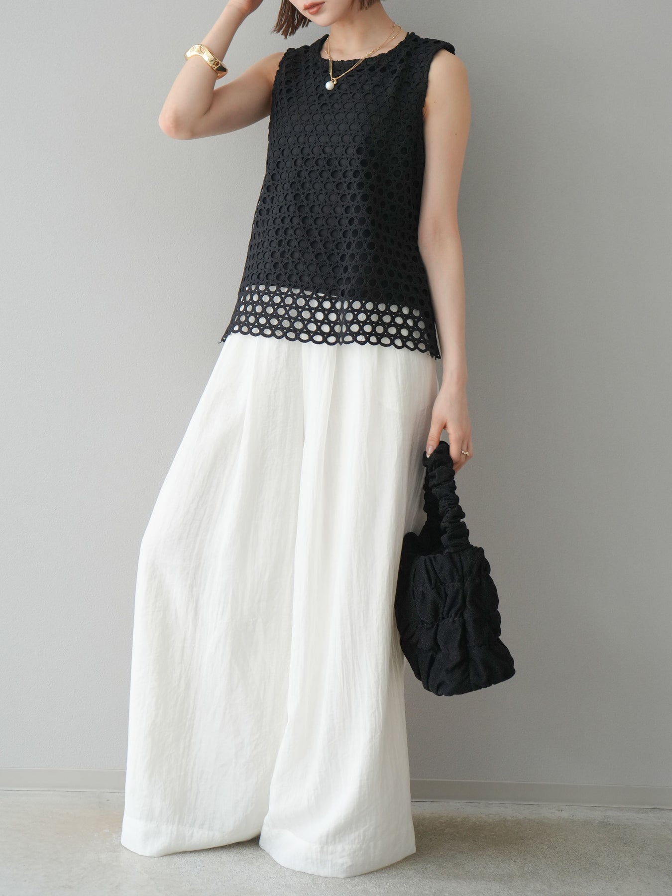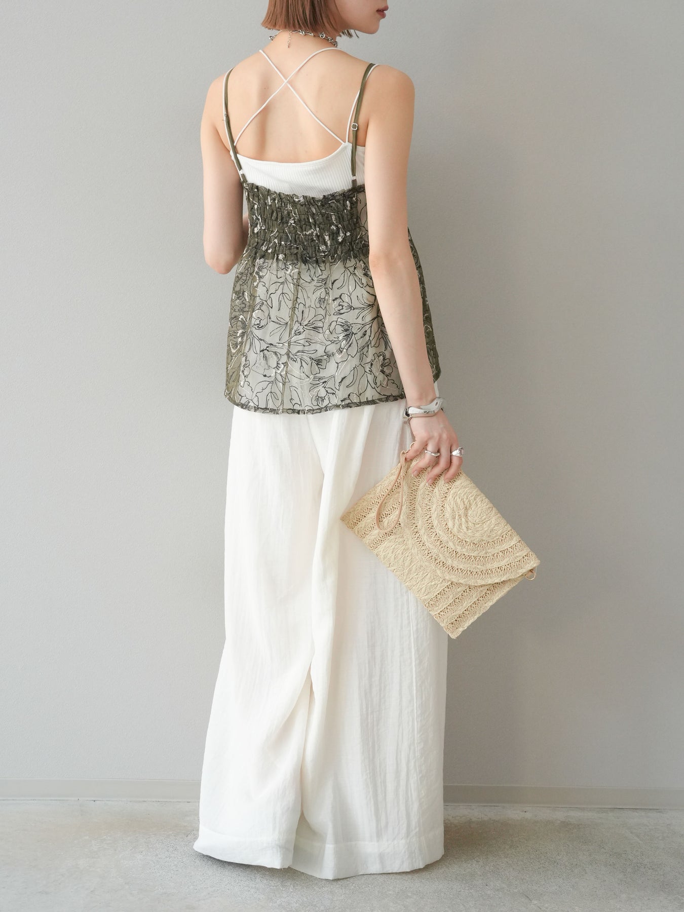 軽やかなシアー素材がトレンド感を引き立てるワイドパンツ。動くたびにふんわりと揺れるシルエットが、女性らしさを演出します。ウエストはタックデザインを取り入れ、すっきりとしたラインをキープ。カジュアルなトップスと合わせてリラックス感のあるスタイルはもちろん、ブラウスやジャケットと合わせれば、上品なコーディネートも楽しめます。 ※ボトムス、キャミソール(インナー)以外の商品は一律でインナーは付属していません。