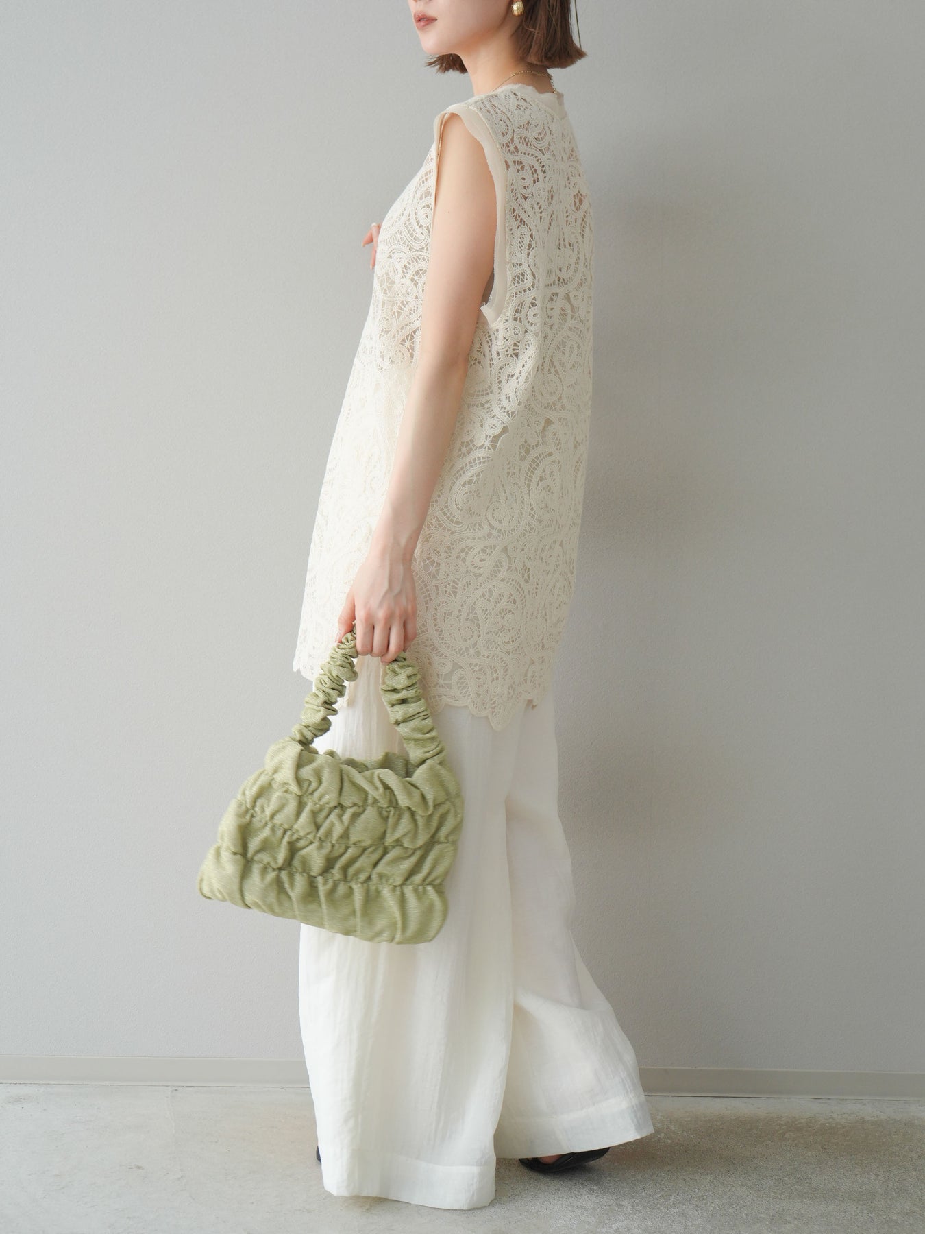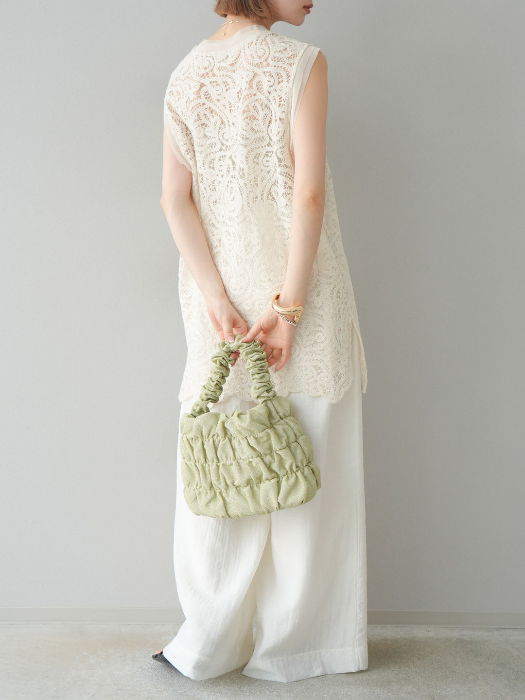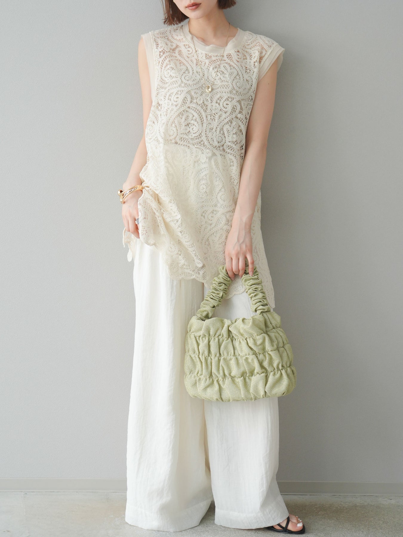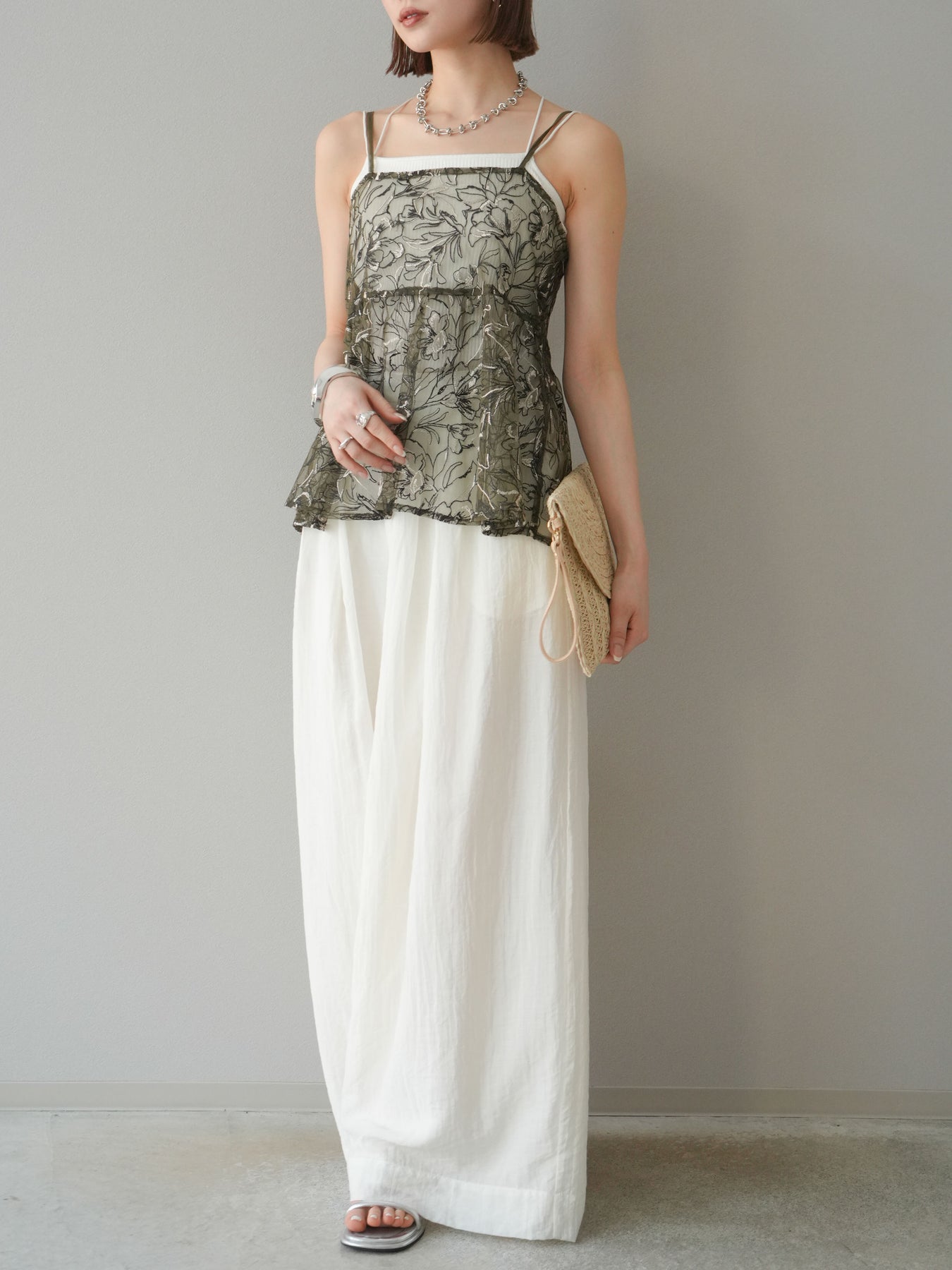 軽やかなシアー素材がトレンド感を引き立てるワイドパンツ。動くたびにふんわりと揺れるシルエットが、女性らしさを演出します。ウエストはタックデザインを取り入れ、すっきりとしたラインをキープ。カジュアルなトップスと合わせてリラックス感のあるスタイルはもちろん、ブラウスやジャケットと合わせれば、上品なコーディネートも楽しめます。 ※ボトムス、キャミソール(インナー)以外の商品は一律でインナーは付属していません。