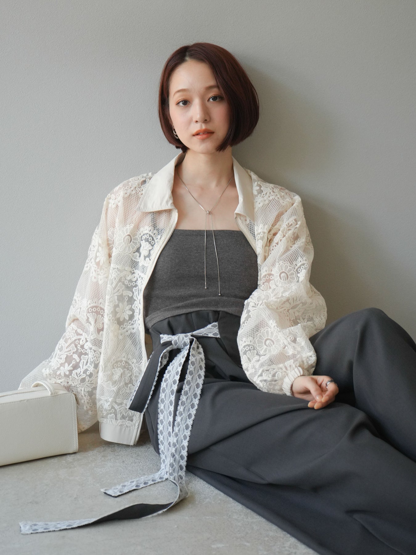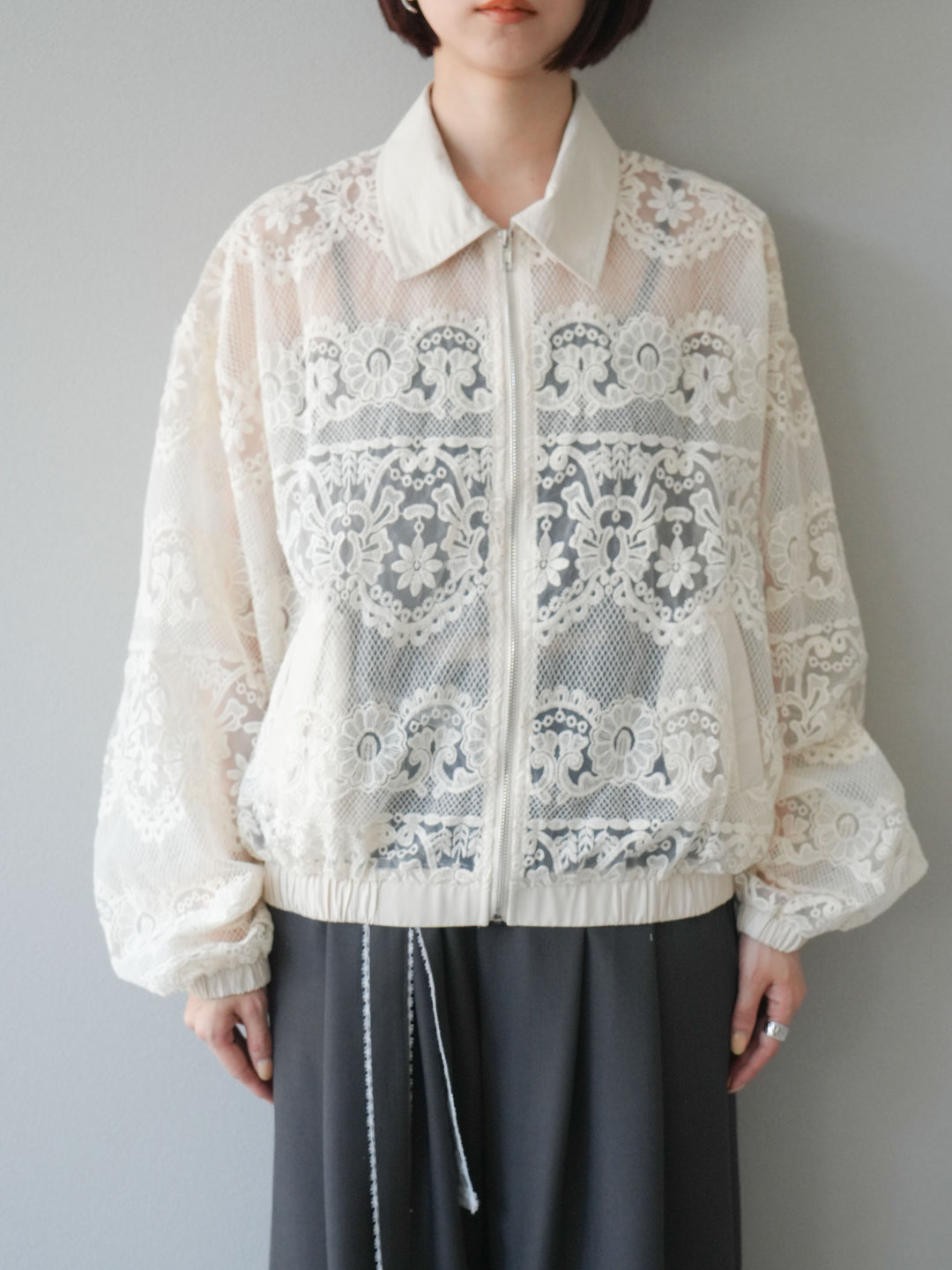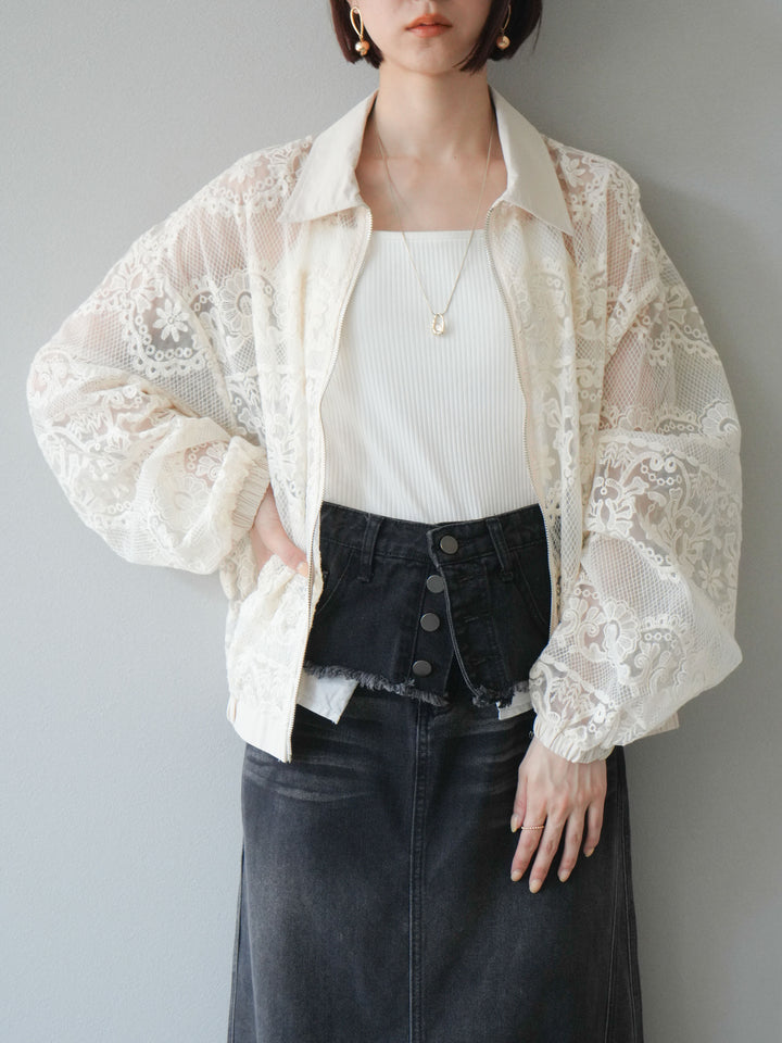繊細なレースで仕立てた、上品な抜け感が魅力のジップブルゾン。襟付きのきちんと感と、透け感のあるレースの軽やかさが好バランス。裾と袖口にはゴムが入っており、程よく立体感のあるシルエットを演出。フェミニンなスタイリングにも、カジュアルなコーデの外しアイテムとしても重宝します。羽織るだけで旬のスタイルが完成。 ※ボトムス、キャミソール(インナー)以外の商品は一律でインナーは付属していません