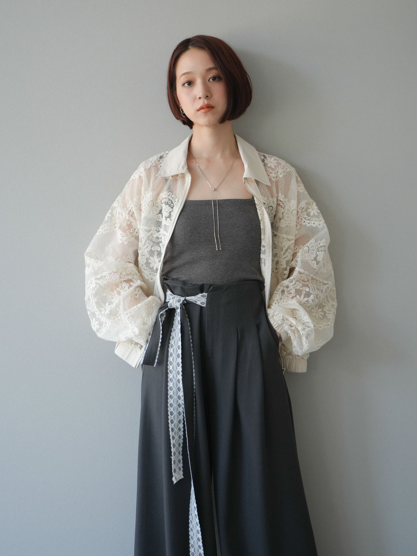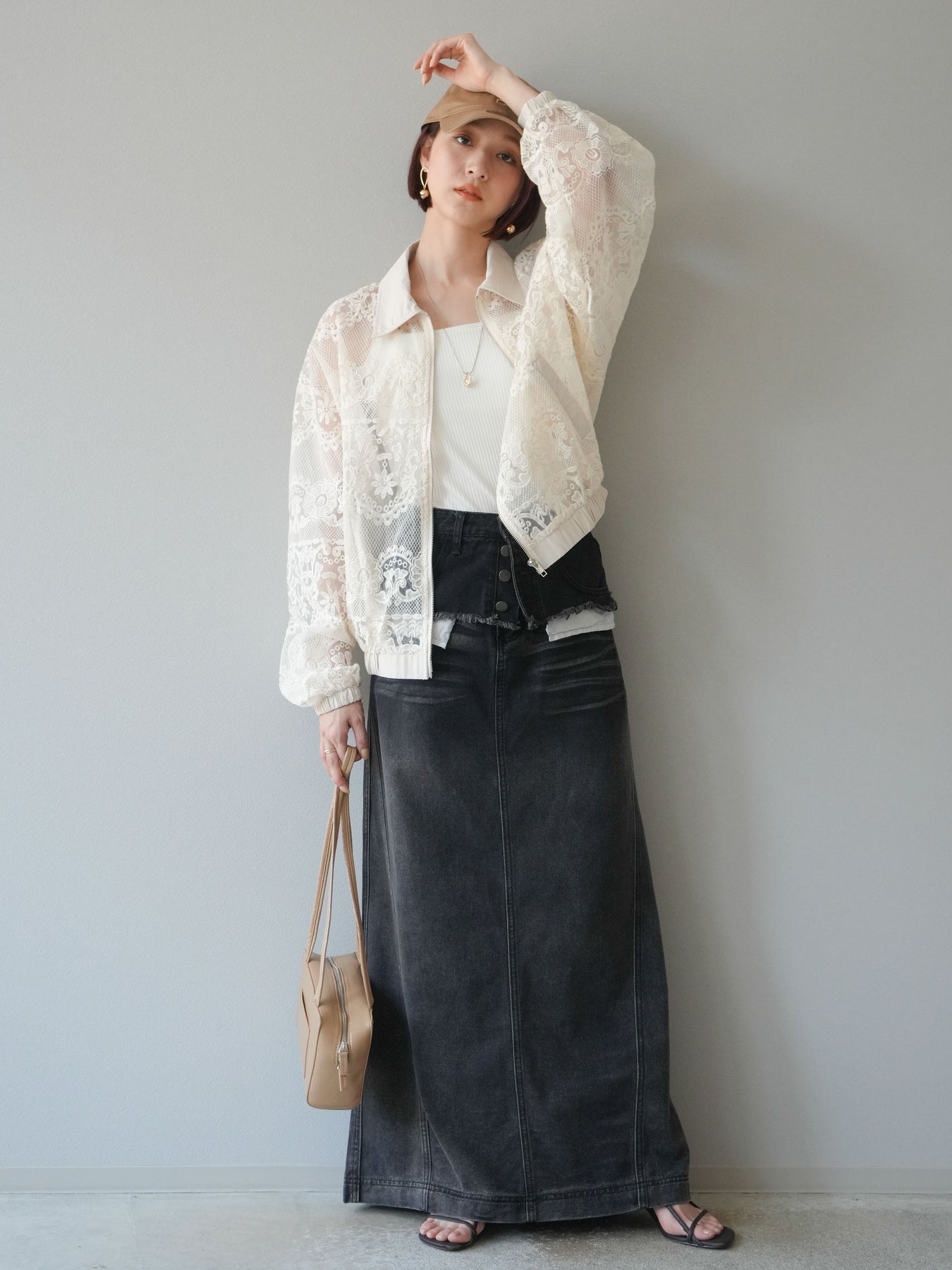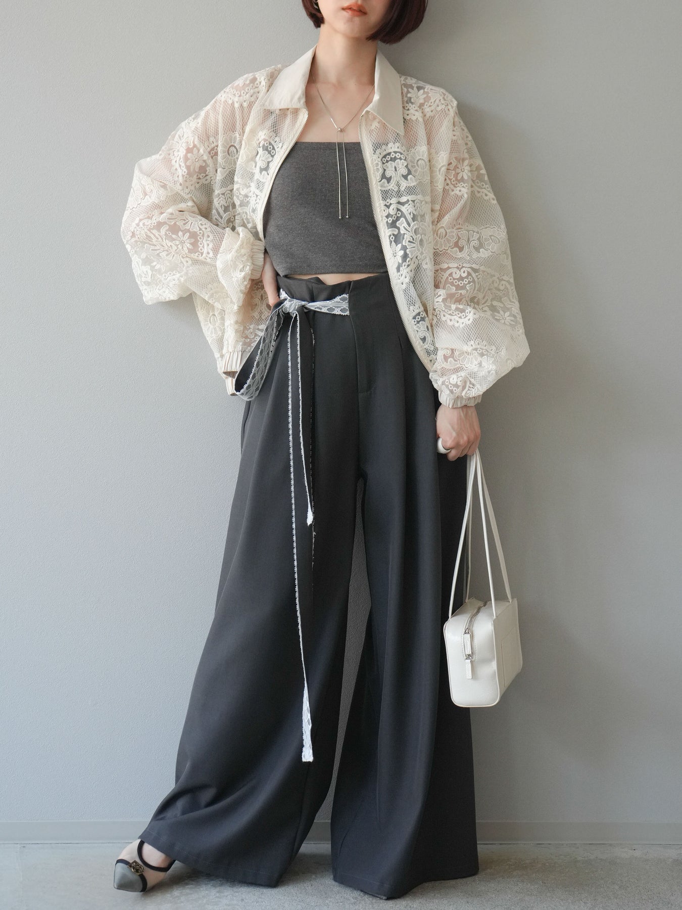 繊細なレースで仕立てた、上品な抜け感が魅力のジップブルゾン。襟付きのきちんと感と、透け感のあるレースの軽やかさが好バランス。裾と袖口にはゴムが入っており、程よく立体感のあるシルエットを演出。フェミニンなスタイリングにも、カジュアルなコーデの外しアイテムとしても重宝します。羽織るだけで旬のスタイルが完成。 ※ボトムス、キャミソール(インナー)以外の商品は一律でインナーは付属していません