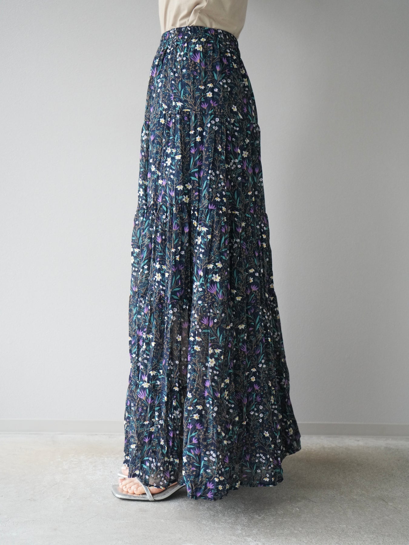 繊細なフラワープリントとワッシャー加工のプリーツが特徴のマキシスカート。軽やかな素材感と、動くたびに揺れるシルエットが女性らしさを引き立てます。ウエストはゴム仕様でリラクシーな着心地。シンプルなトップスと合わせるだけで、トレンド感のある着こなしが完成します。  ※ボトムス、キャミソール(インナー)以外の商品は一律でインナーは付属していません