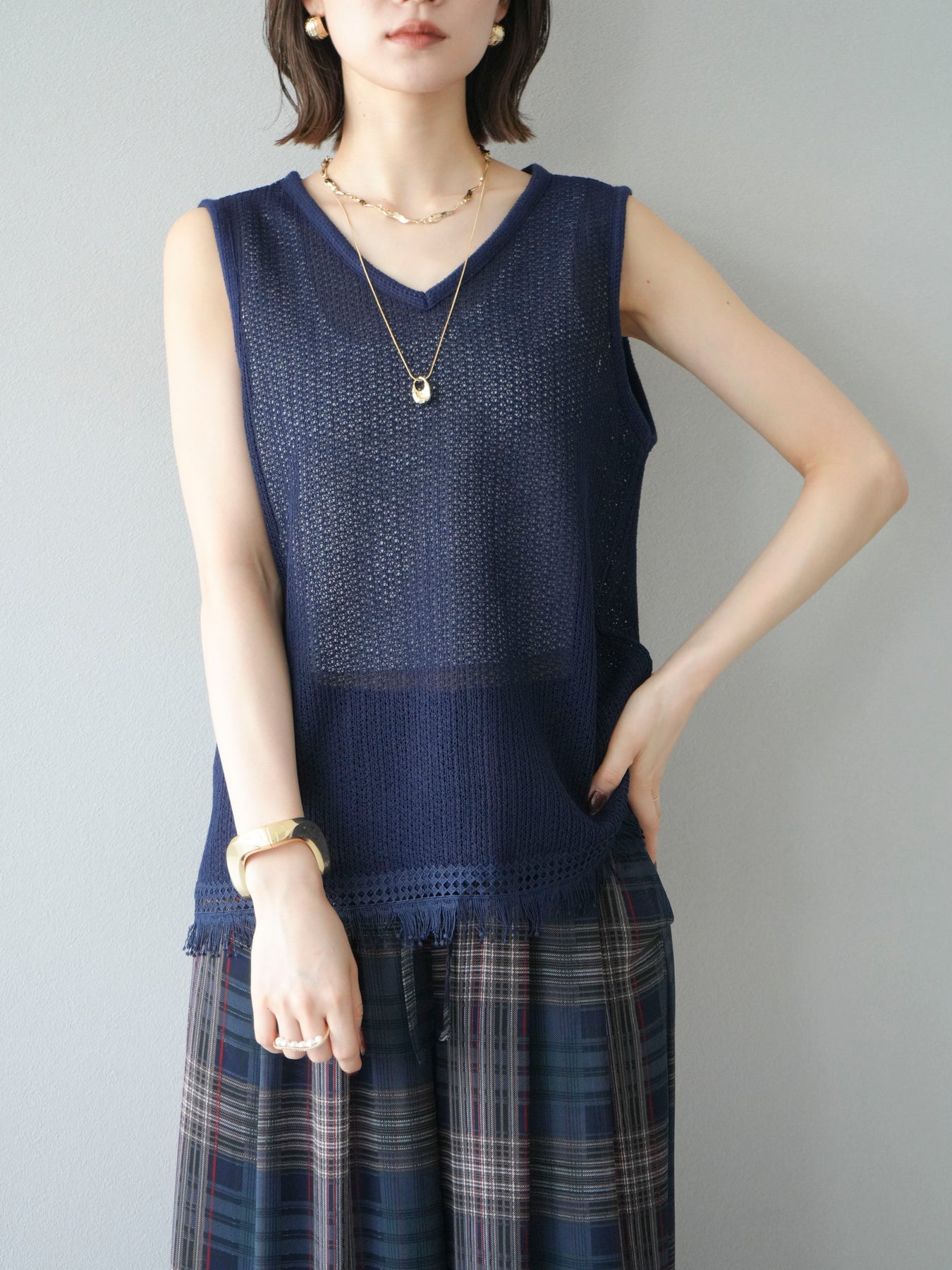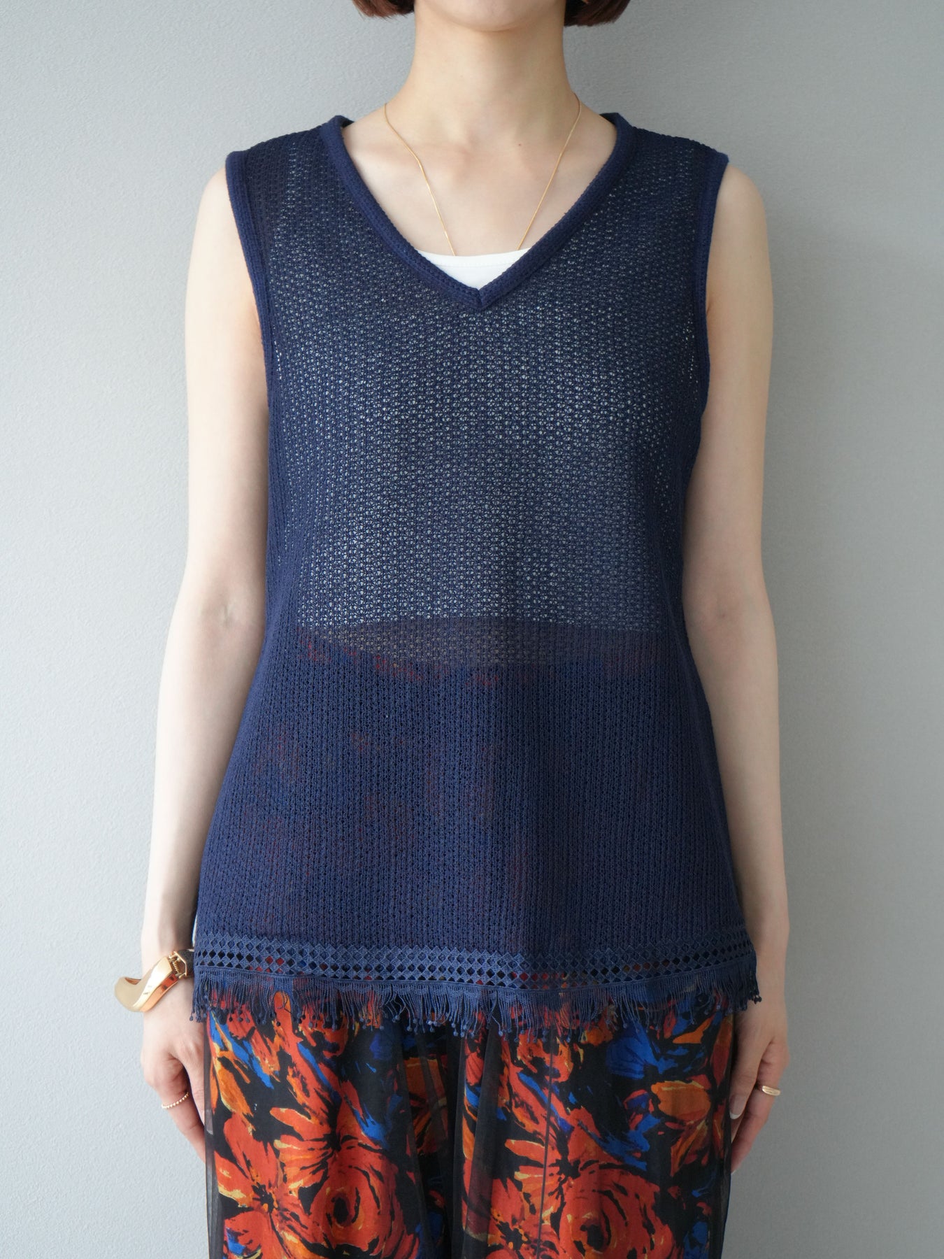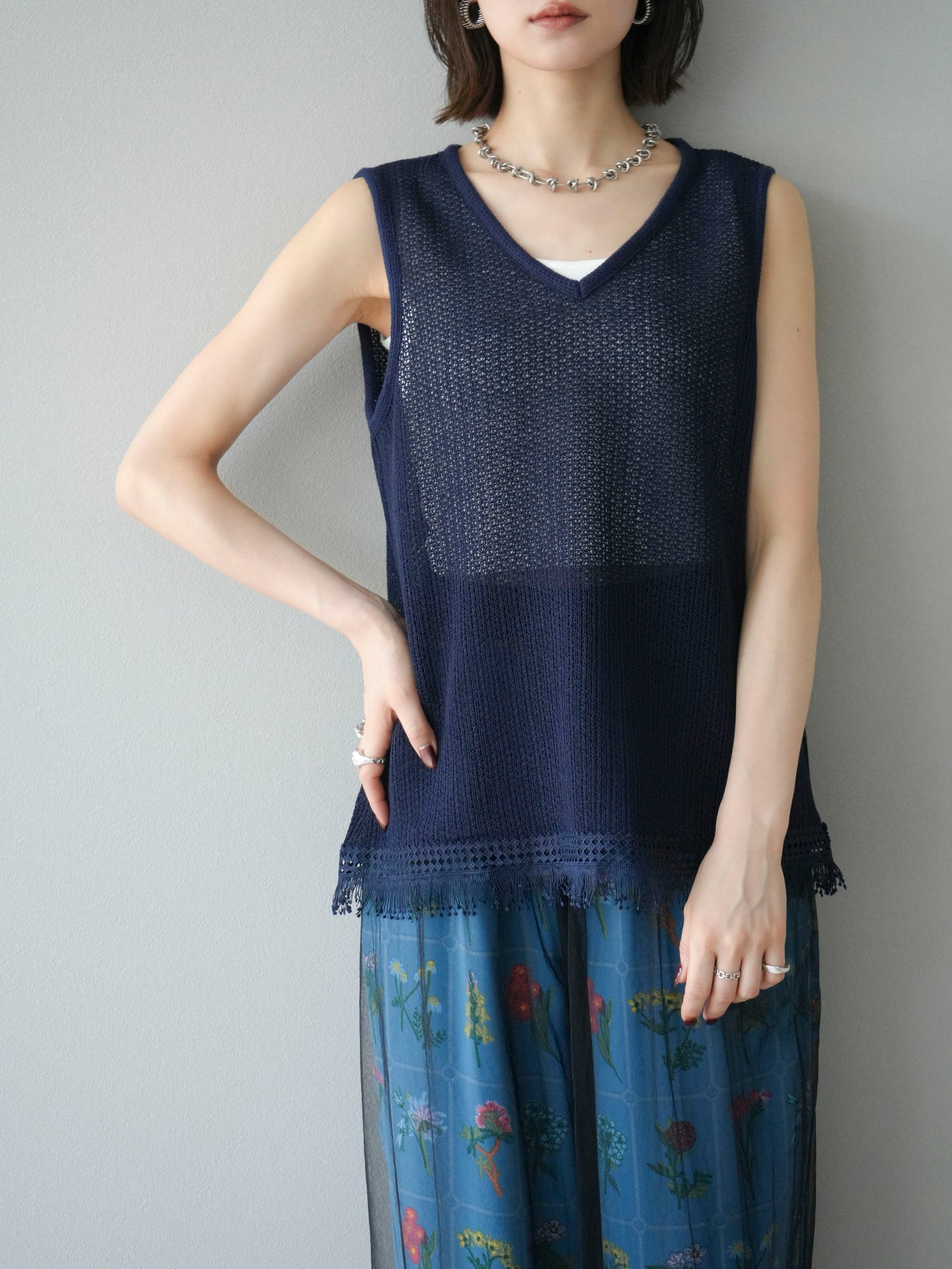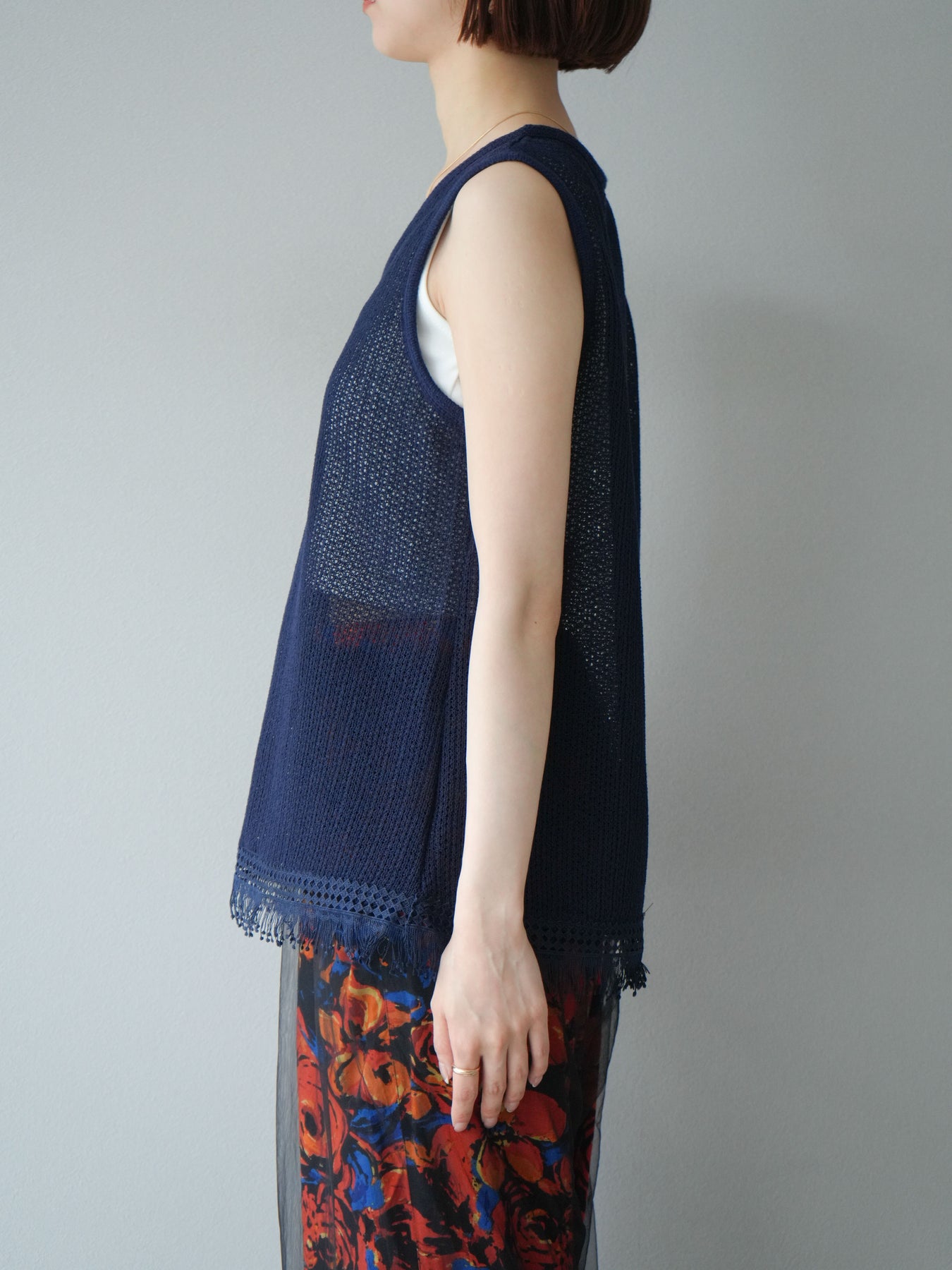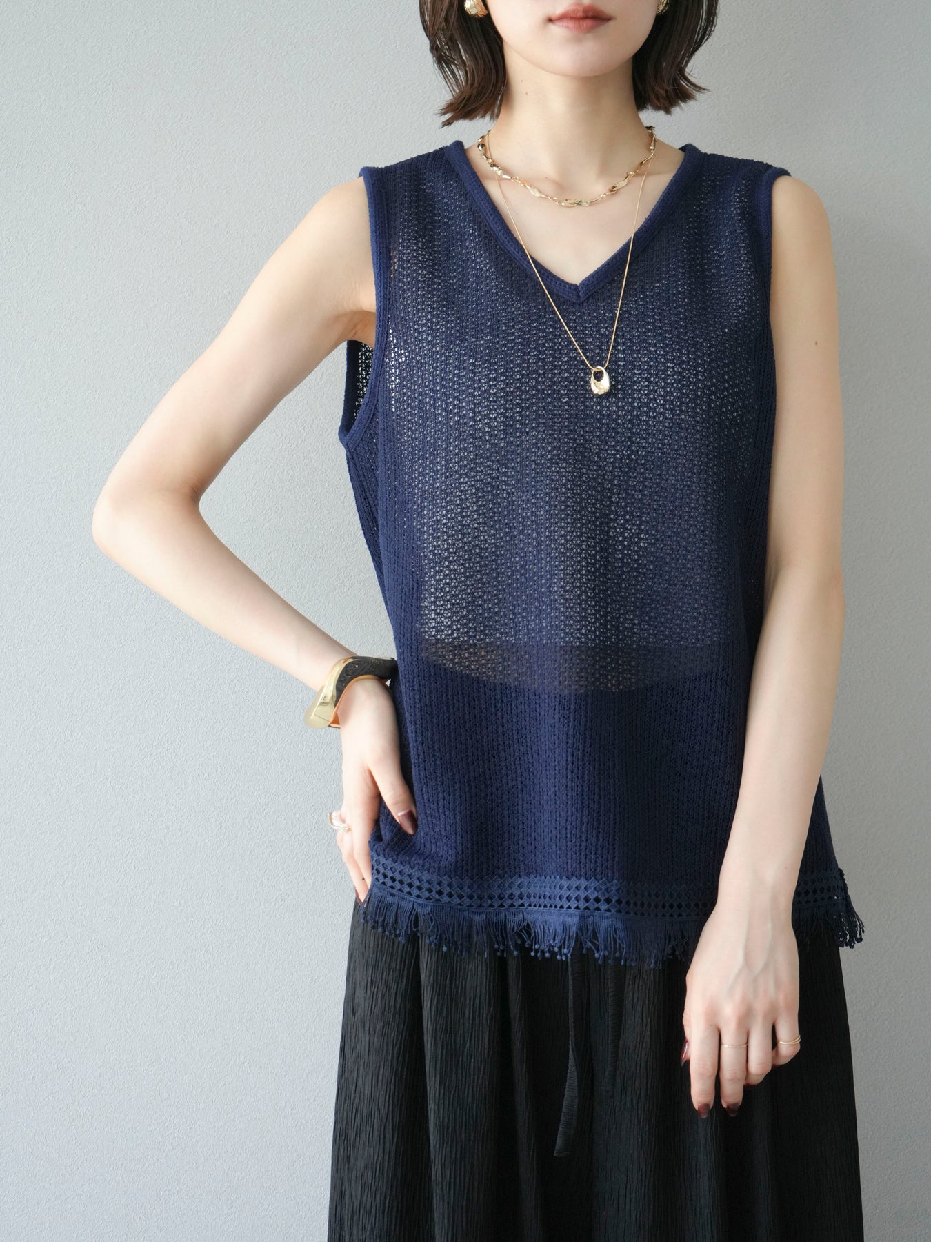[予約]裾フリンジVネックニットタンクトップアンサンブル/ネイビー