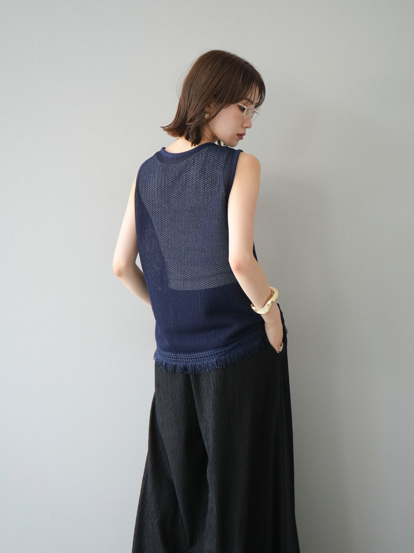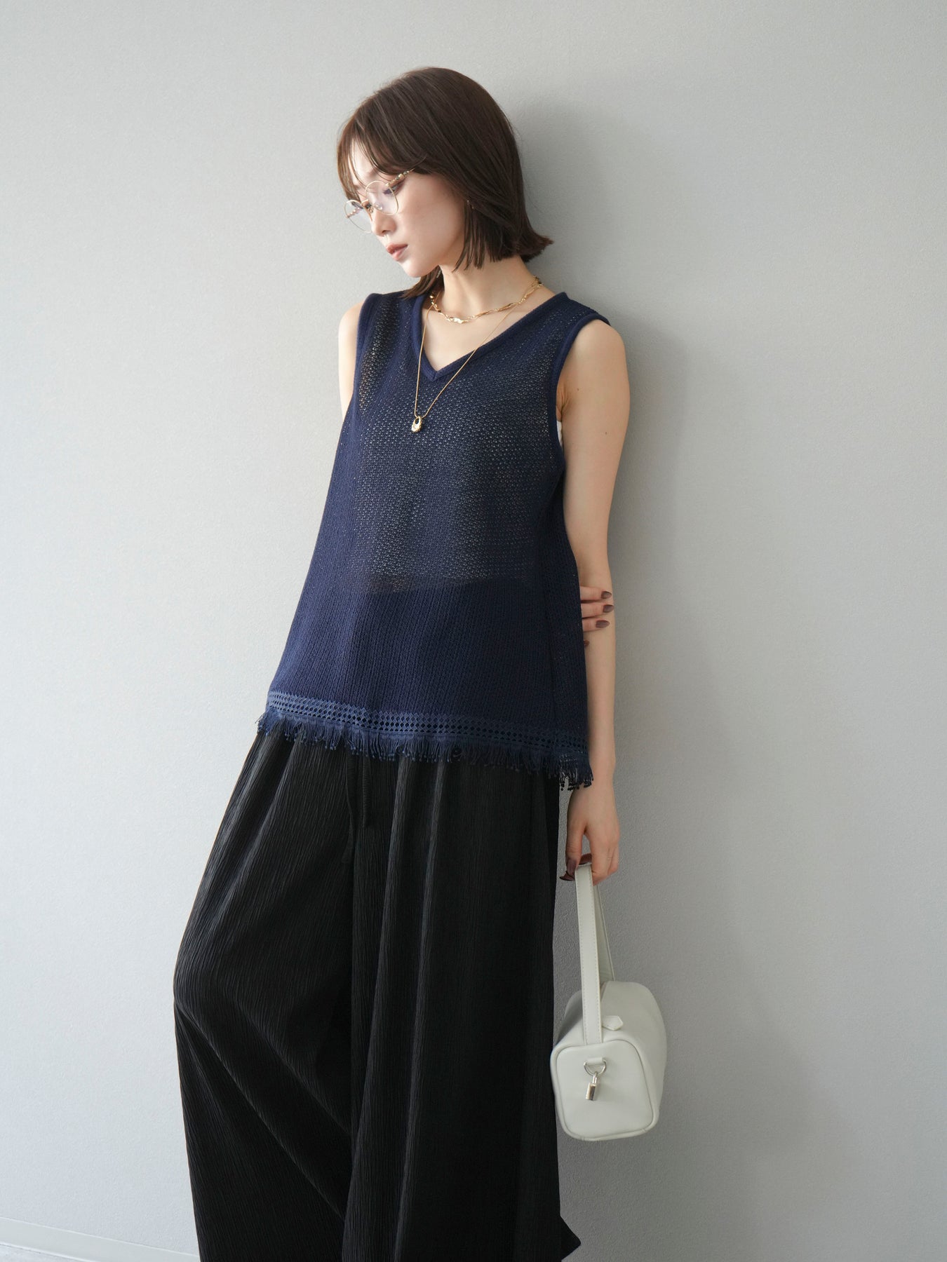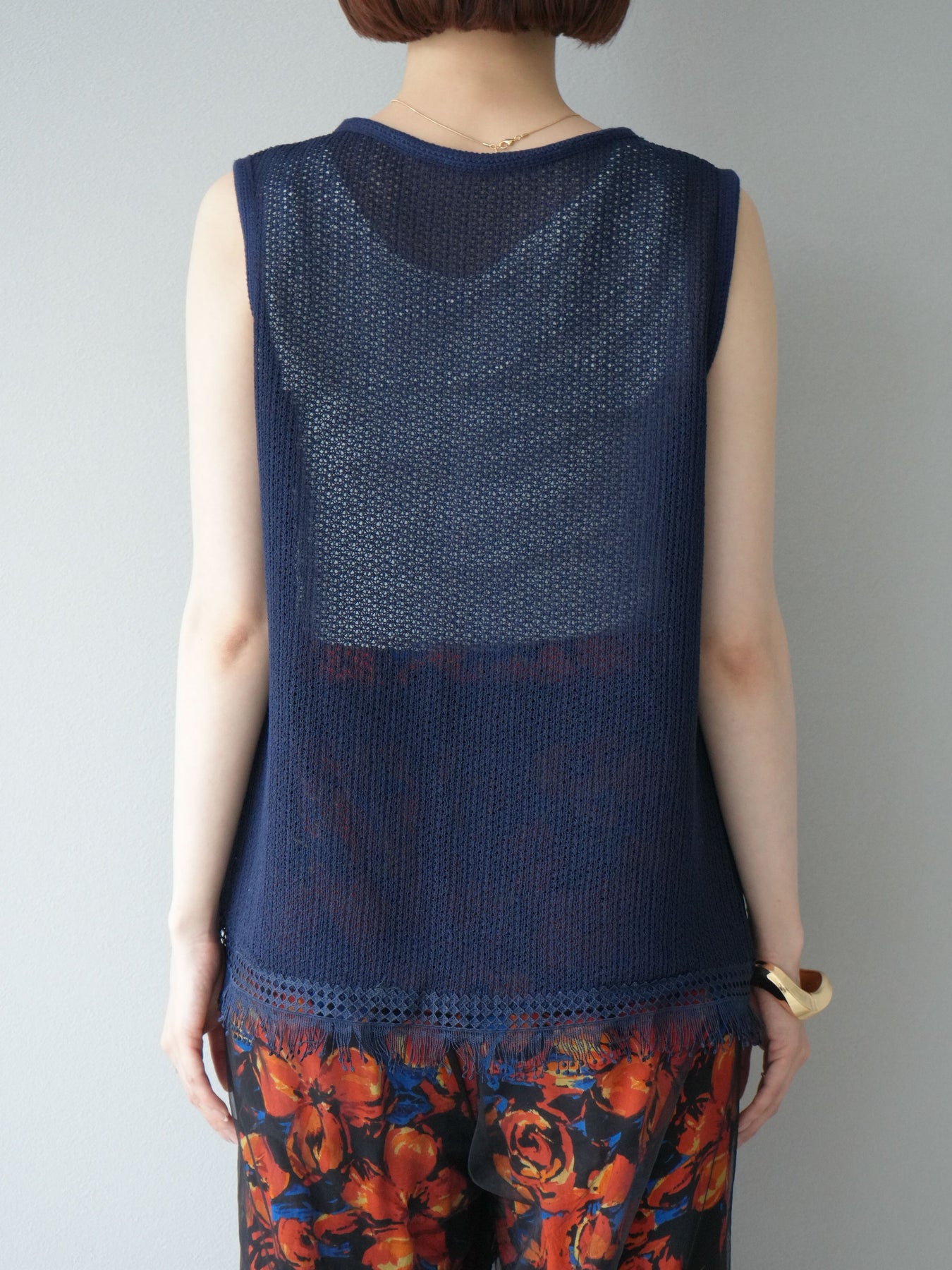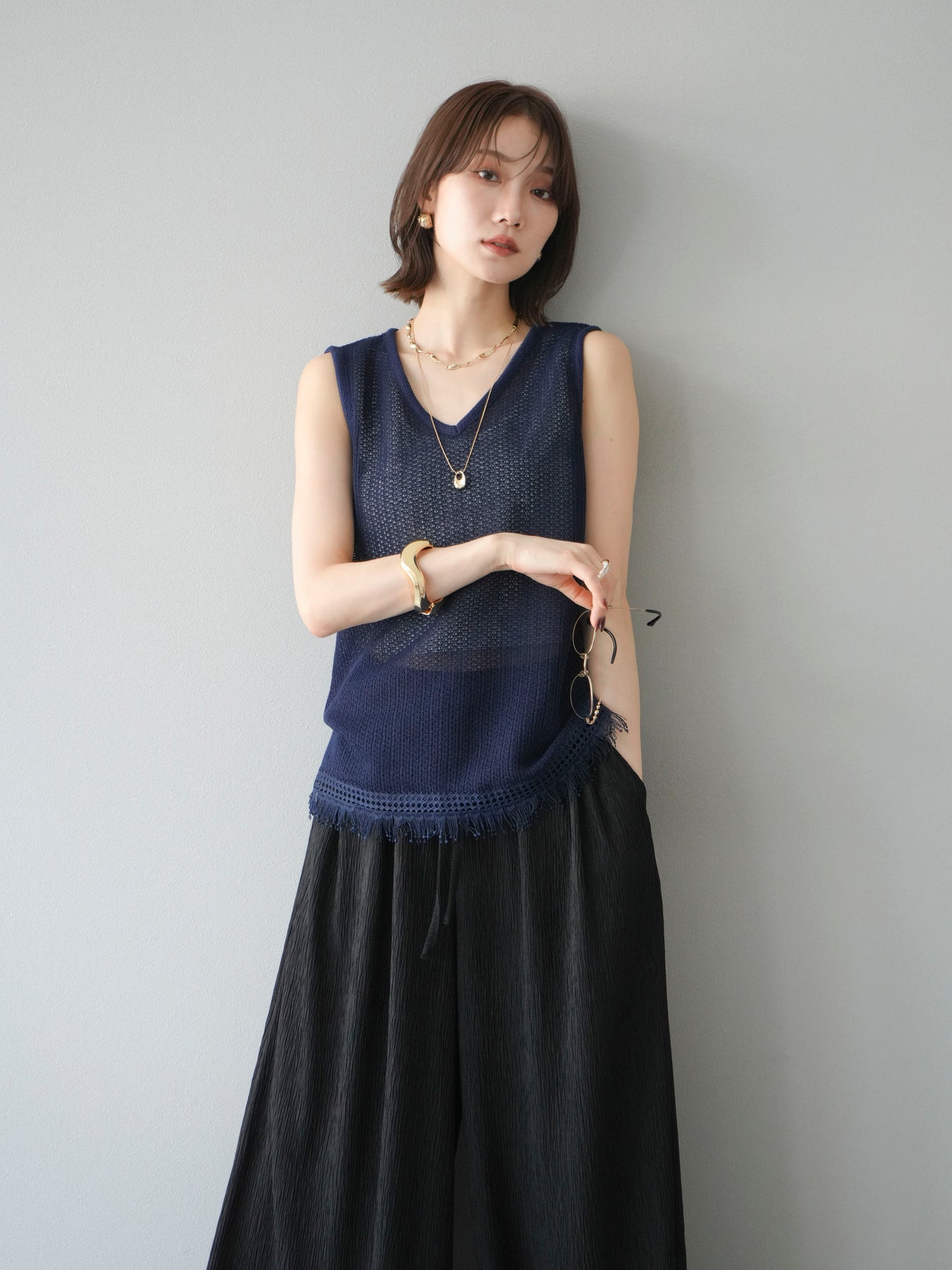 [予約]裾フリンジVネックニットタンクトップアンサンブル/ネイビー