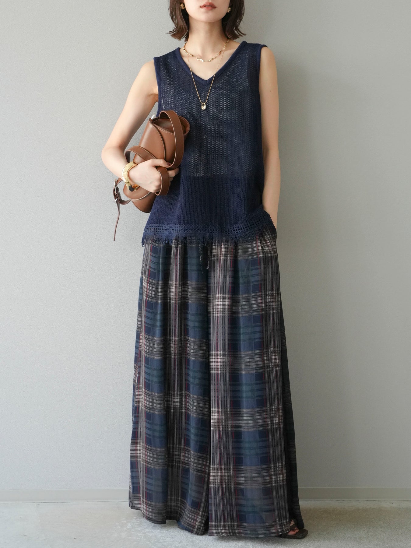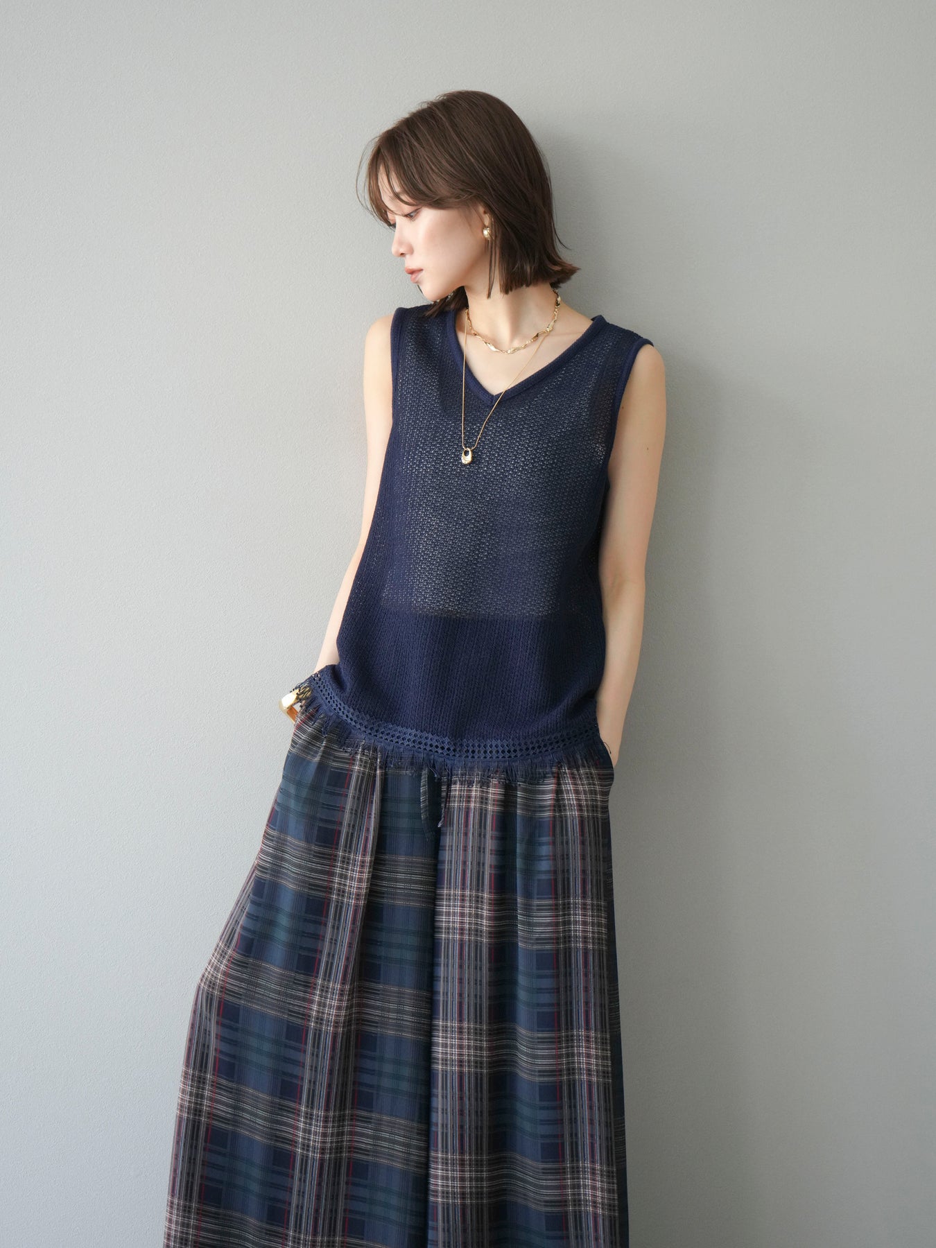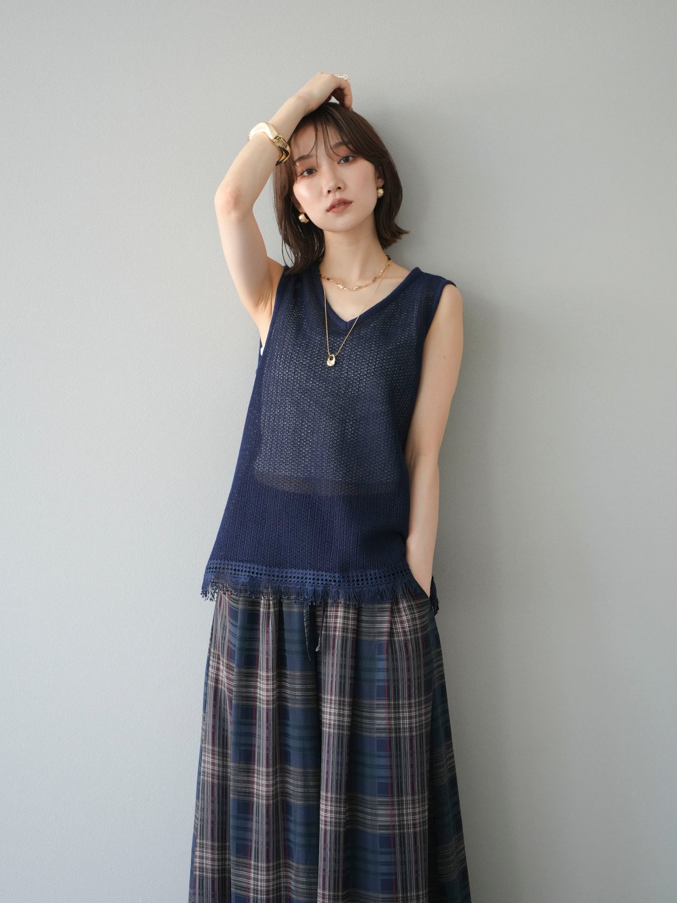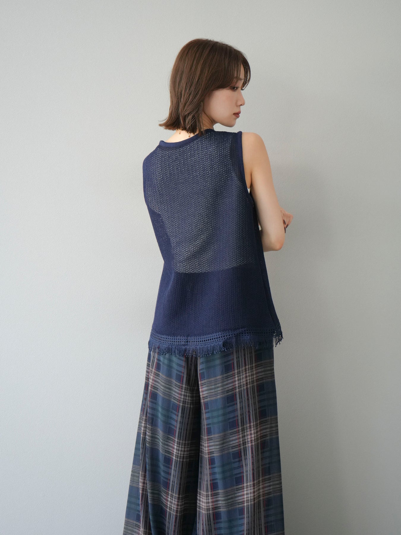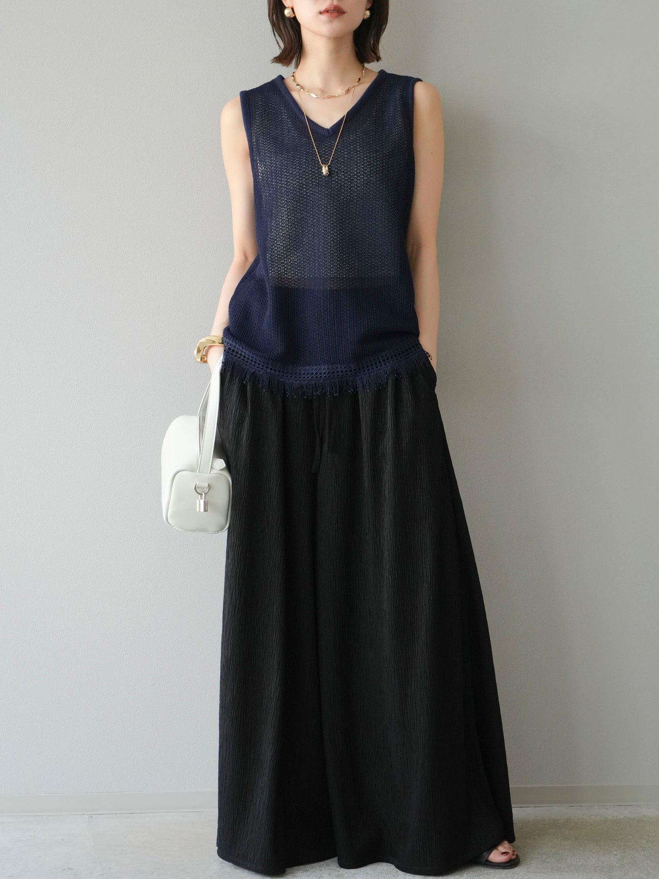 [予約]裾フリンジVネックニットタンクトップアンサンブル/ネイビー
