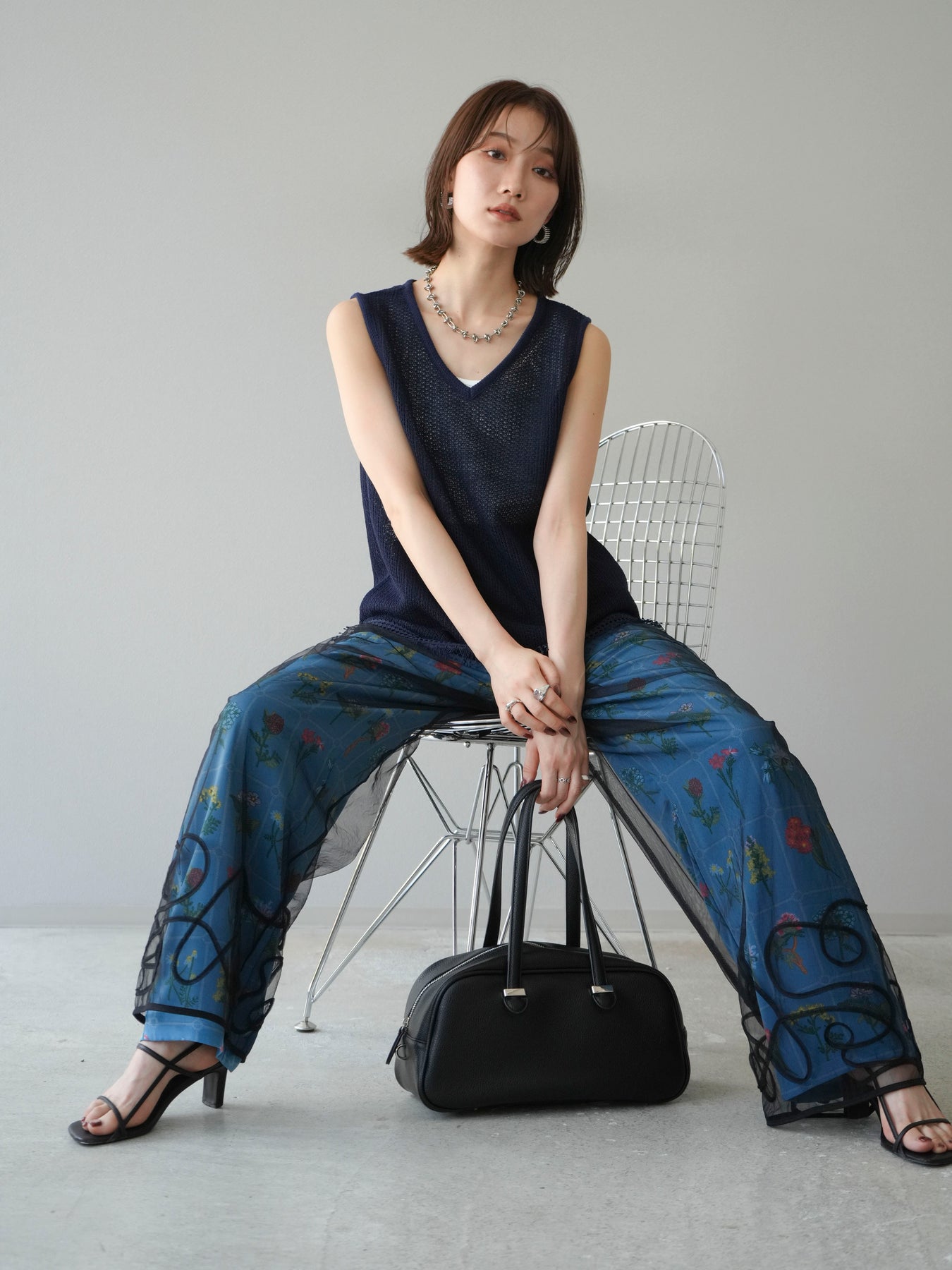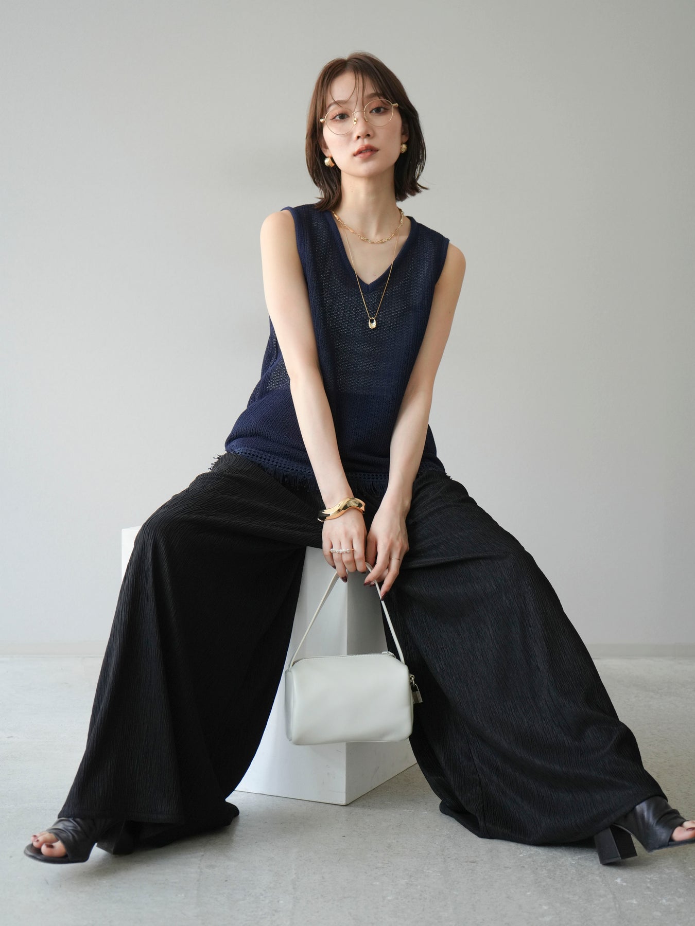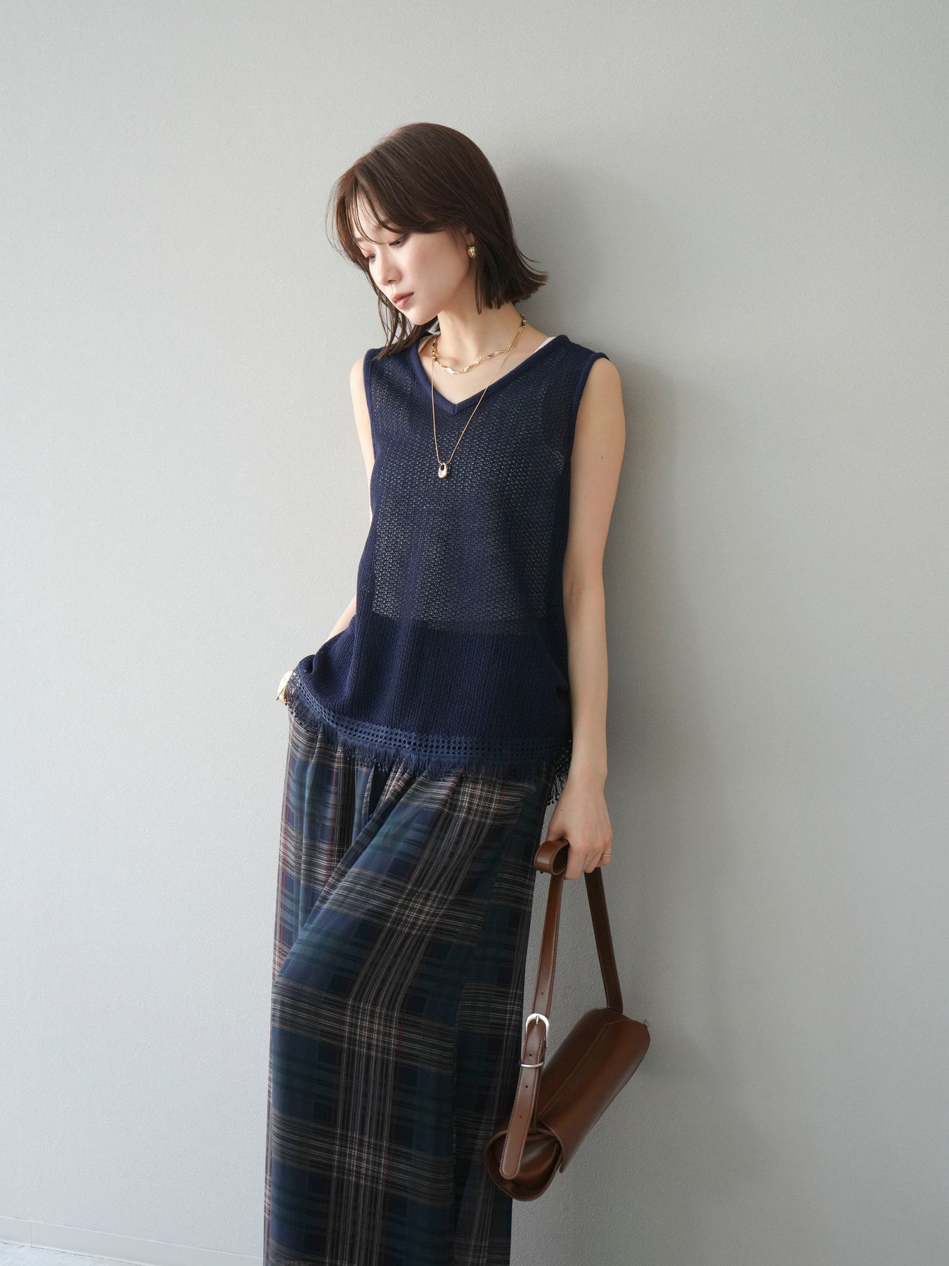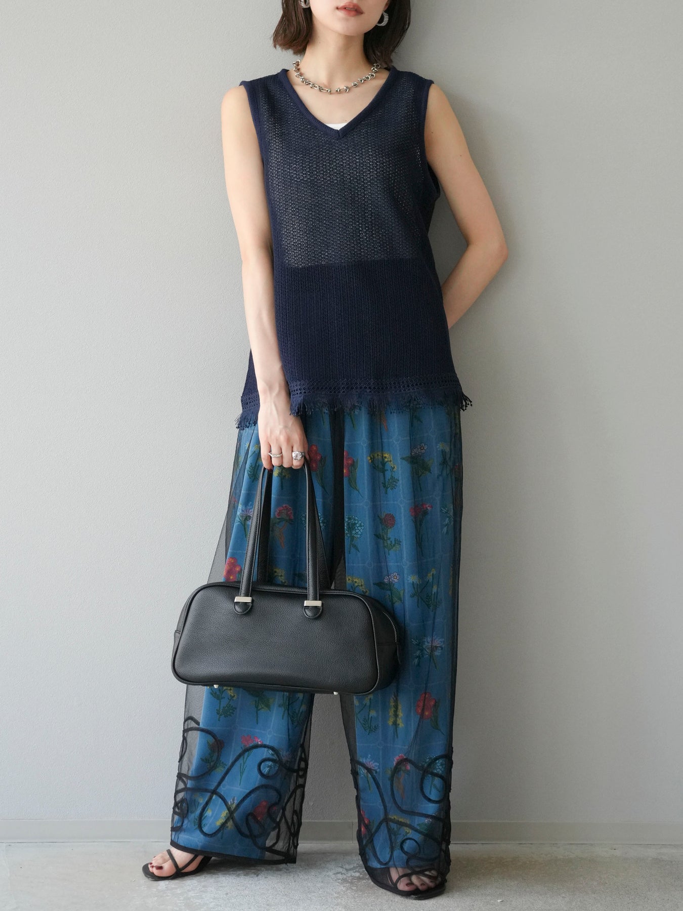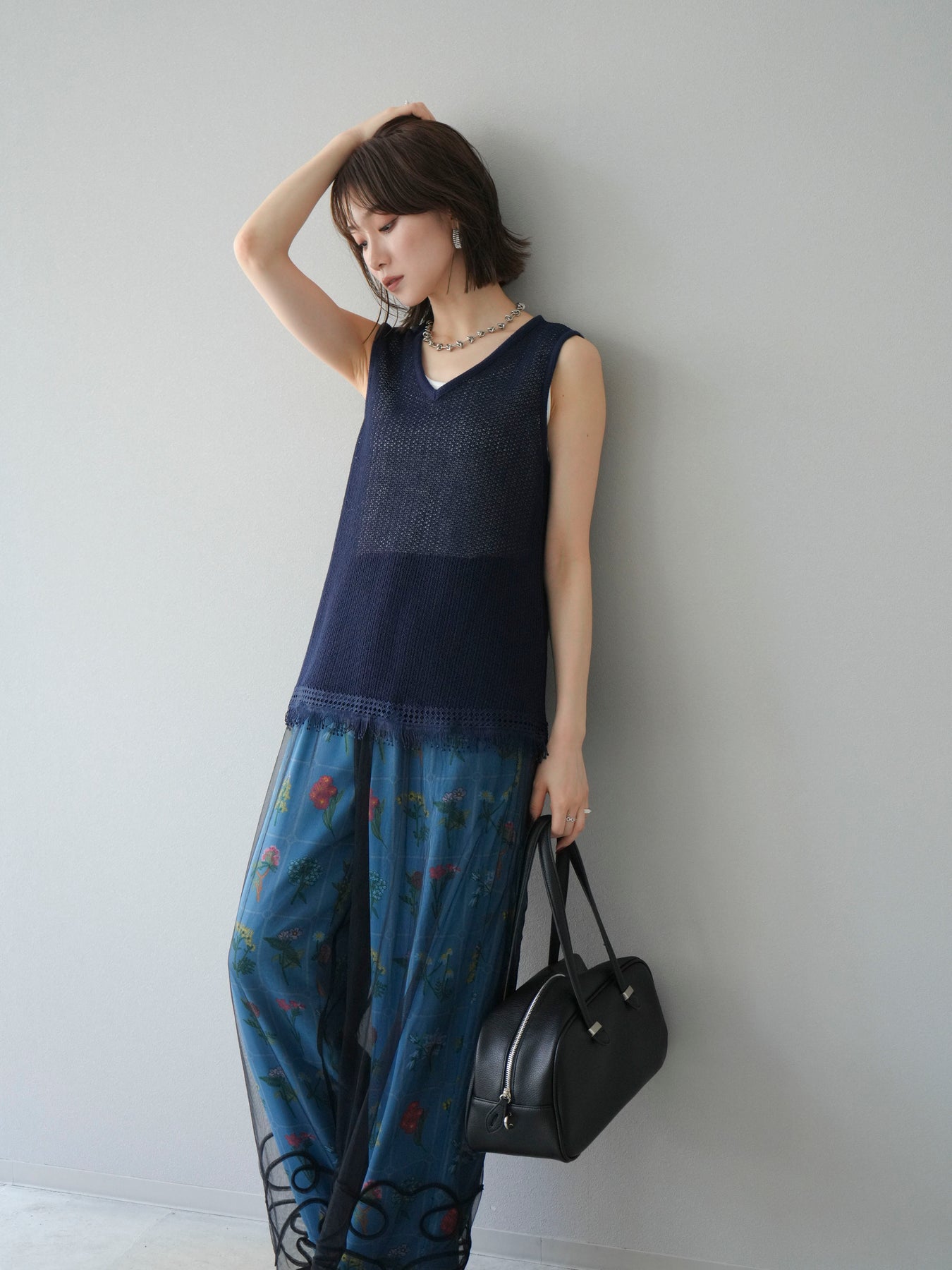 [予約]裾フリンジVネックニットタンクトップアンサンブル/ネイビー