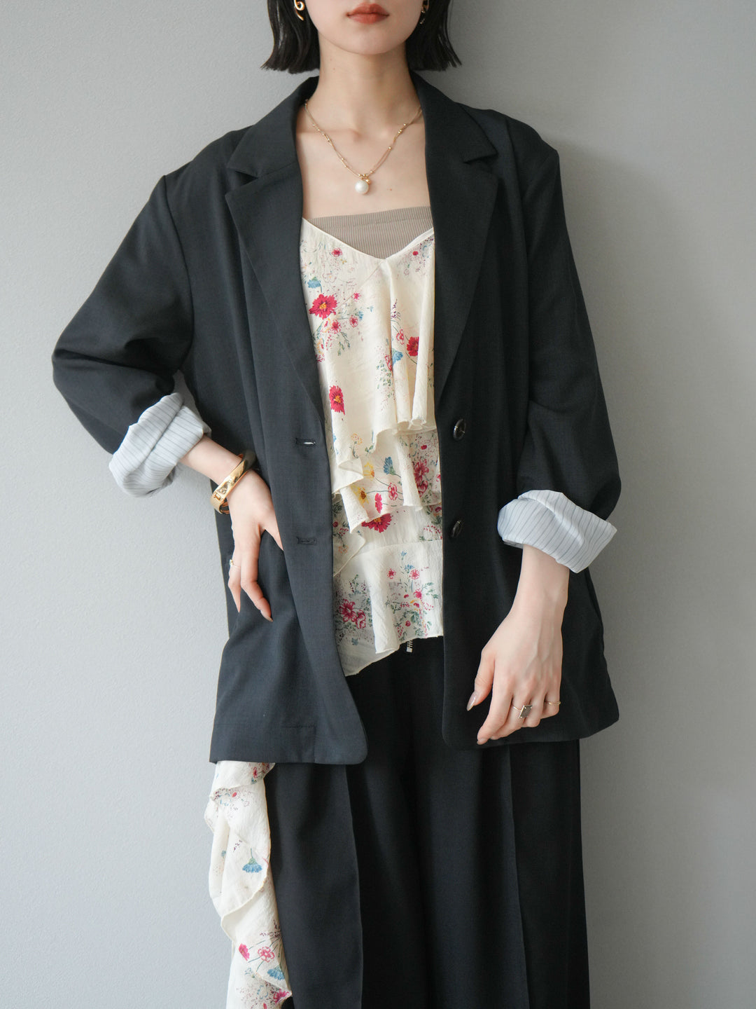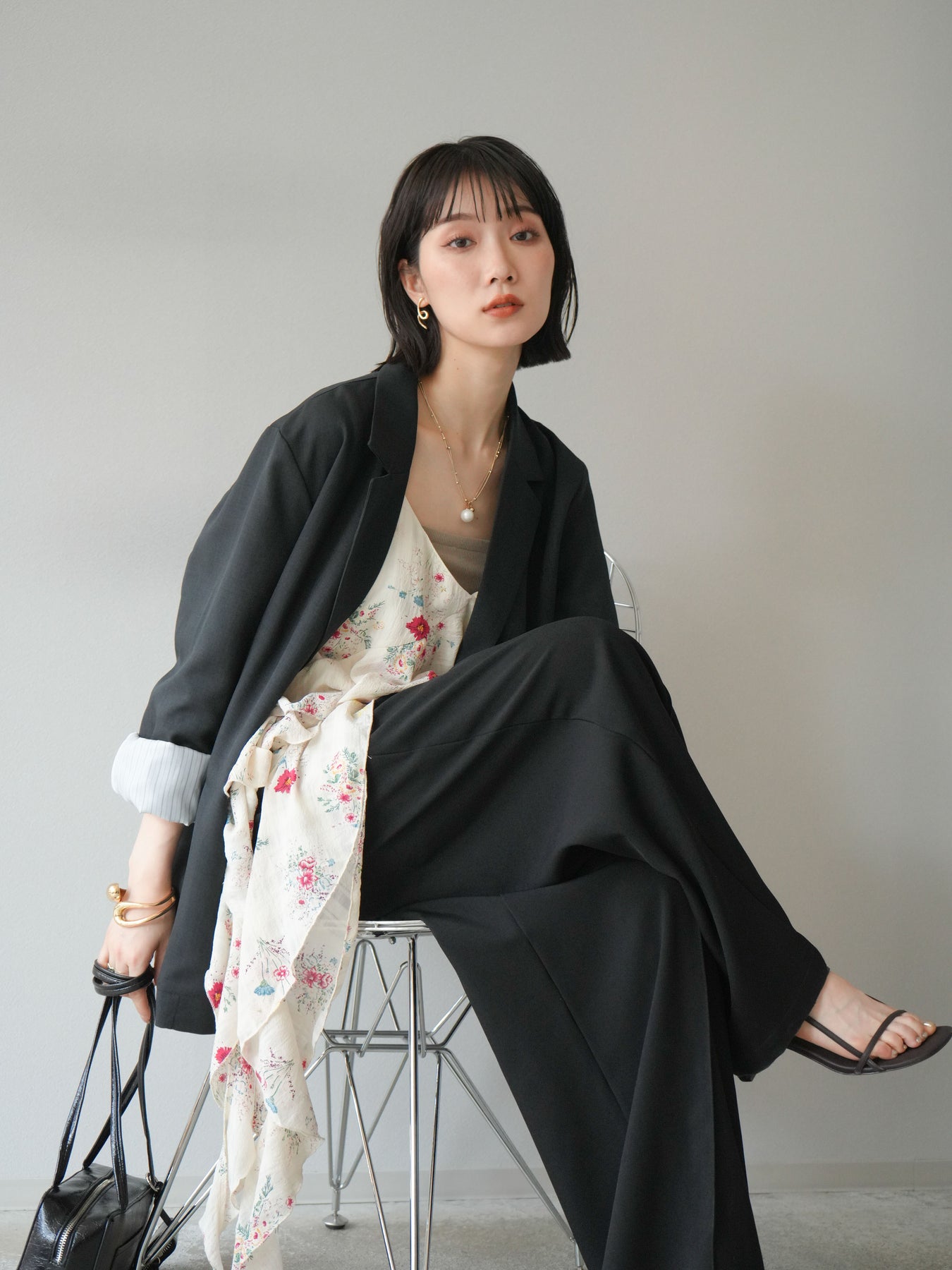 華やかなフラワープリントとたっぷりのラッフルが目を惹くキャミソール。アシンメトリーなヘムラインが動きのあるシルエットを演出し、1枚で主役級の存在感を放ちます。華奢なストラップと軽やかな素材感で、女性らしい抜け感をプラス。デニムやワイドパンツと合わせて、甘さを程よく引き算したスタイリングもおすすめです。 ※ボトムス、キャミソール(インナー)以外の商品は一律でインナーは付属していません