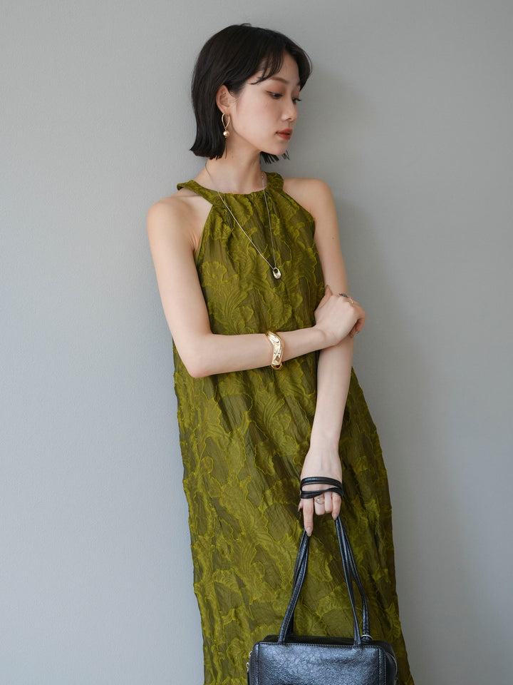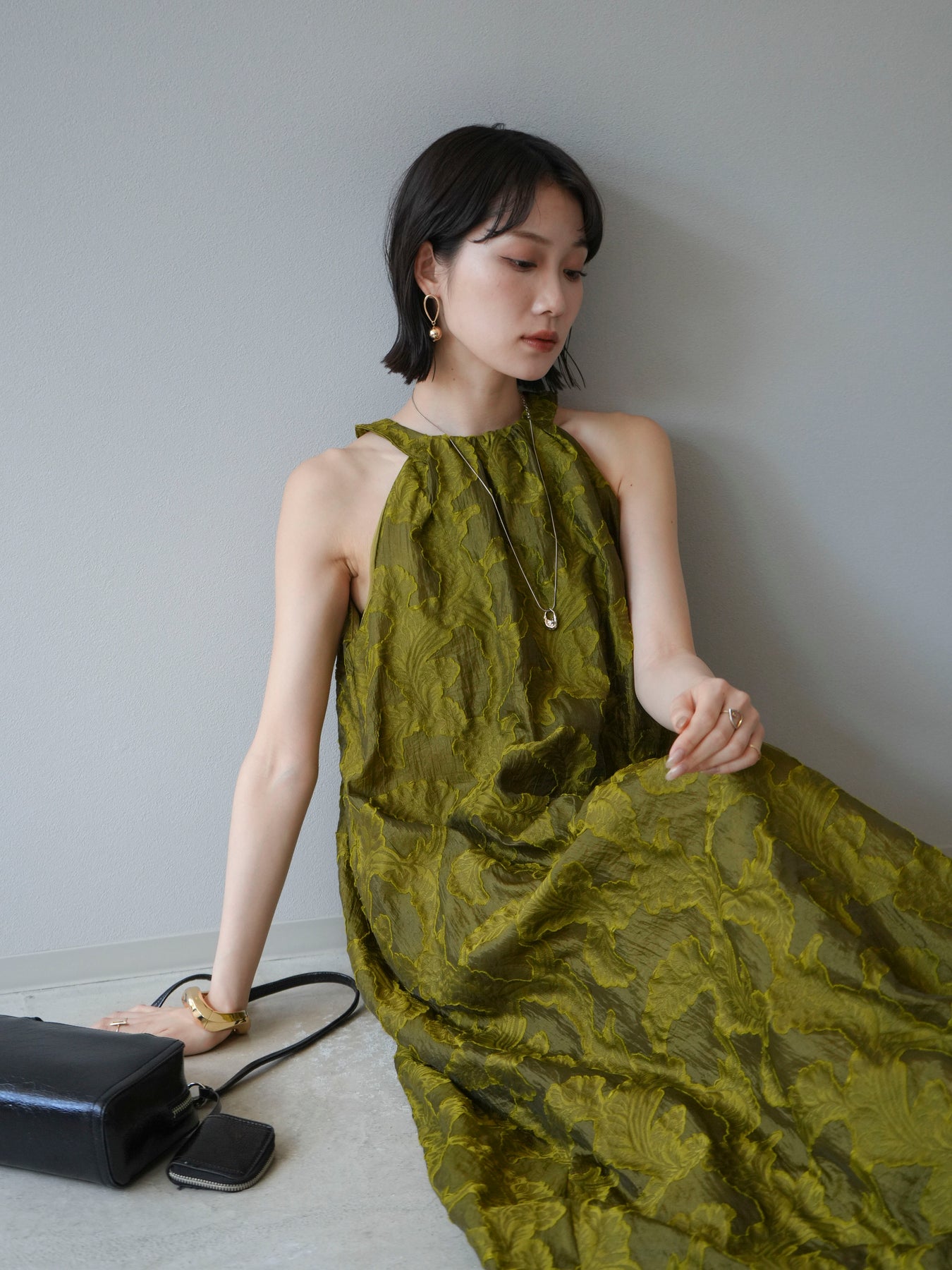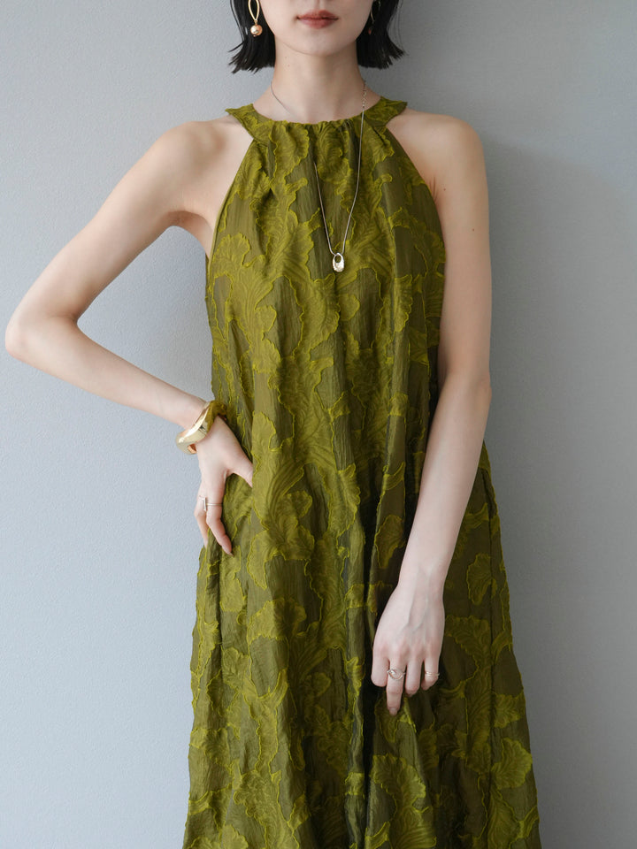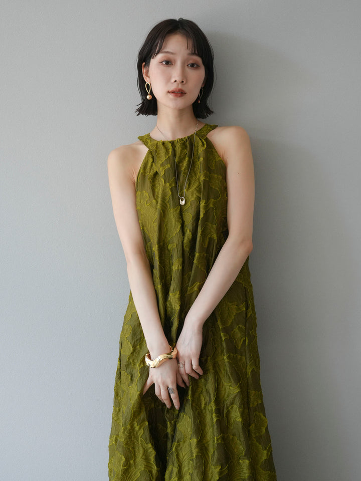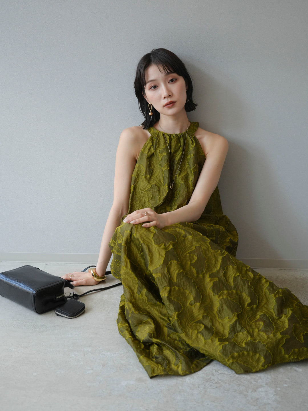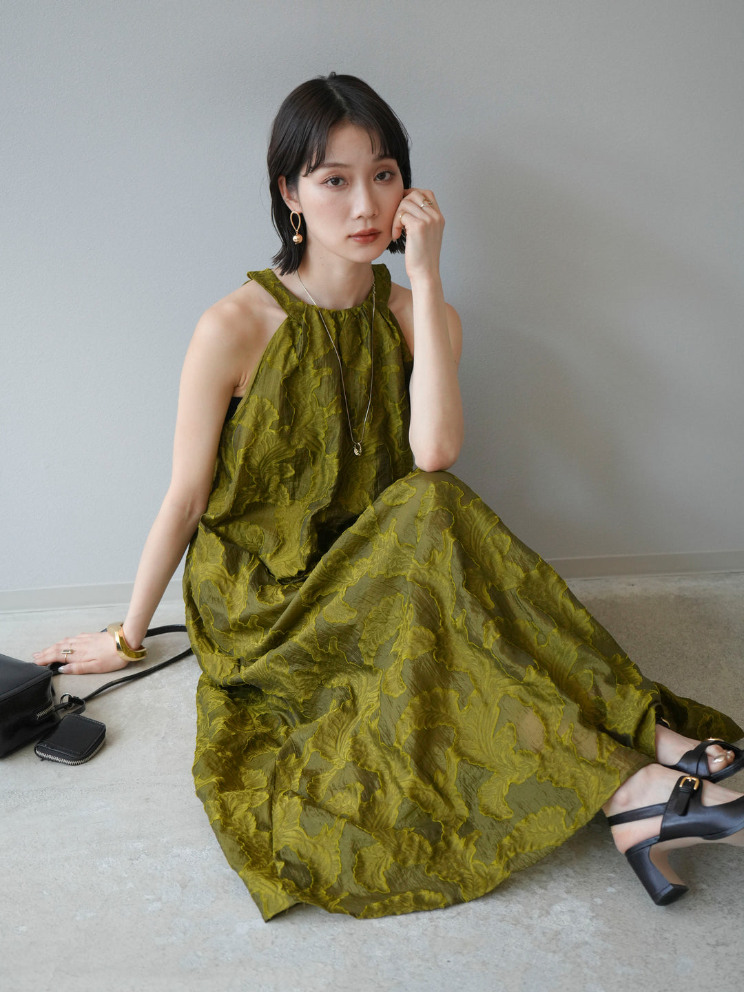 トレンド感漂うジャガード素材が印象的なホルターネックワンピース。繊細な立体感のある柄と、ふんわり広がるAラインシルエットが華やかさを引き立てます。首元のホルターデザインはデコルテを美しく見せ、ヘルシーな肌見せが叶うのも魅力。1枚で主役になる存在感たっぷりのアイテムです。 ※ボトムス、キャミソール(インナー)以外の商品は一律でインナーは付属していません