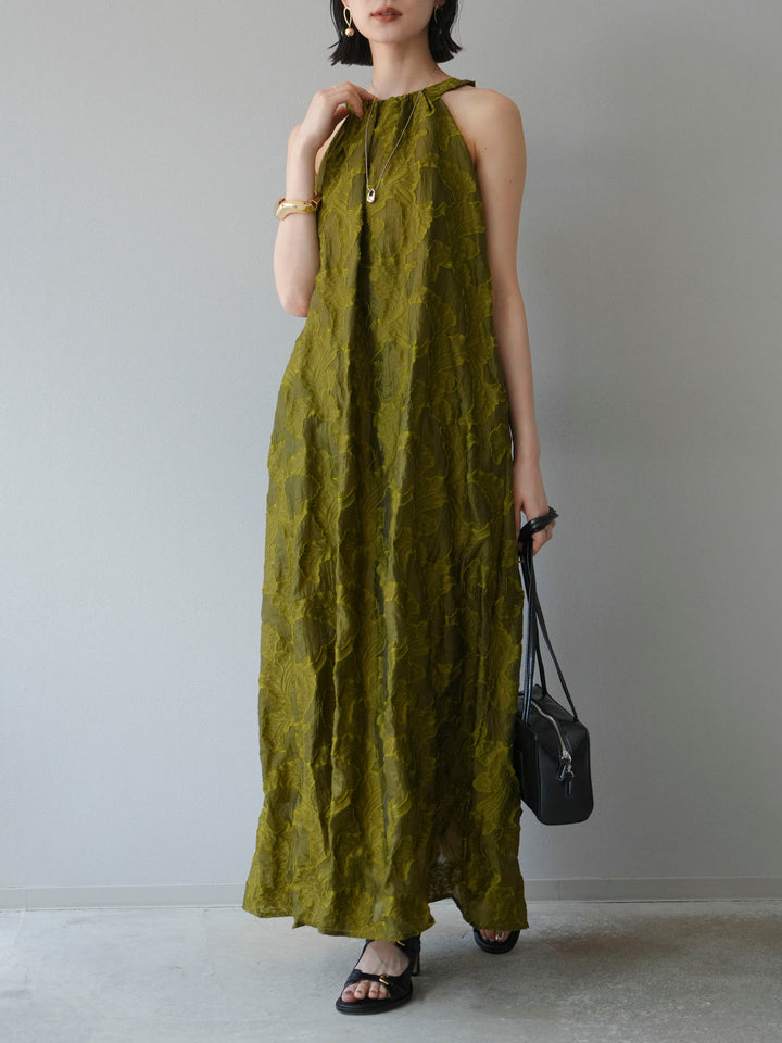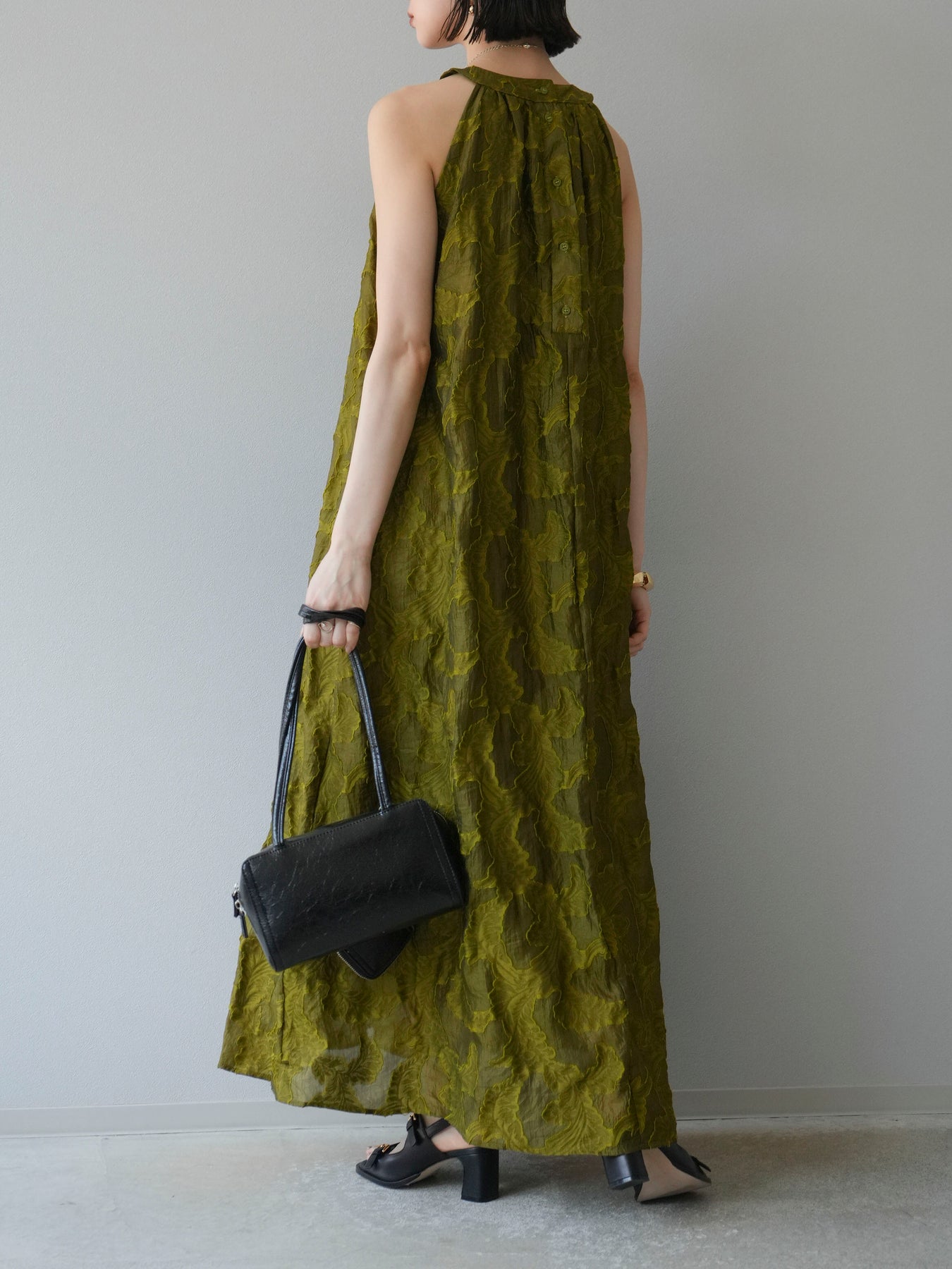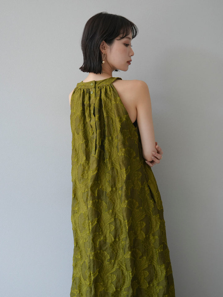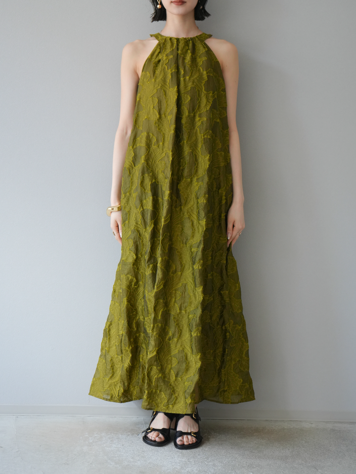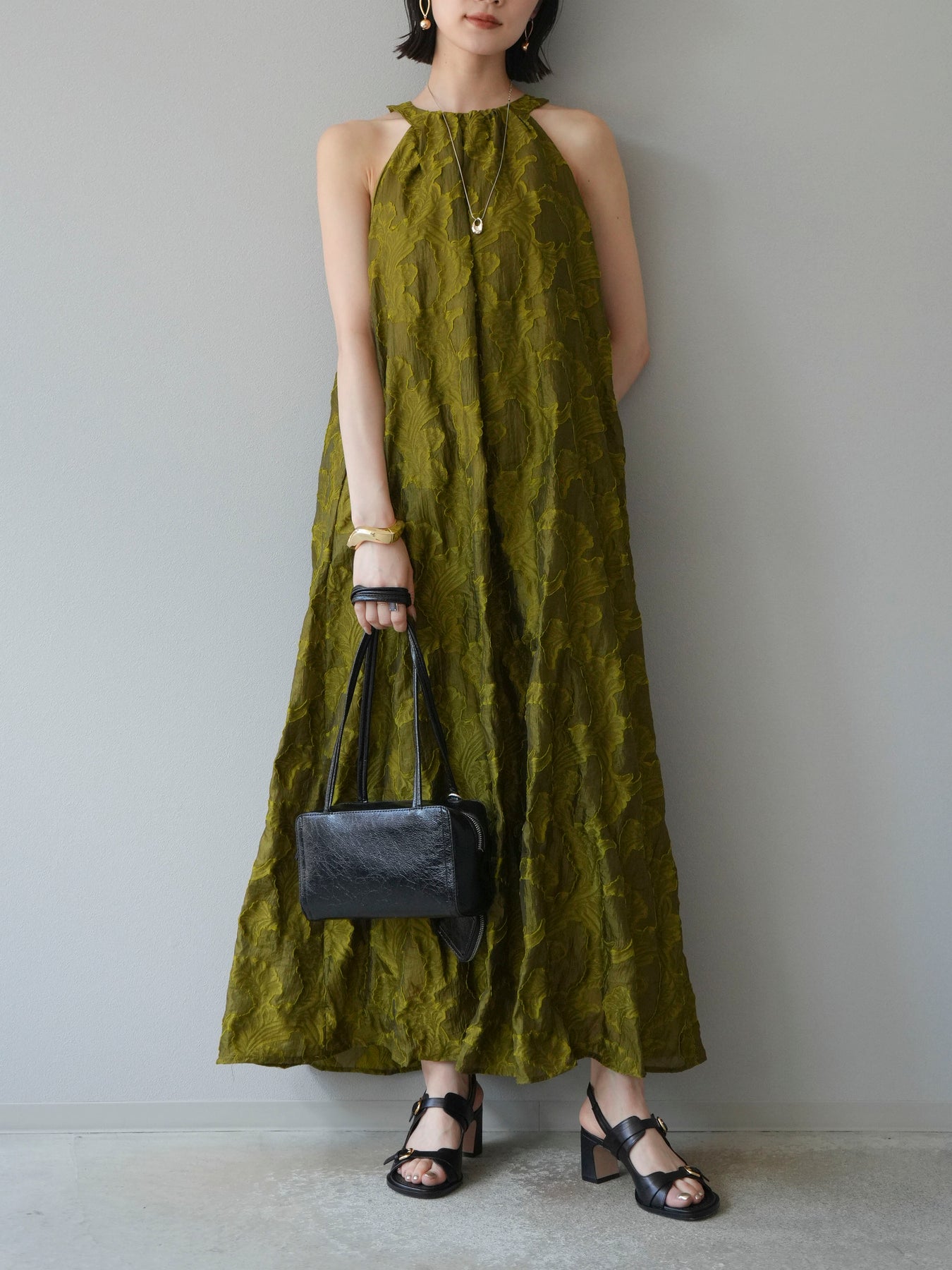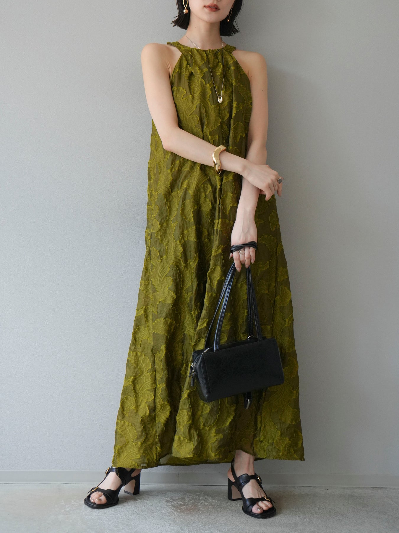トレンド感漂うジャガード素材が印象的なホルターネックワンピース。繊細な立体感のある柄と、ふんわり広がるAラインシルエットが華やかさを引き立てます。首元のホルターデザインはデコルテを美しく見せ、ヘルシーな肌見せが叶うのも魅力。1枚で主役になる存在感たっぷりのアイテムです。 ※ボトムス、キャミソール(インナー)以外の商品は一律でインナーは付属していません