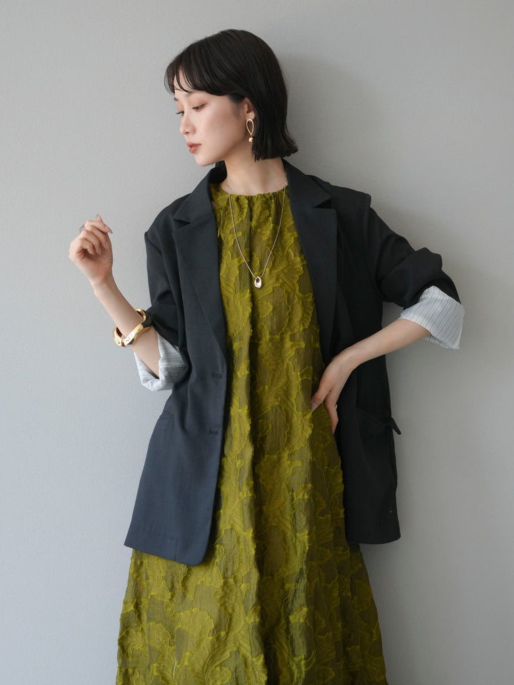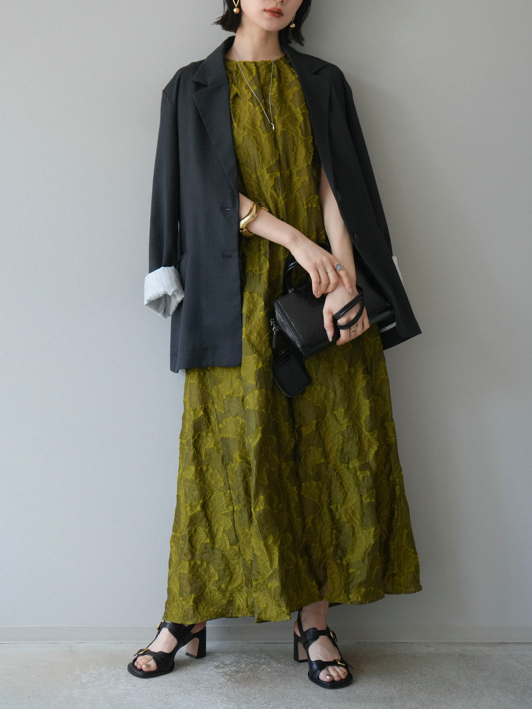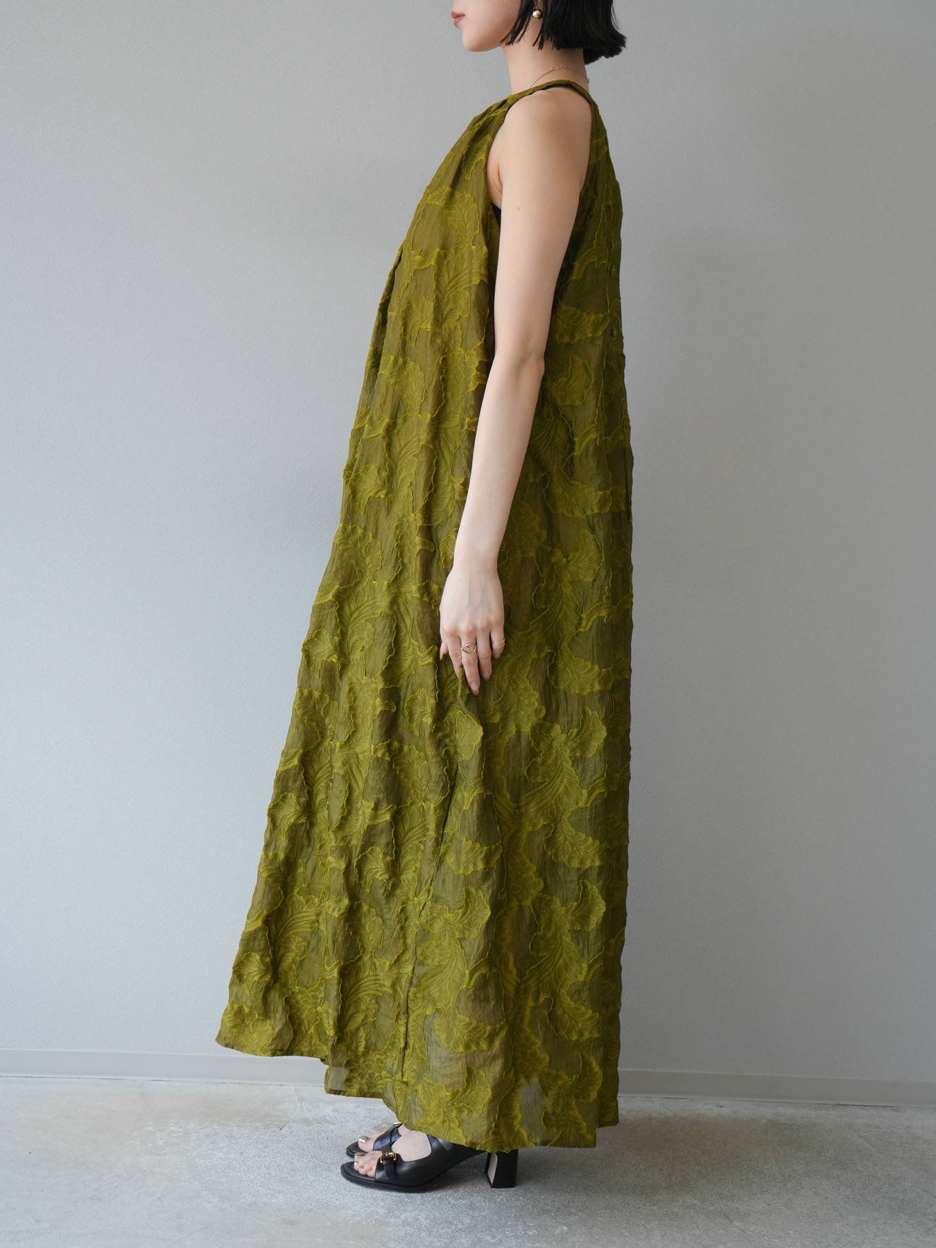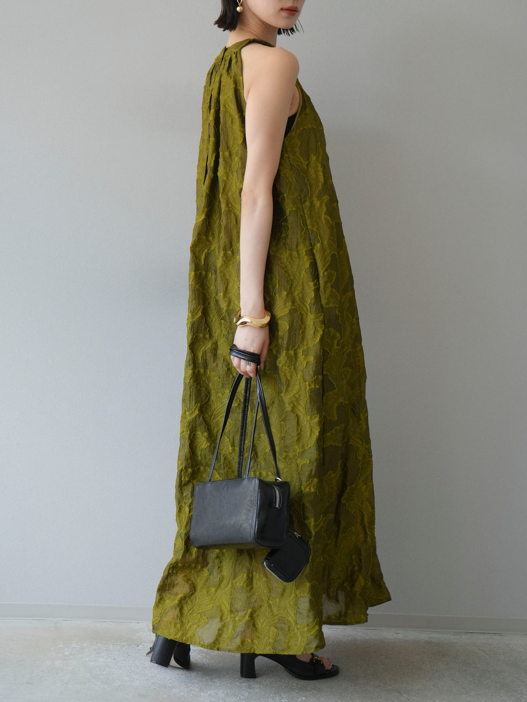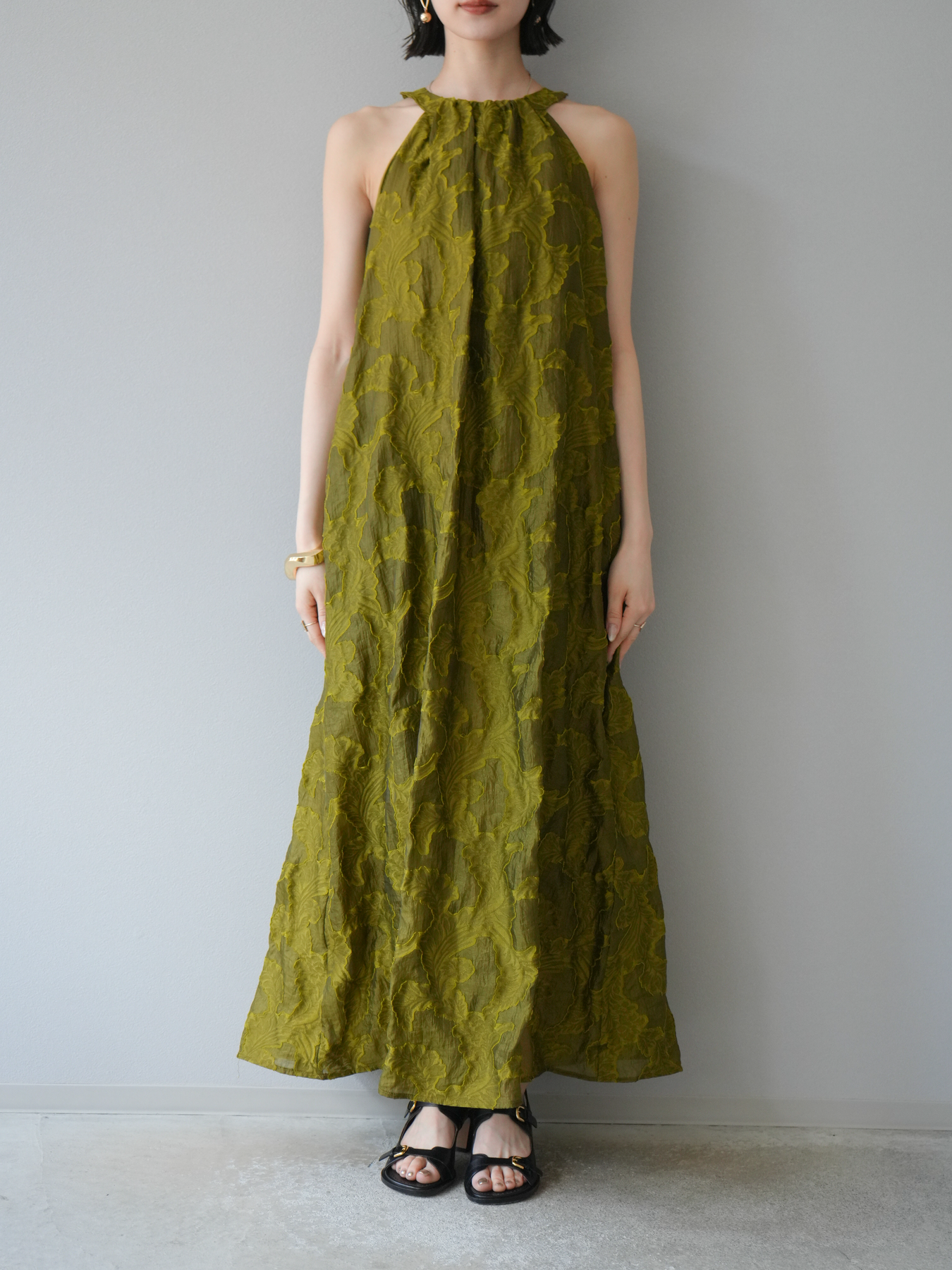 トレンド感漂うジャガード素材が印象的なホルターネックワンピース。繊細な立体感のある柄と、ふんわり広がるAラインシルエットが華やかさを引き立てます。首元のホルターデザインはデコルテを美しく見せ、ヘルシーな肌見せが叶うのも魅力。1枚で主役になる存在感たっぷりのアイテムです。 ※ボトムス、キャミソール(インナー)以外の商品は一律でインナーは付属していません