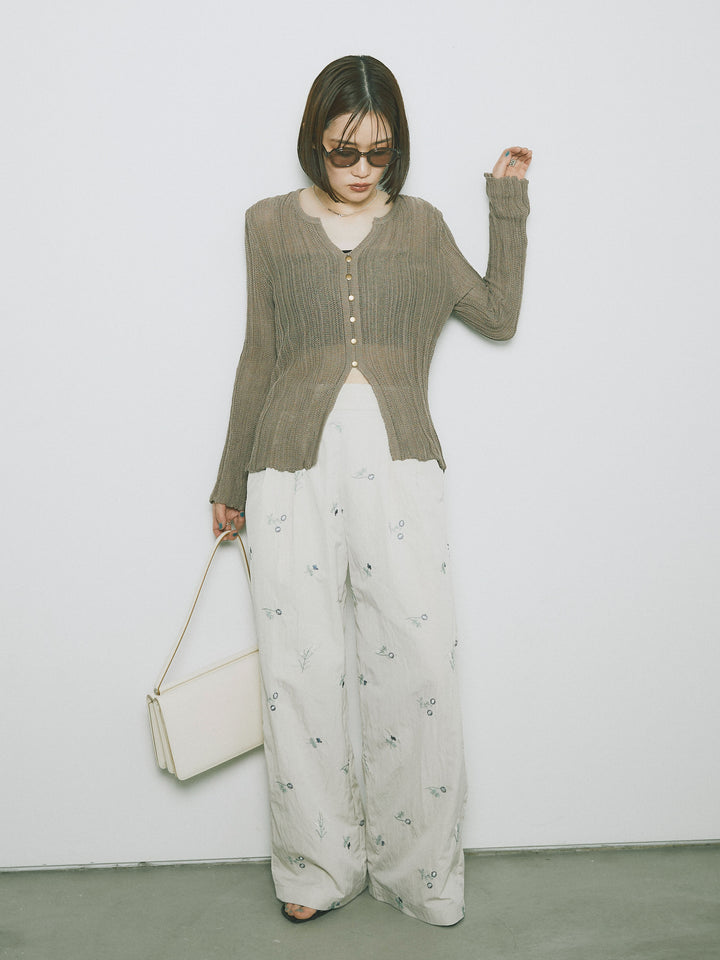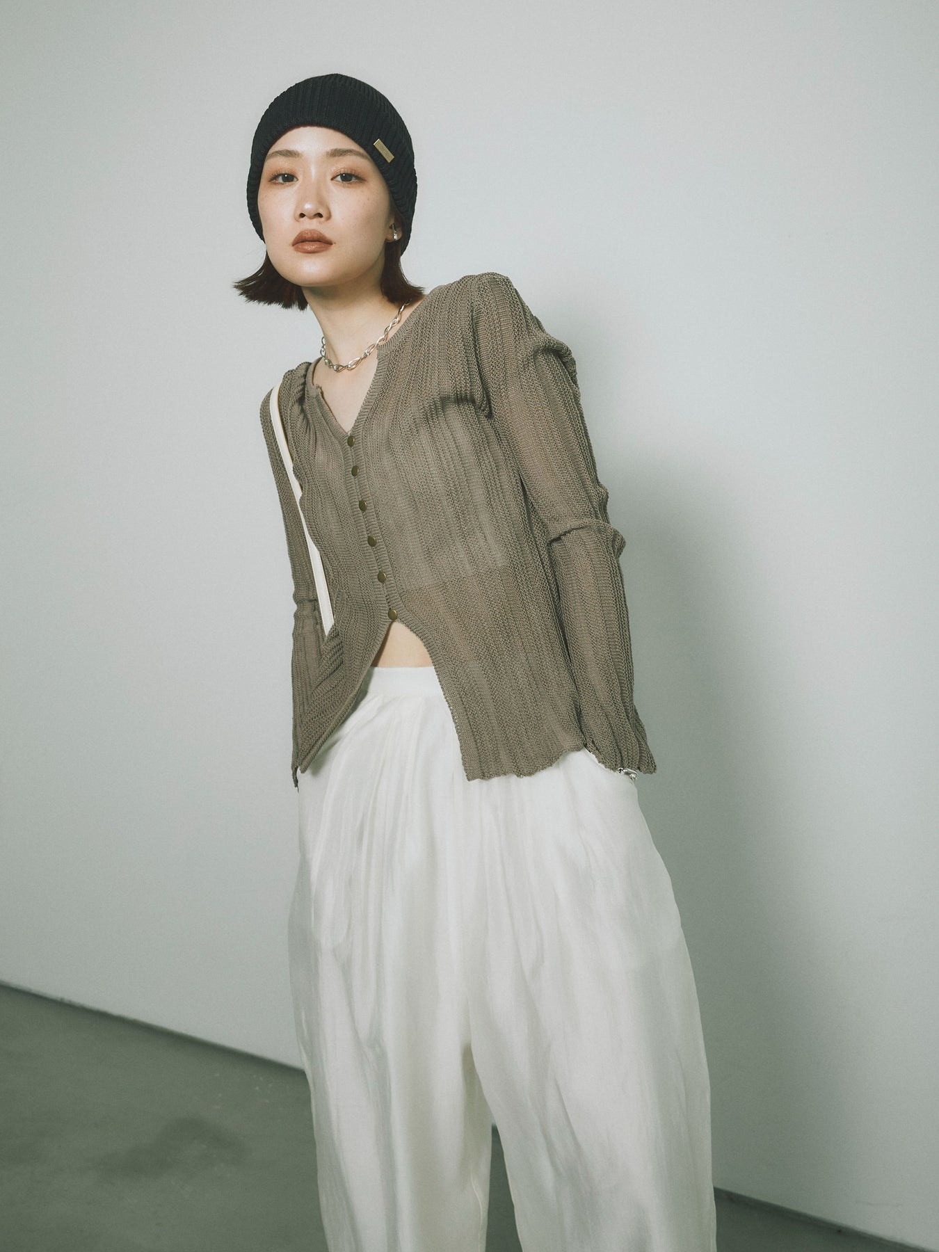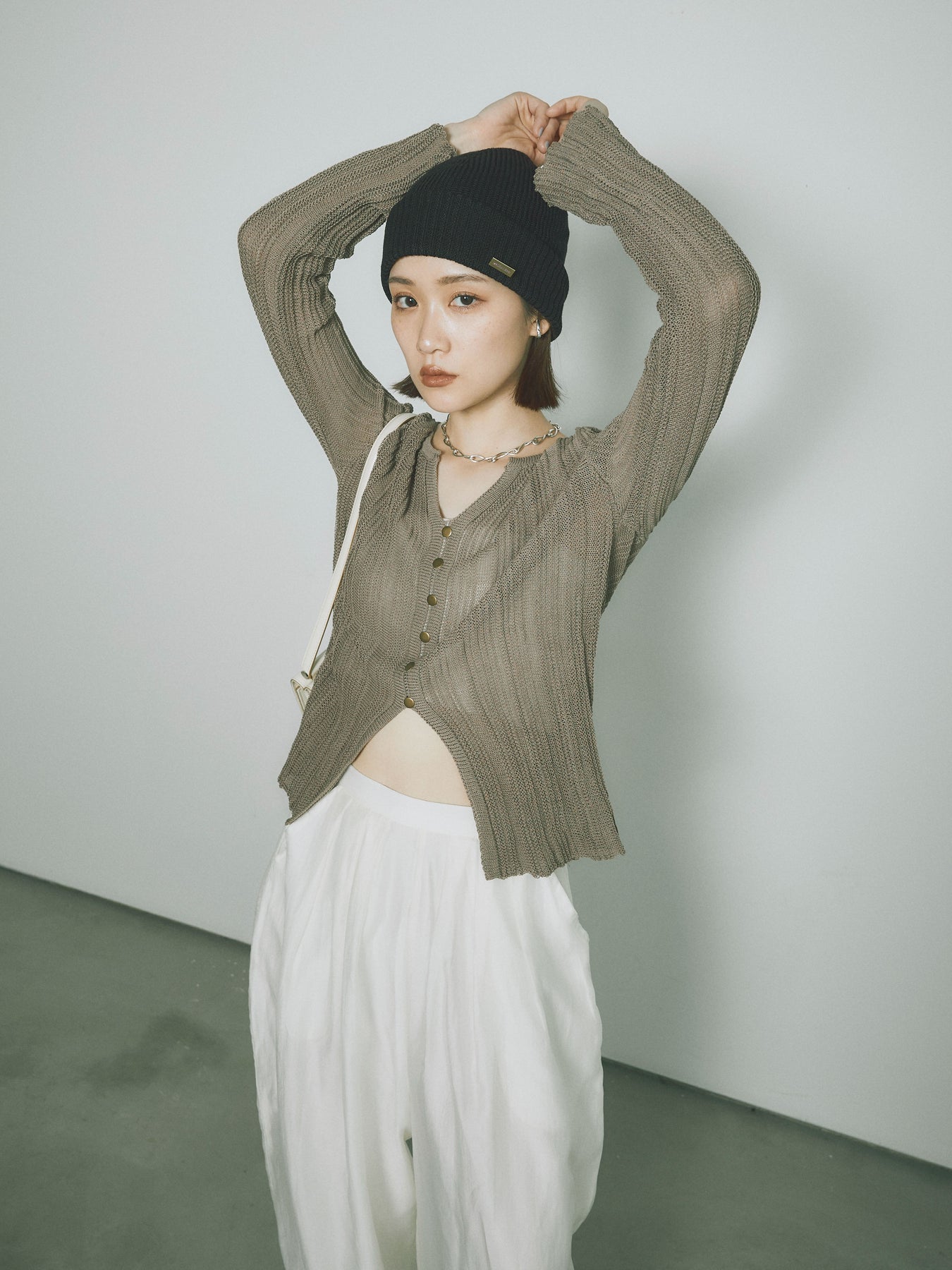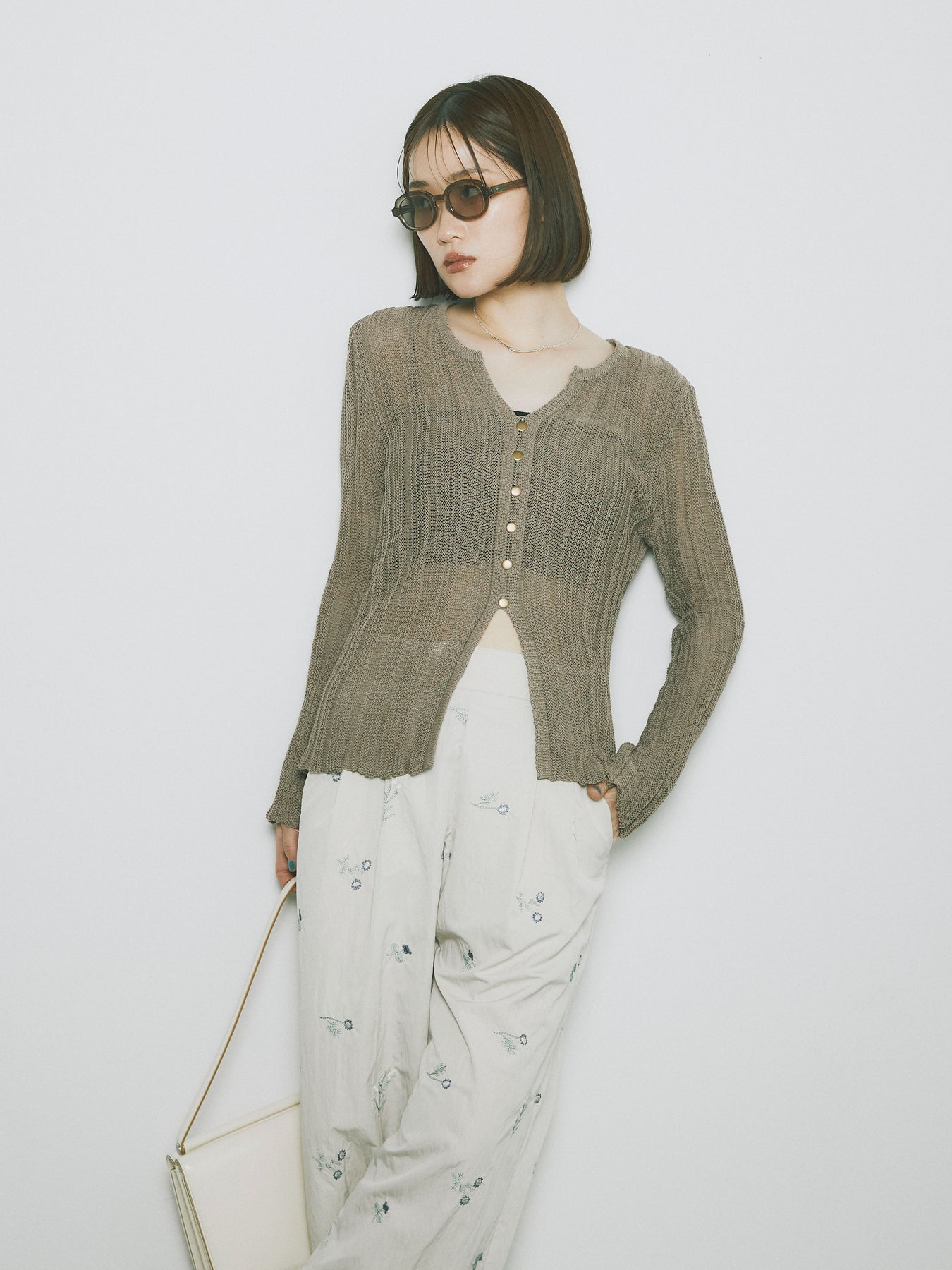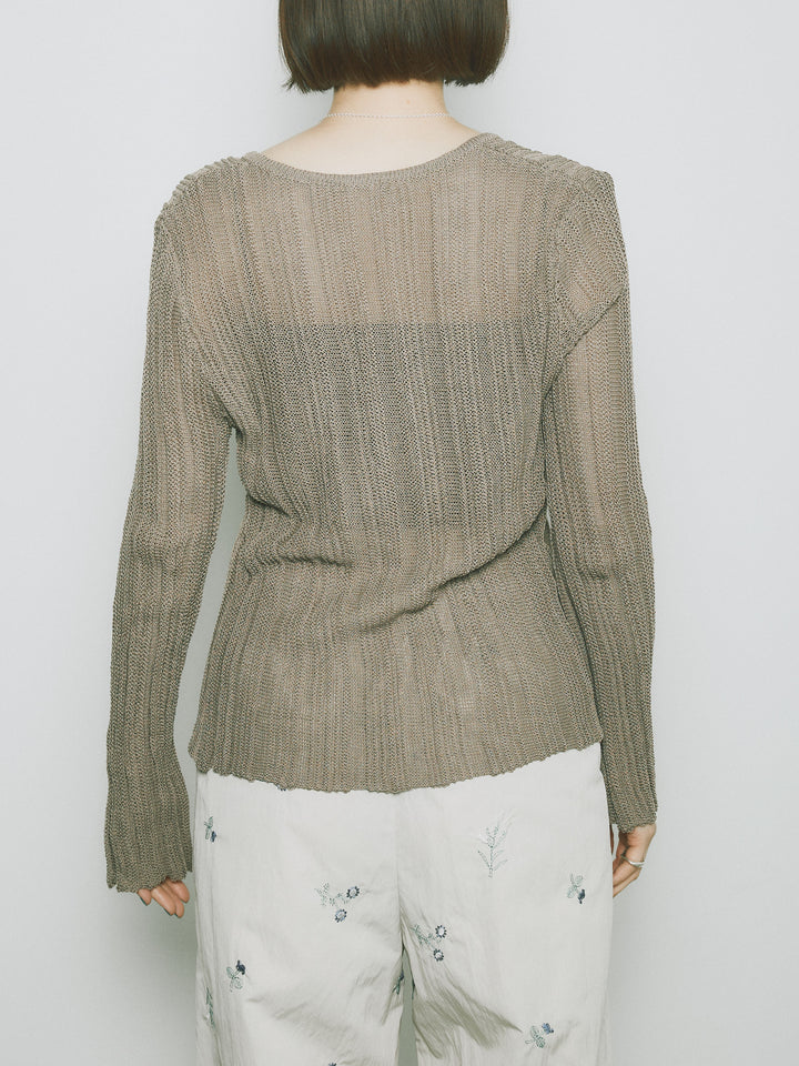 [予約]フロントスリットフロントボタンニットトップス/グレージュ
