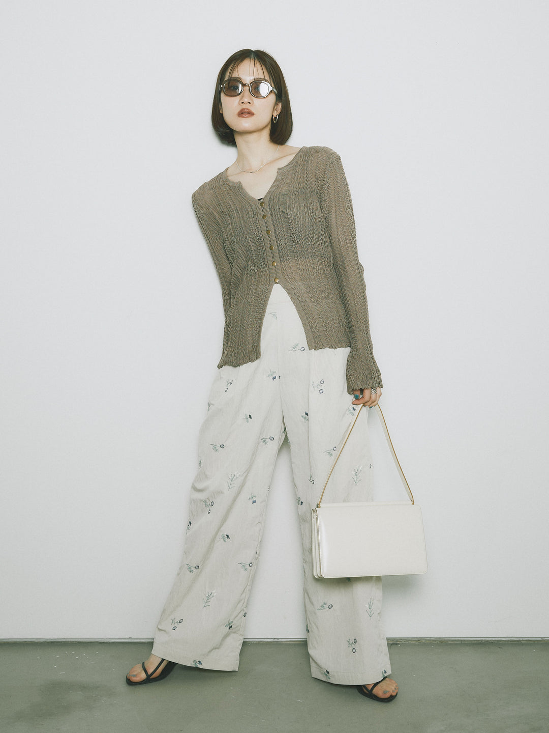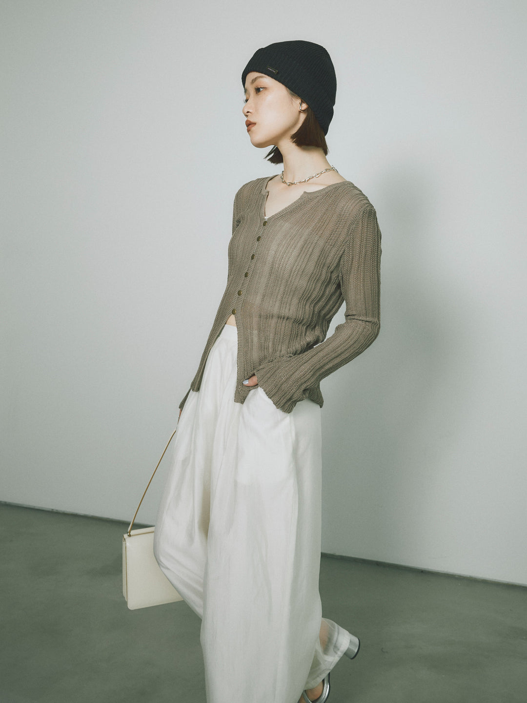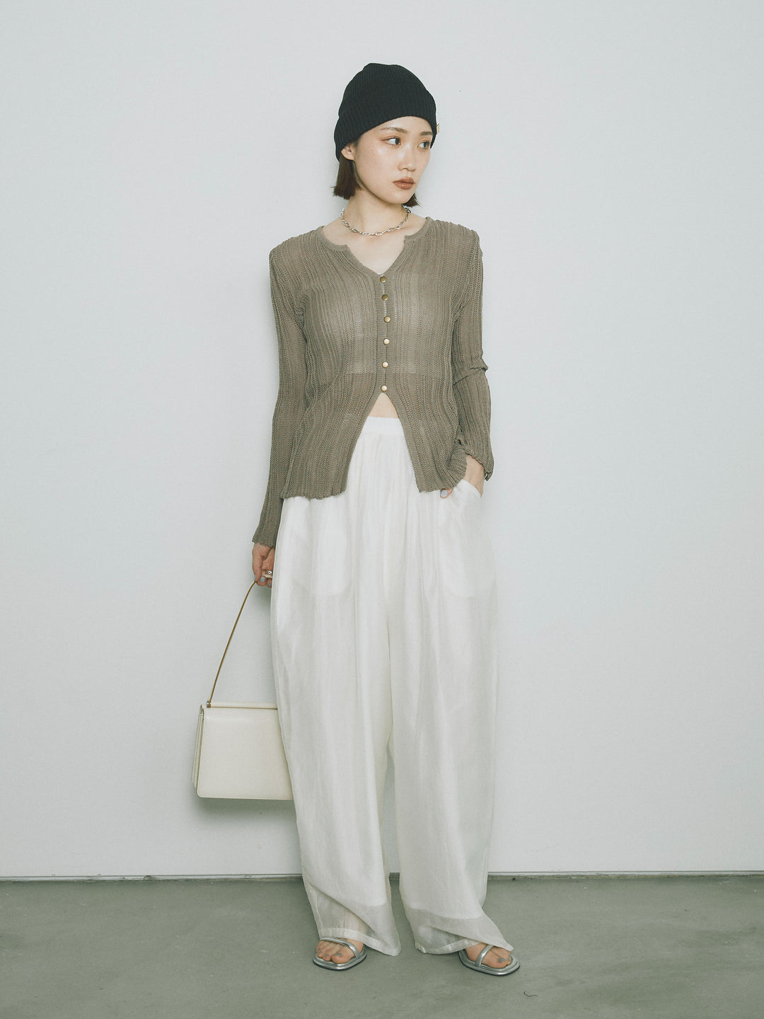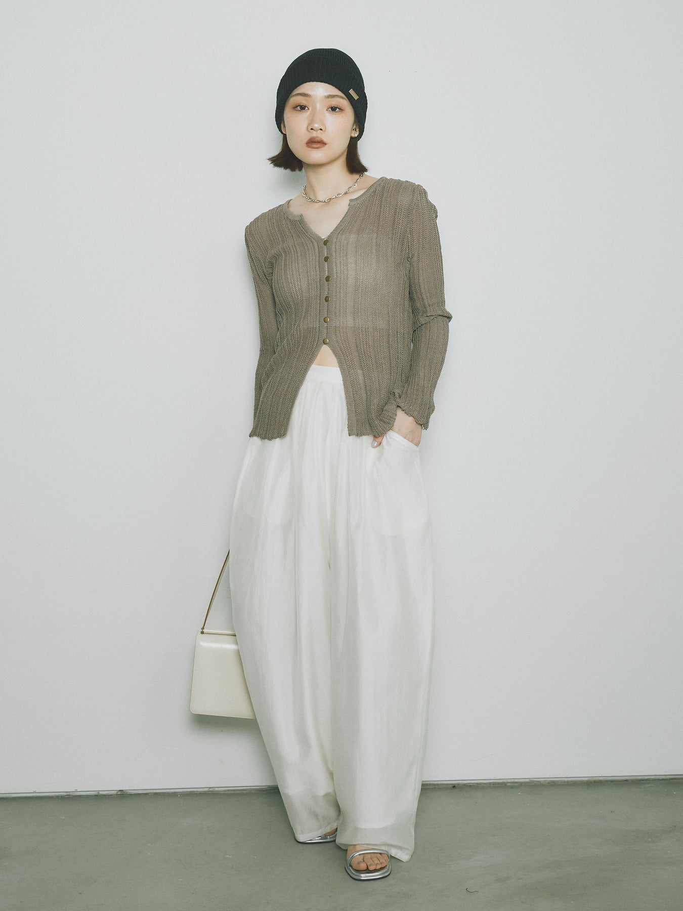 [予約]フロントスリットフロントボタンニットトップス/グレージュ