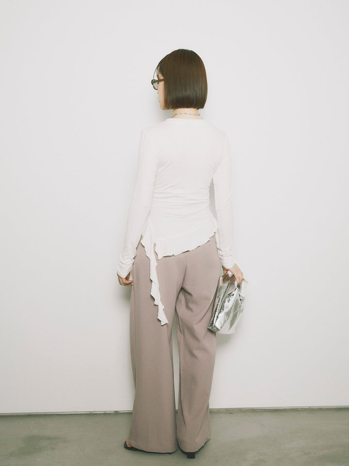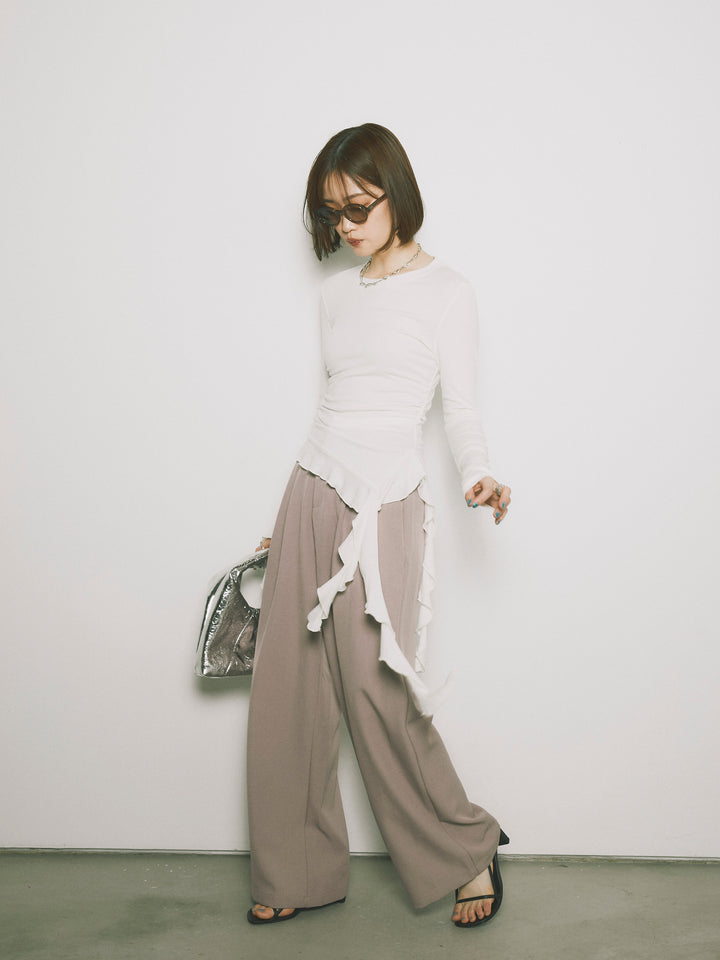 【商品について】立体感のあるマーベルト仕様が、腰まわりをすっきりと見せてくれるトレンド感満載のワイドパンツ。フロントに入ったタックが美しいドレープを生み出し、動くたびに表情の出る一本。きれいめなブラウスからカジュアルなトップスまで、幅広いスタイリングにマッチします。オンオフ問わず活躍する万能アイテムです。
