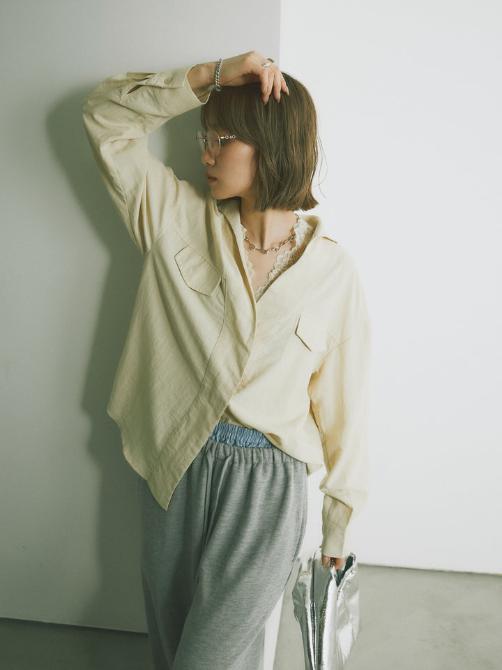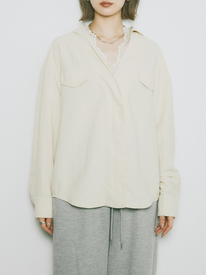 フロント部分にレースをあしらった、フェミニンでエレガントな開襟シャツ。シャツのシンプルなデザインにレースのディテールが加わり、華やかさを演出します。軽やかな素材で、春夏にぴったりのアイテム。カジュアルにもきれいめにも着こなせる万能シャツです。 ※ボトムス、キャミソール(インナー)以外の商品は一律でインナーは付属していません。