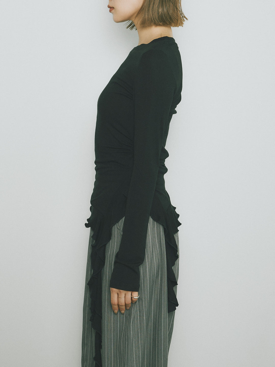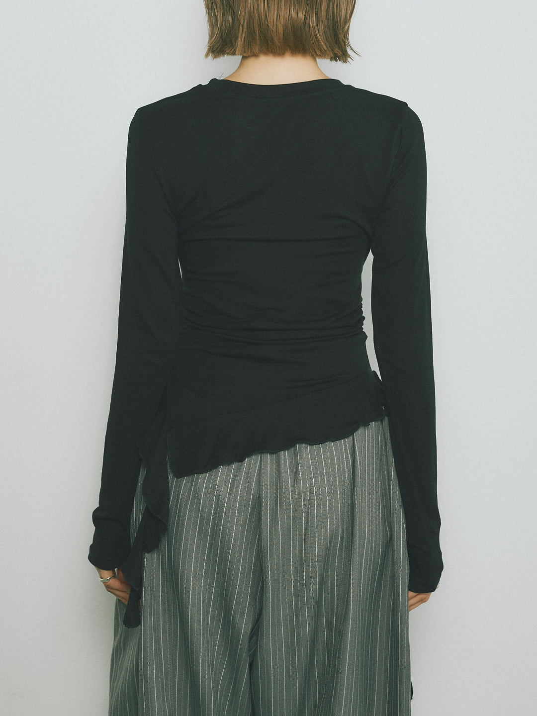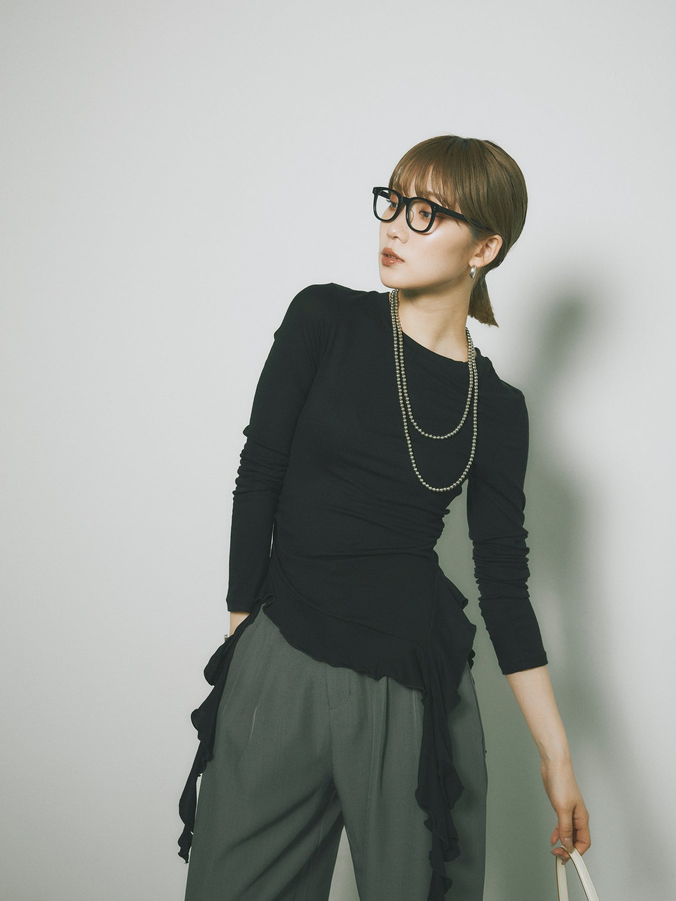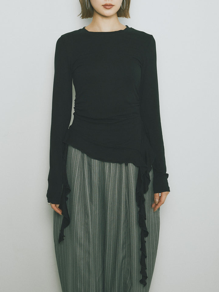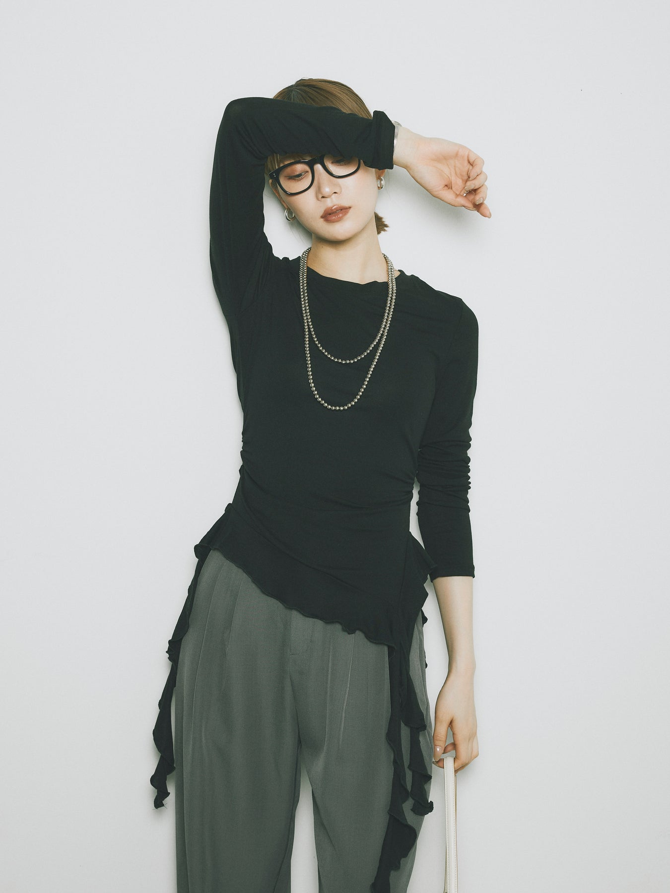 アシンメトリーに施されたラッフルデザインが目を引く、トレンド感たっぷりの一枚。ボディラインに優しくフィットするシルエットで、女性らしさを引き立てながらもラフな着心地を叶えます。カットソー感覚でデイリーに使いやすく、パンツにもスカートにも合わせやすい万能アイテムです。 ※ボトムス、キャミソール(インナー)以外の商品は一律でインナーは付属していません