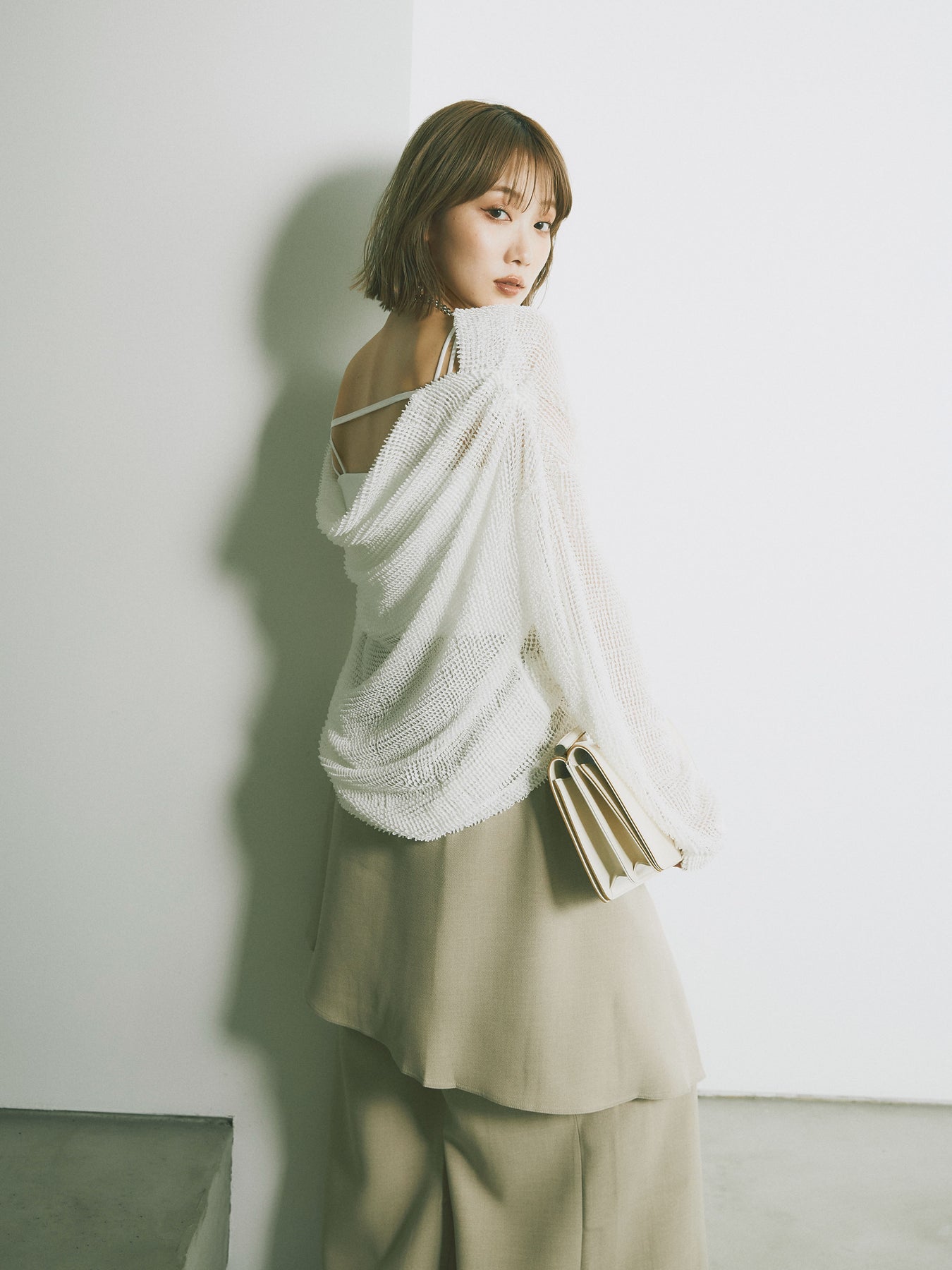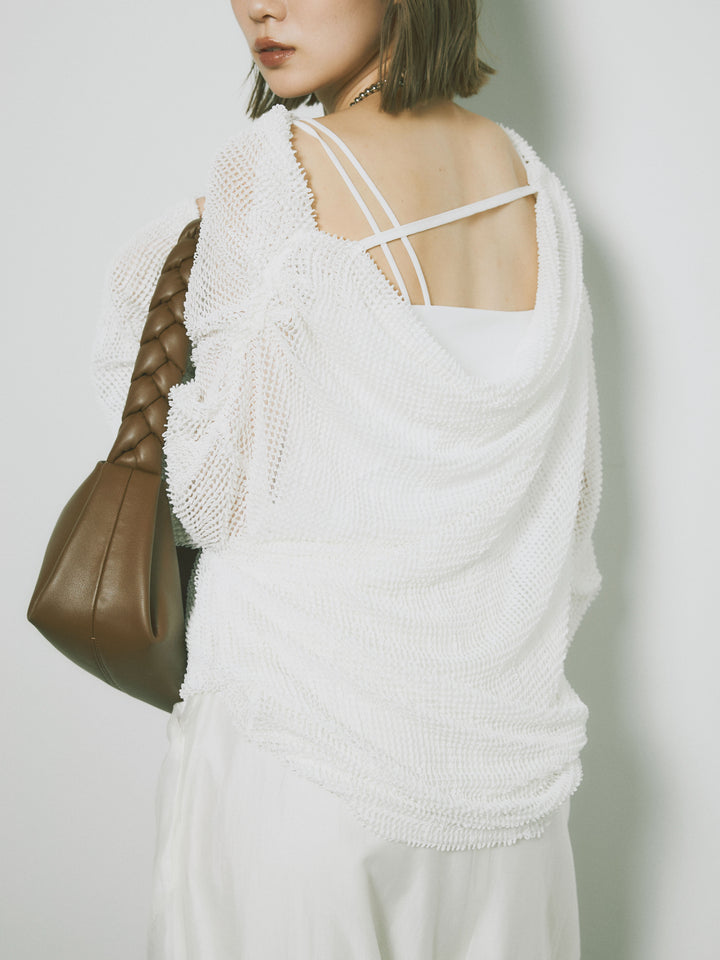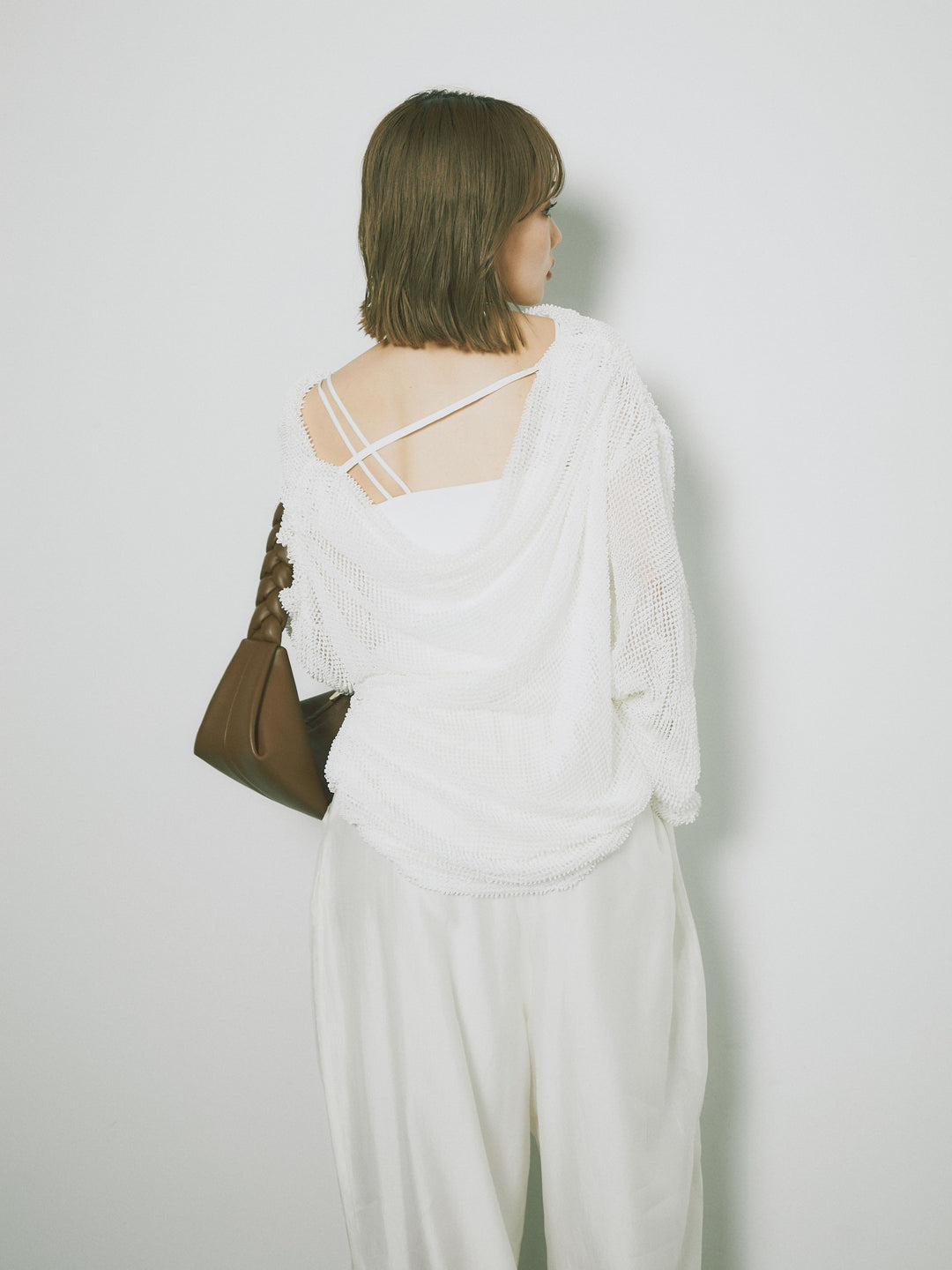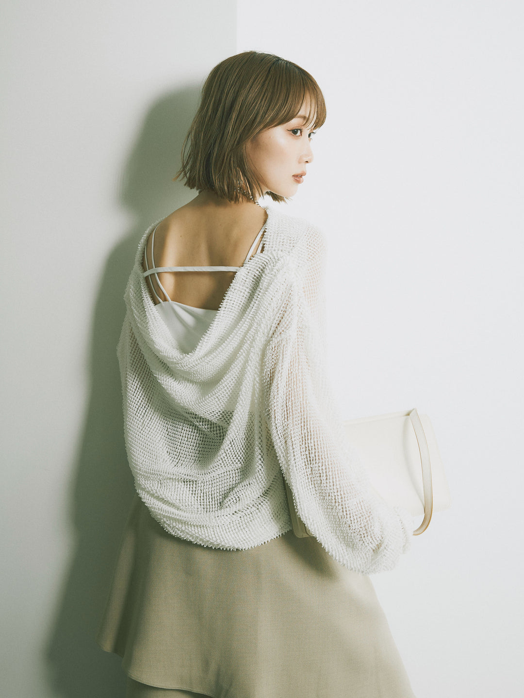 涼しげで軽やかな印象を与える、バックドレープデザインのメッシュプルオーバー。透け感のあるメッシュ素材が夏にぴったりで、動きに合わせて美しいドレープが魅力的です。シンプルなデザインながら、背中のドレープがアクセントとなり、個性的なスタイルを演出します。シーズンを通して様々なコーディネートに活躍します。 ※ボトムス、キャミソール(インナー)以外の商品は一律でインナーは付属していません。