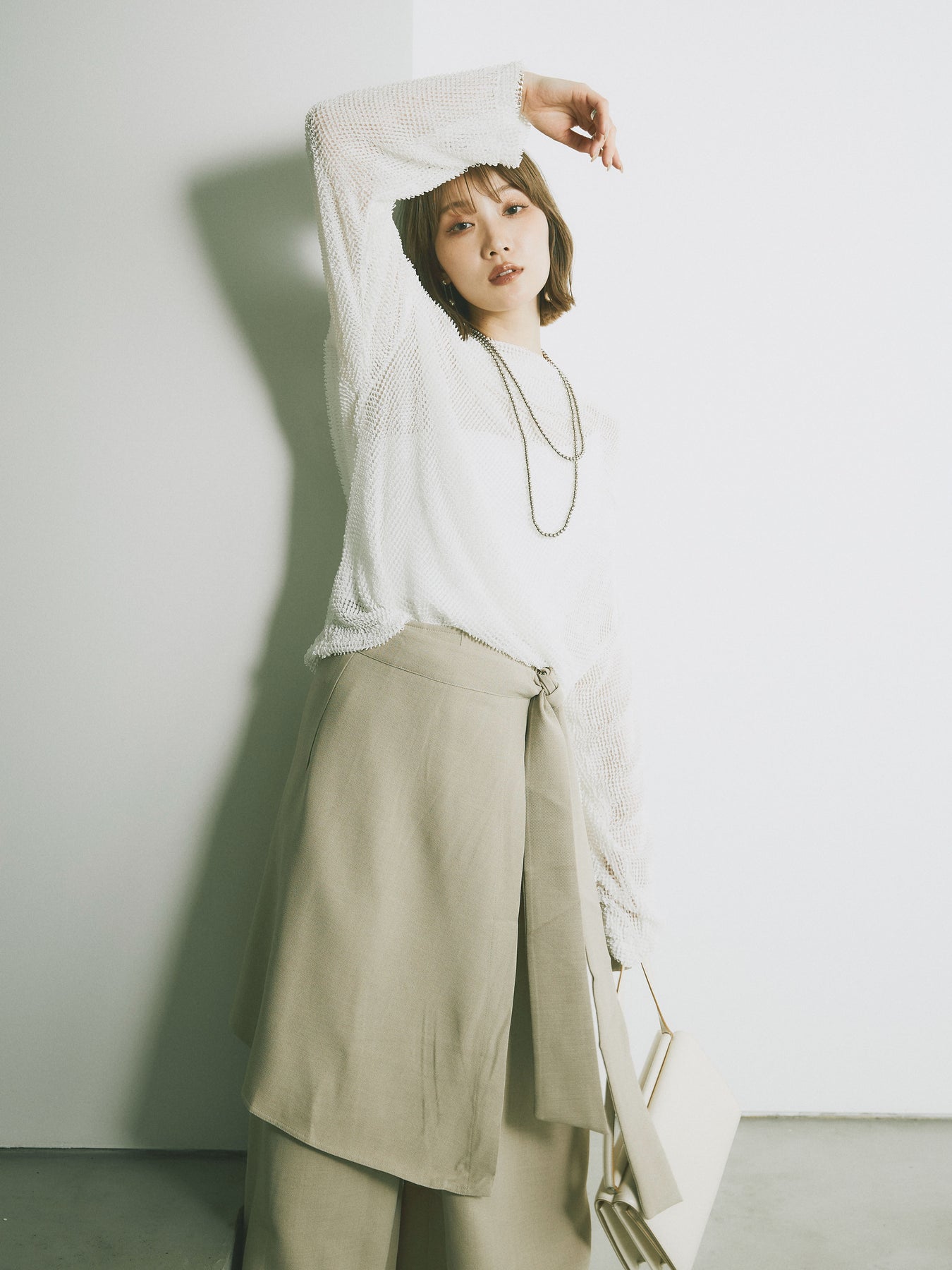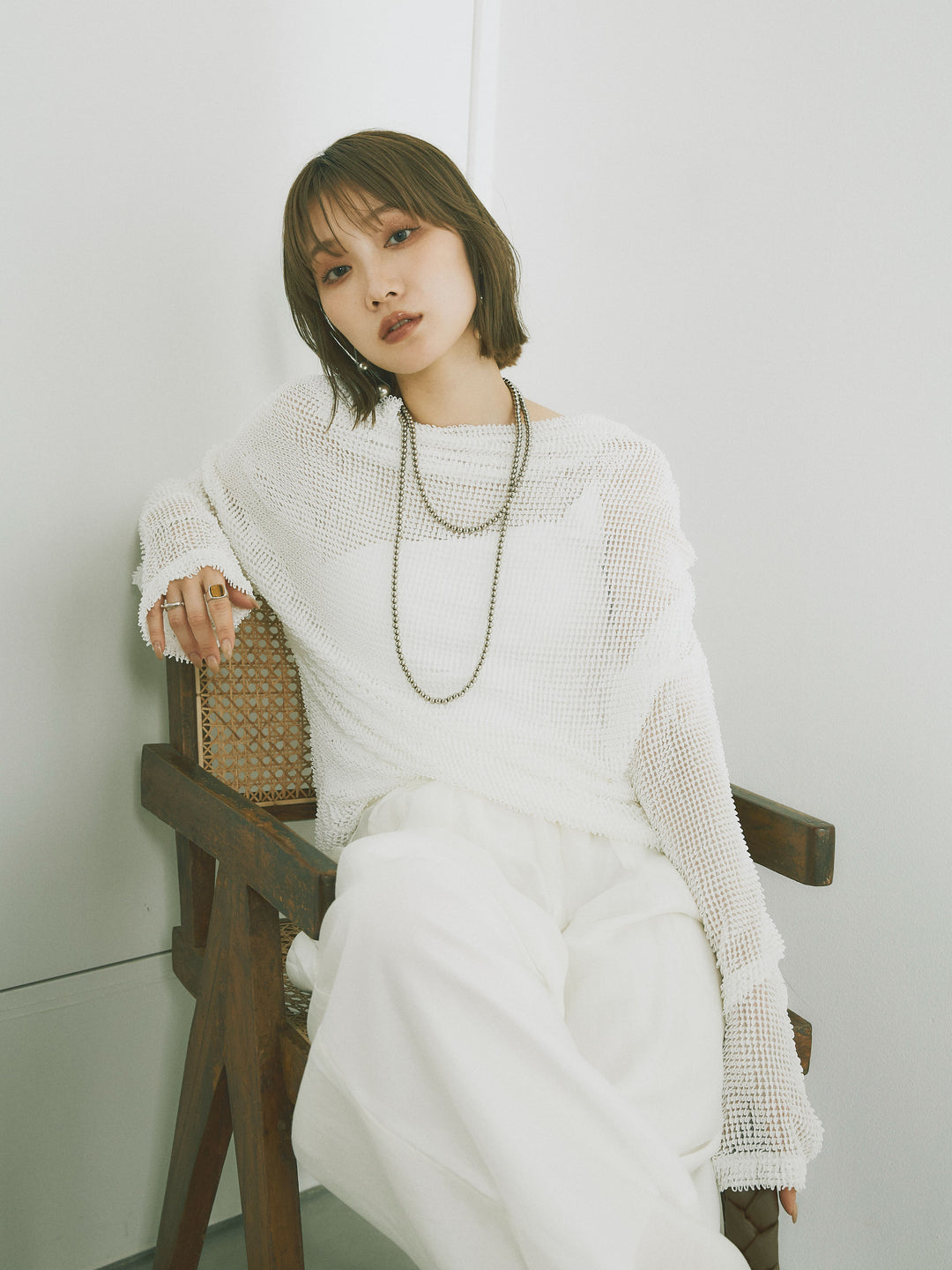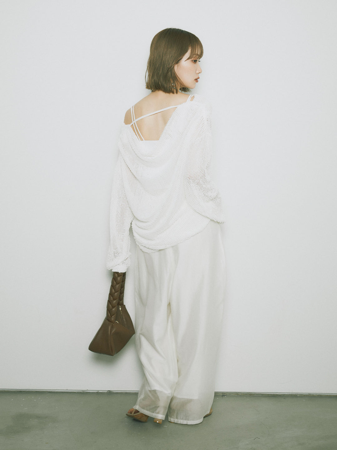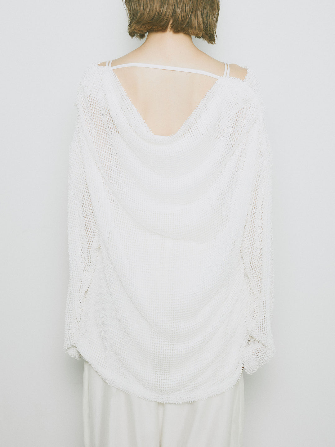 涼しげで軽やかな印象を与える、バックドレープデザインのメッシュプルオーバー。透け感のあるメッシュ素材が夏にぴったりで、動きに合わせて美しいドレープが魅力的です。シンプルなデザインながら、背中のドレープがアクセントとなり、個性的なスタイルを演出します。シーズンを通して様々なコーディネートに活躍します。 ※ボトムス、キャミソール(インナー)以外の商品は一律でインナーは付属していません。