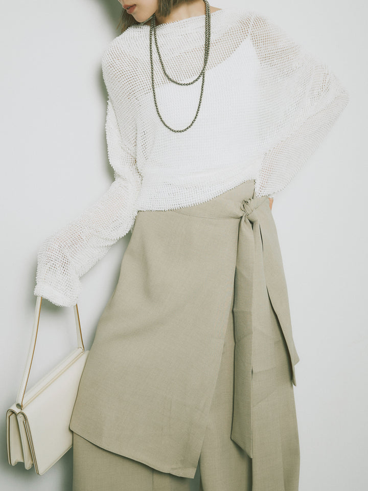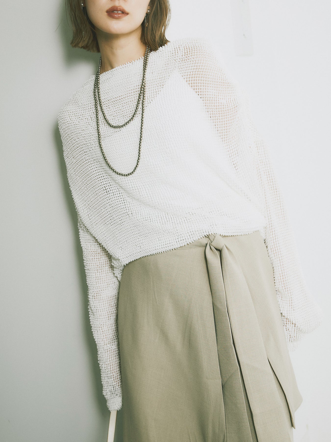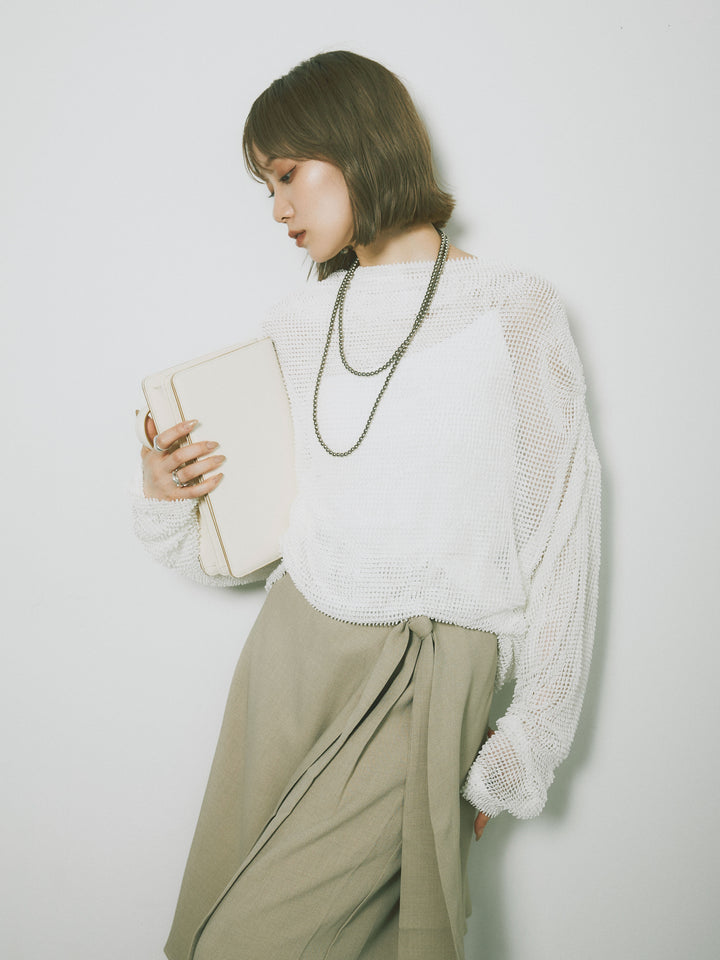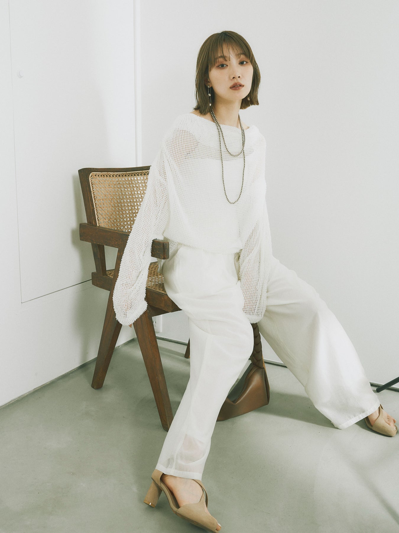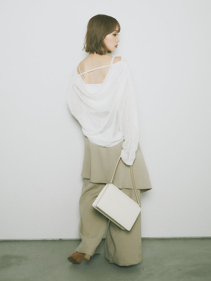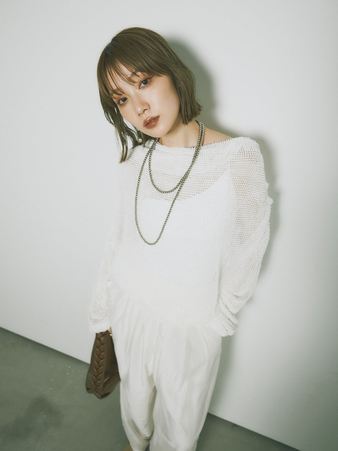 涼しげで軽やかな印象を与える、バックドレープデザインのメッシュプルオーバー。透け感のあるメッシュ素材が夏にぴったりで、動きに合わせて美しいドレープが魅力的です。シンプルなデザインながら、背中のドレープがアクセントとなり、個性的なスタイルを演出します。シーズンを通して様々なコーディネートに活躍します。 ※ボトムス、キャミソール(インナー)以外の商品は一律でインナーは付属していません。