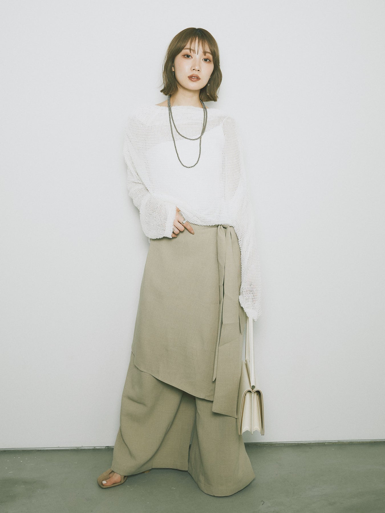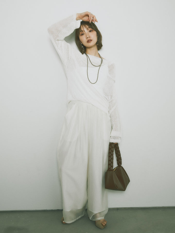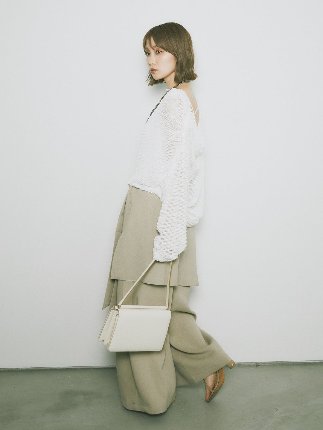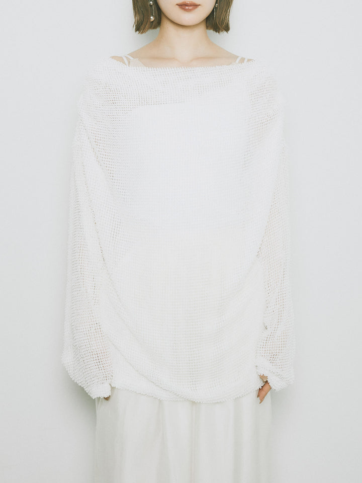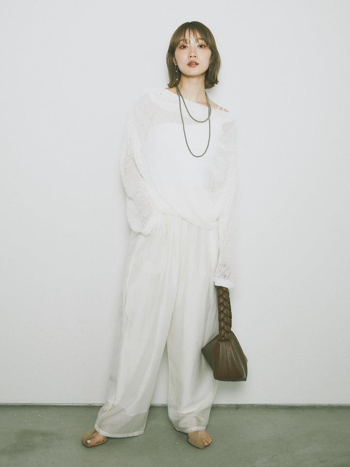 涼しげで軽やかな印象を与える、バックドレープデザインのメッシュプルオーバー。透け感のあるメッシュ素材が夏にぴったりで、動きに合わせて美しいドレープが魅力的です。シンプルなデザインながら、背中のドレープがアクセントとなり、個性的なスタイルを演出します。シーズンを通して様々なコーディネートに活躍します。 ※ボトムス、キャミソール(インナー)以外の商品は一律でインナーは付属していません。