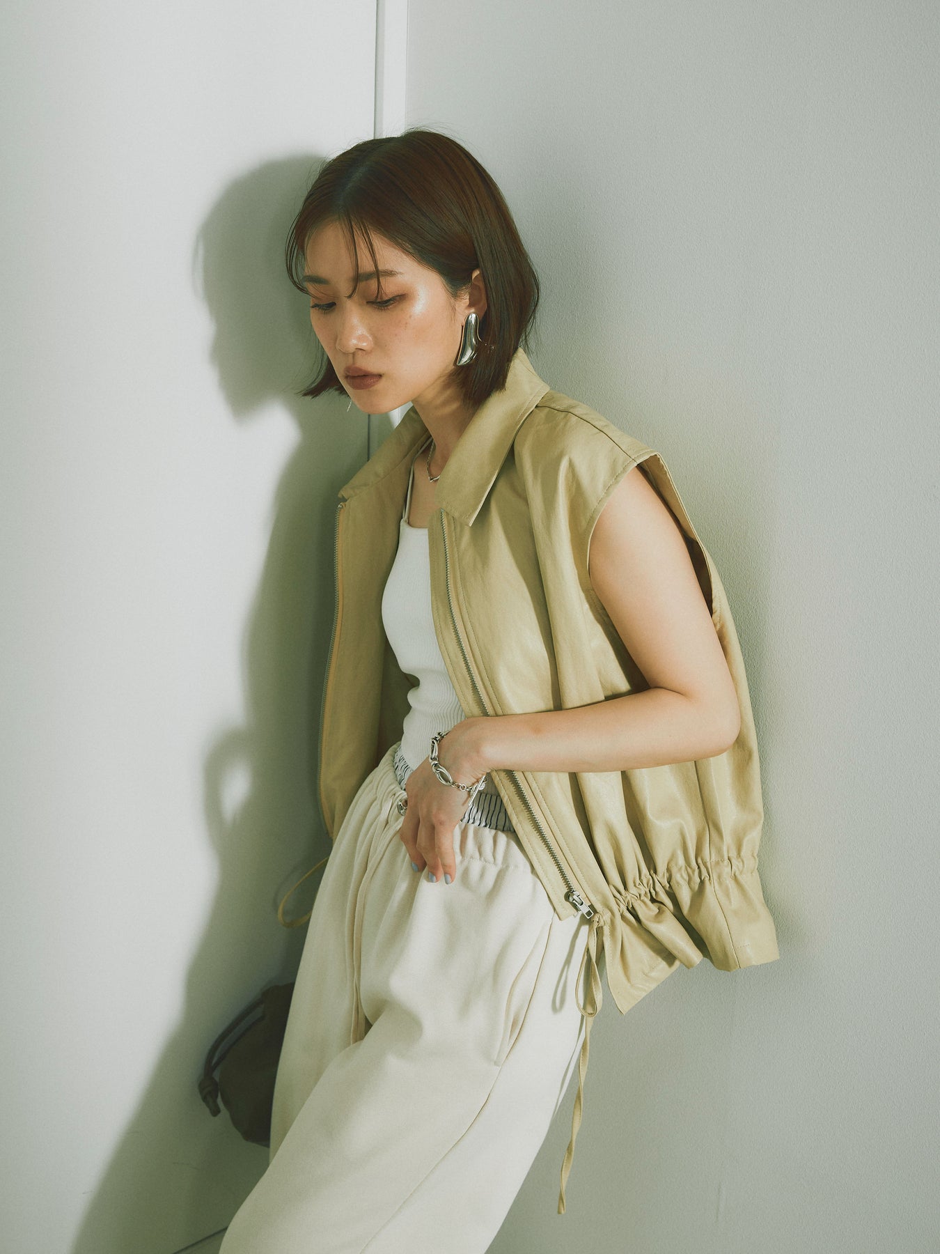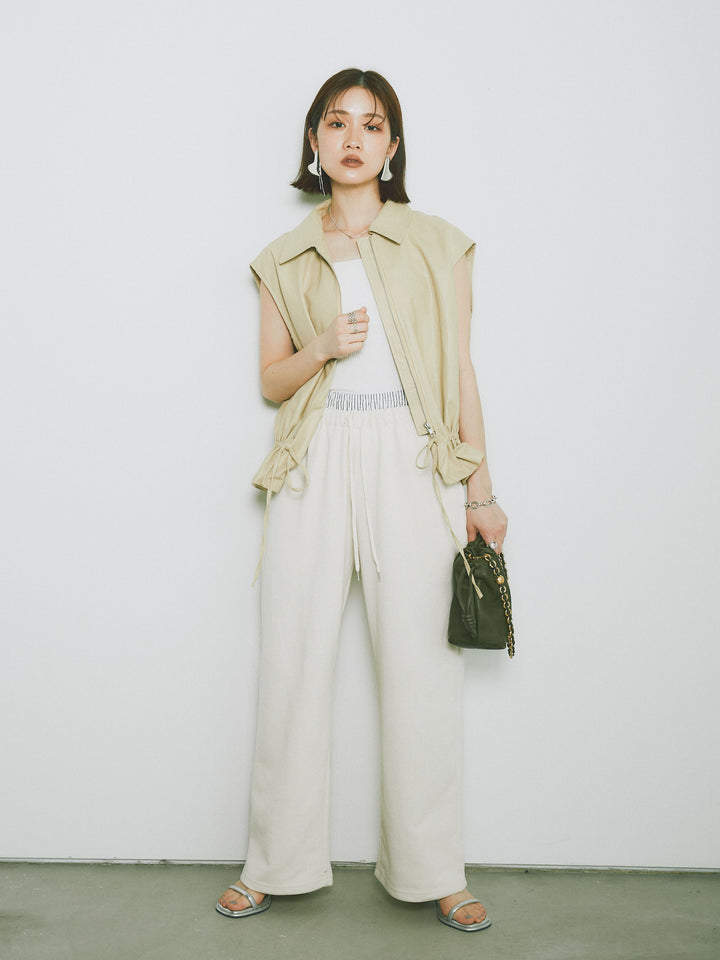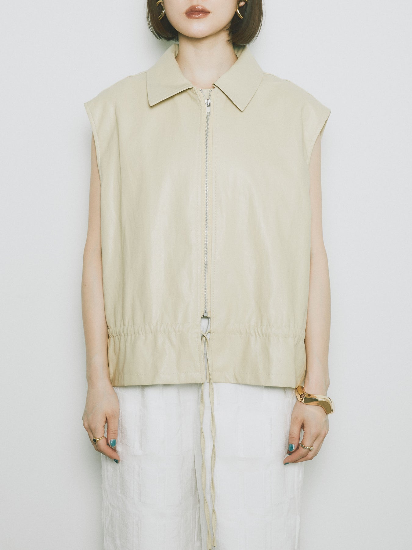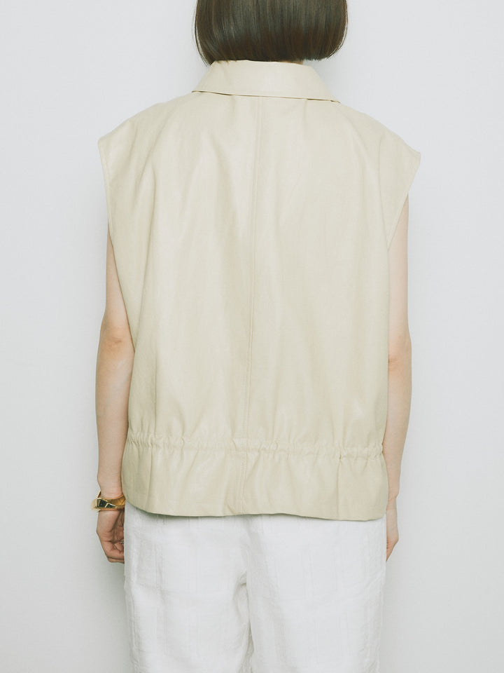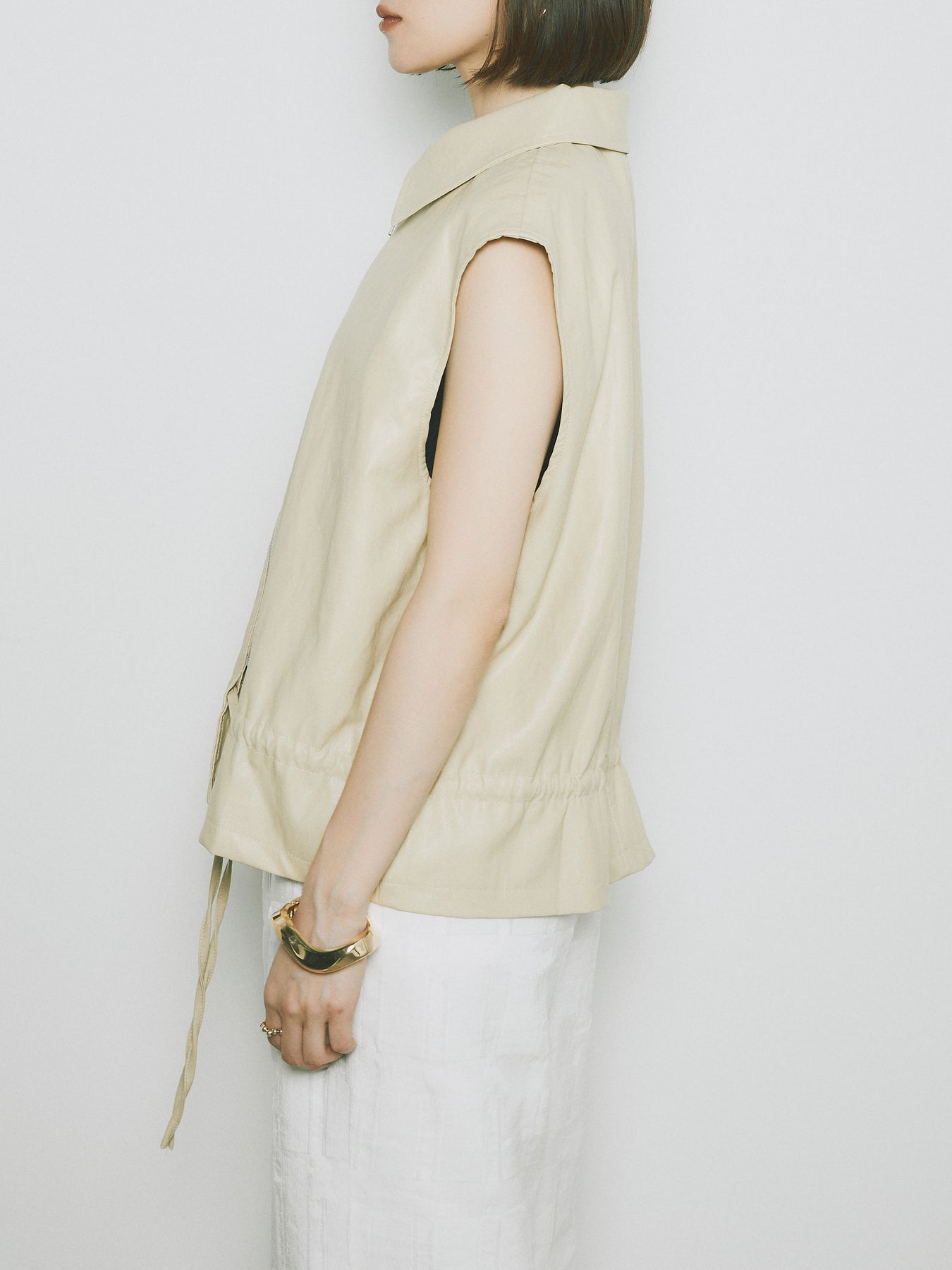 スタイリッシュでありながら、軽やかな着心地を提供するフェイクレザーノースリーブジャケット。シンプルなデザインに加えて、ウエスト部分のドローコードでシルエットを調整できるため、さまざまな体型にフィットします。ファスナー付きで、カジュアルにもエレガントにもコーディネートが可能。秋冬の重ね着にぴったりなアイテムです。 ※ボトムス、キャミソール(インナー)以外の商品は一律でインナーは付属していません。